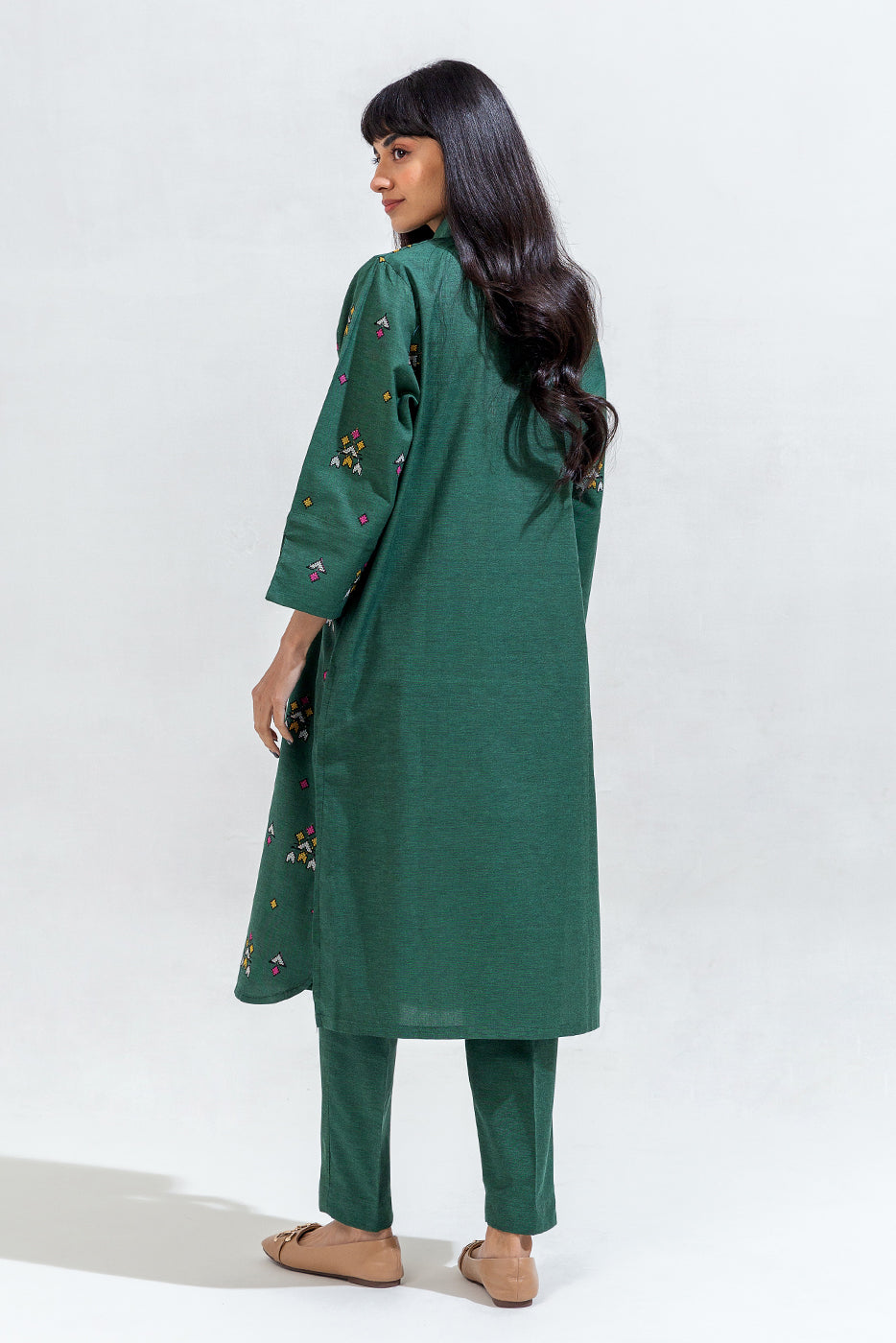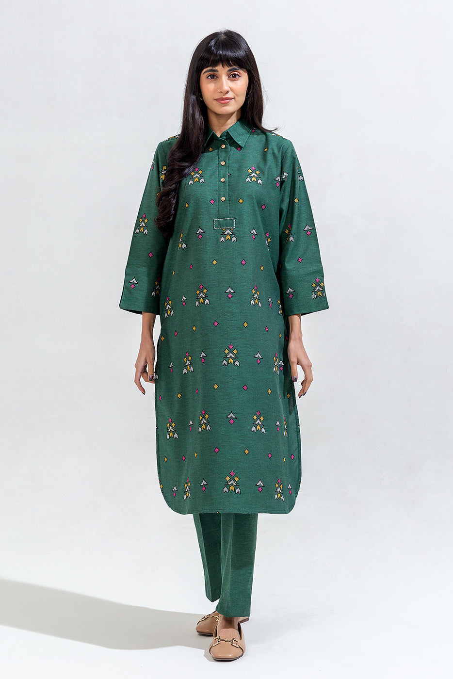 description: embroidered shirt with basic collar and placket with buttons and contrasting top stitch detail, and embroidered sleeves with cuff with slit detail. paired with straight pants to complete the look. fabric: chambray what you'll get: shirt+pant fit: casual fit size & fit: model height is 5'6" model is wearing 8 size