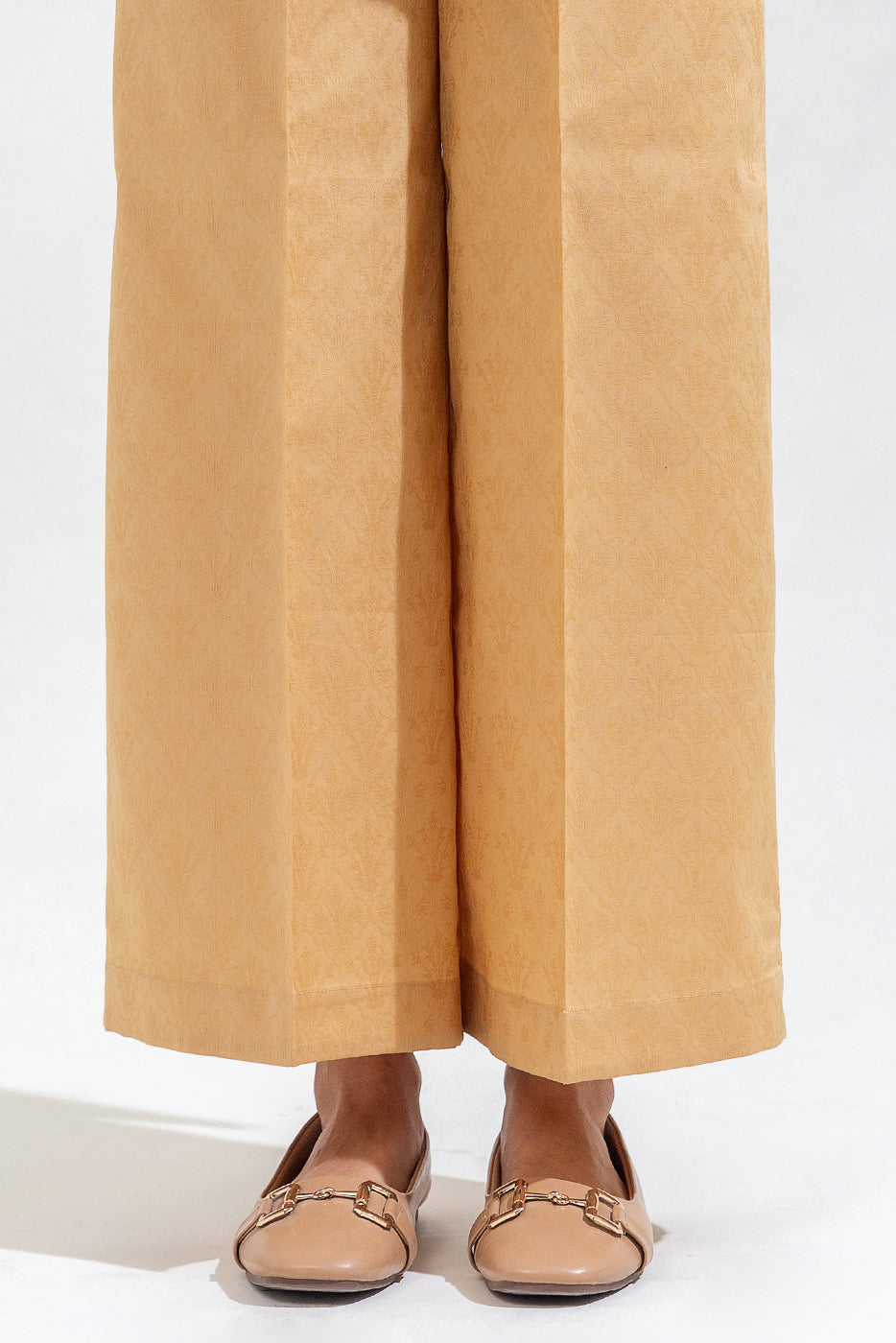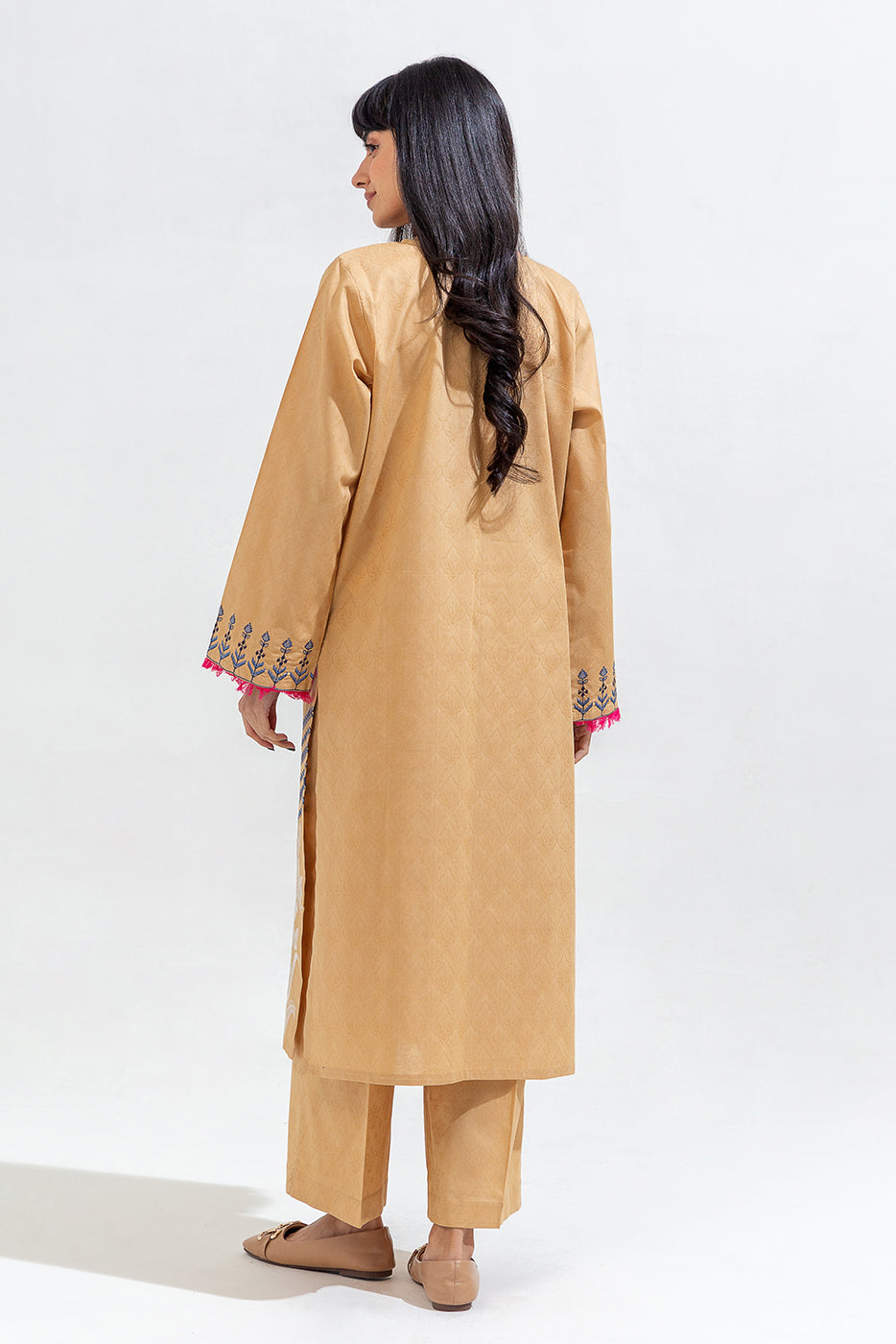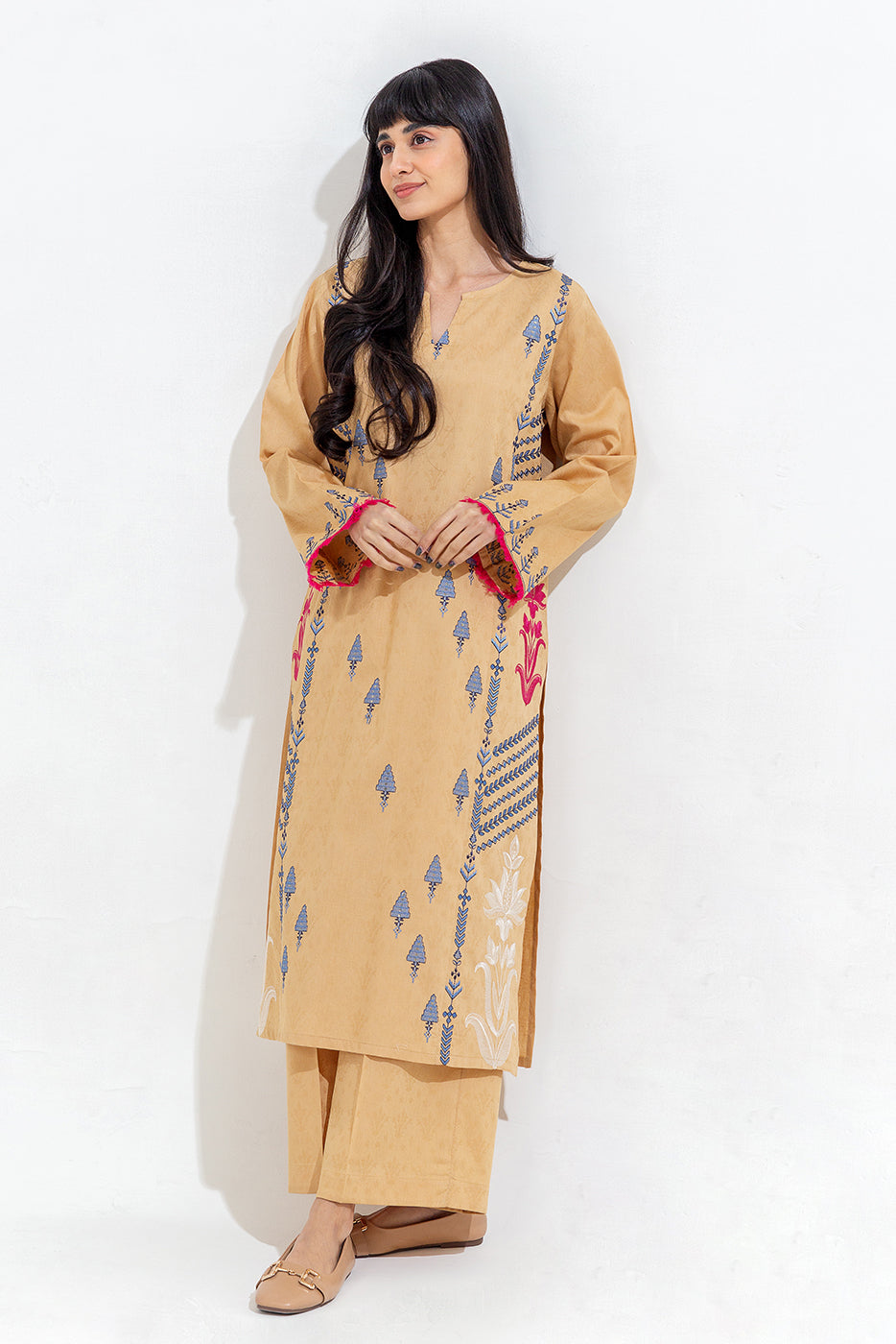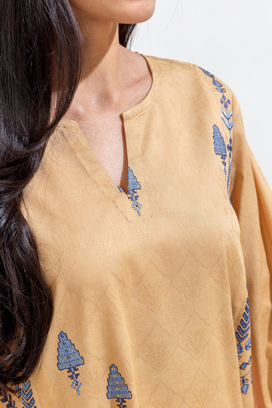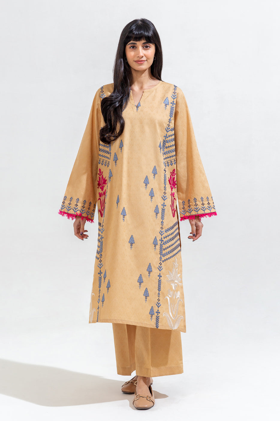 description: embroidered shirt with round neckline and slit and contrasting frayed edging detail on sleeves. paired with culotte pants to complete the look. fabric: cambric jacquard what you'll get: shirt+pant fit: casual fit size & fit: model height is 5'6" model is wearing 8 size