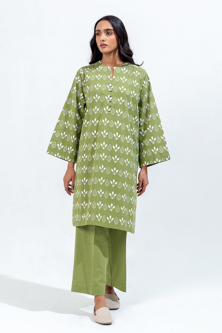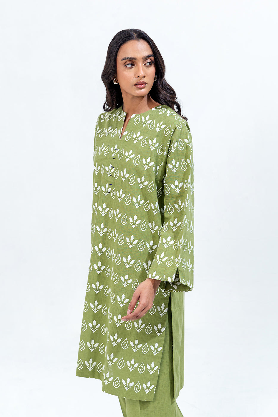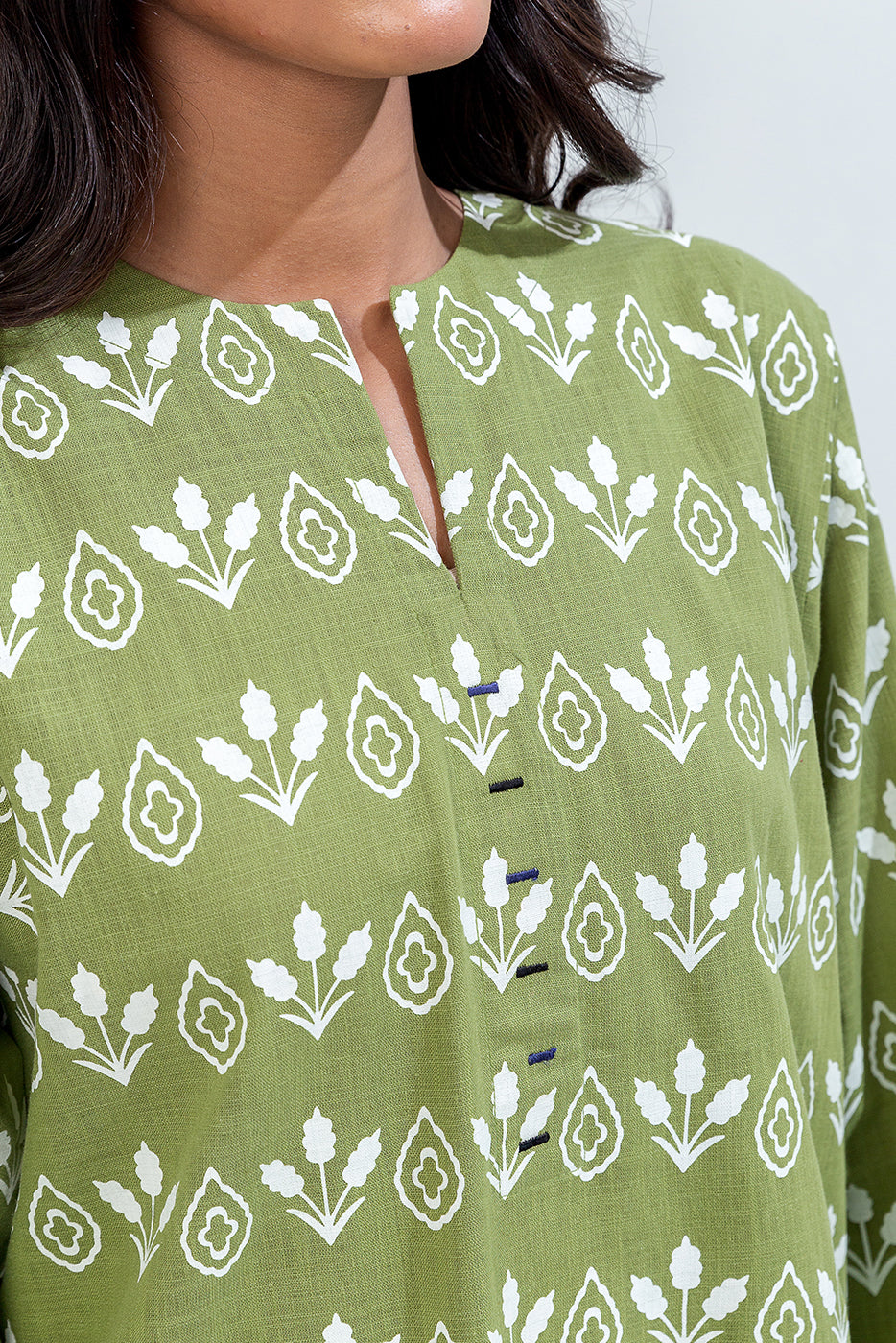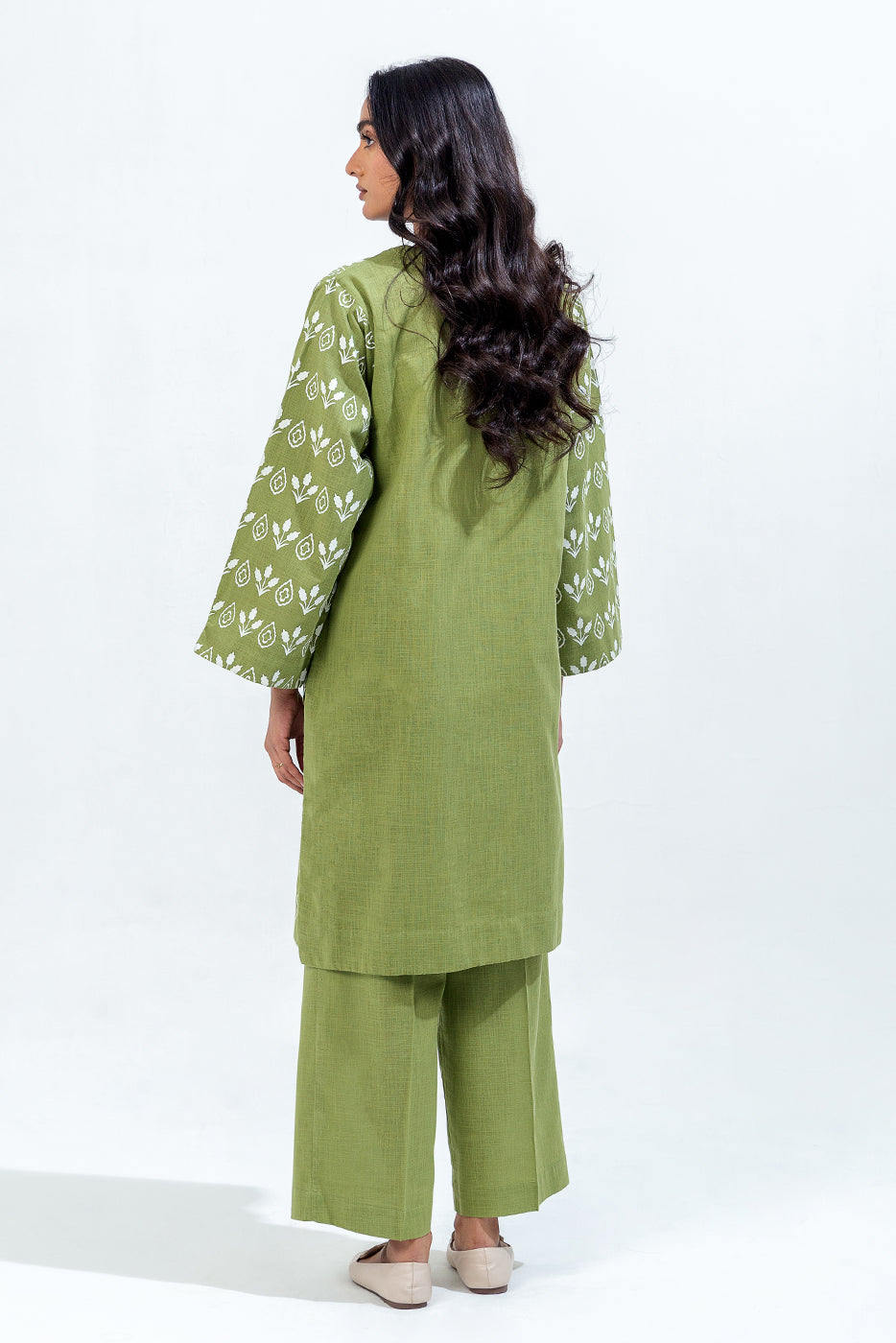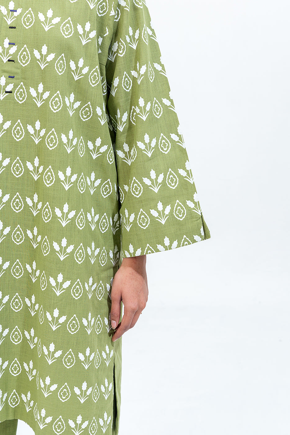 description: basic screen printed shirt with round neckline and placket with contrasting stitch detail. paired with loose straight pants to complete the look. fabric: two way slub what you'll get: shirt+pant fit: casual fit size & fit: model height is 5'6" model is wearing 8 size
