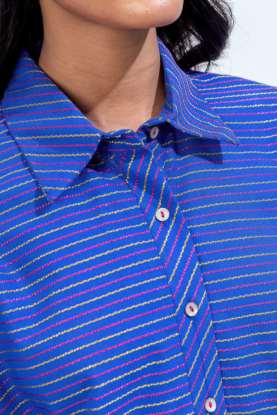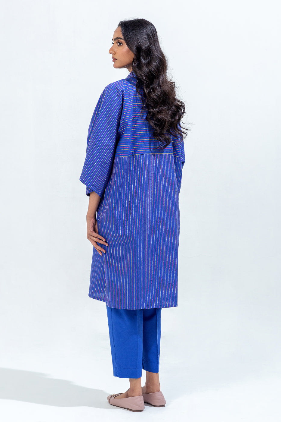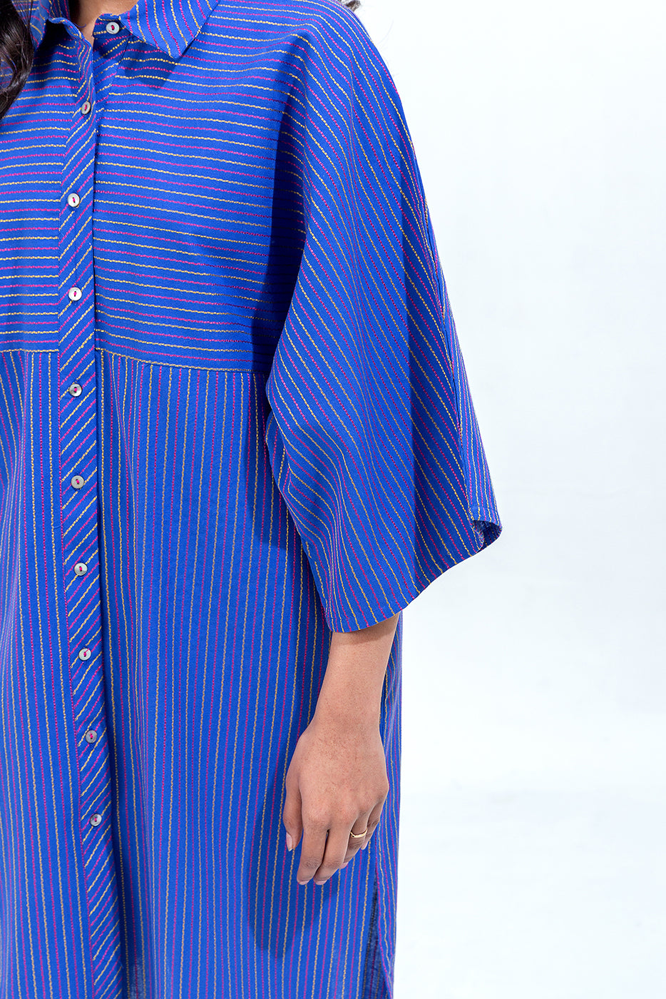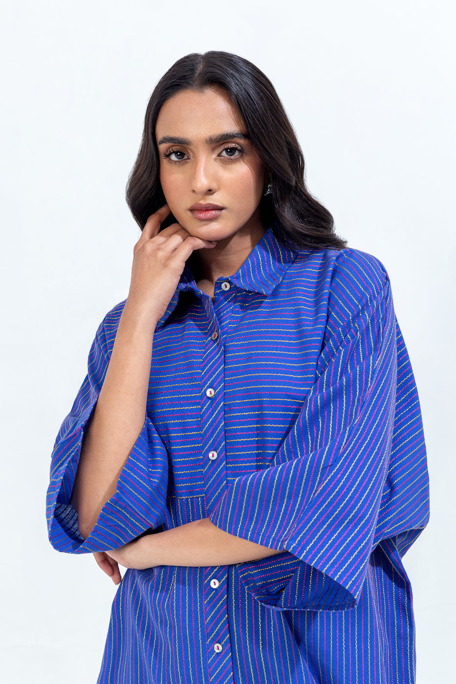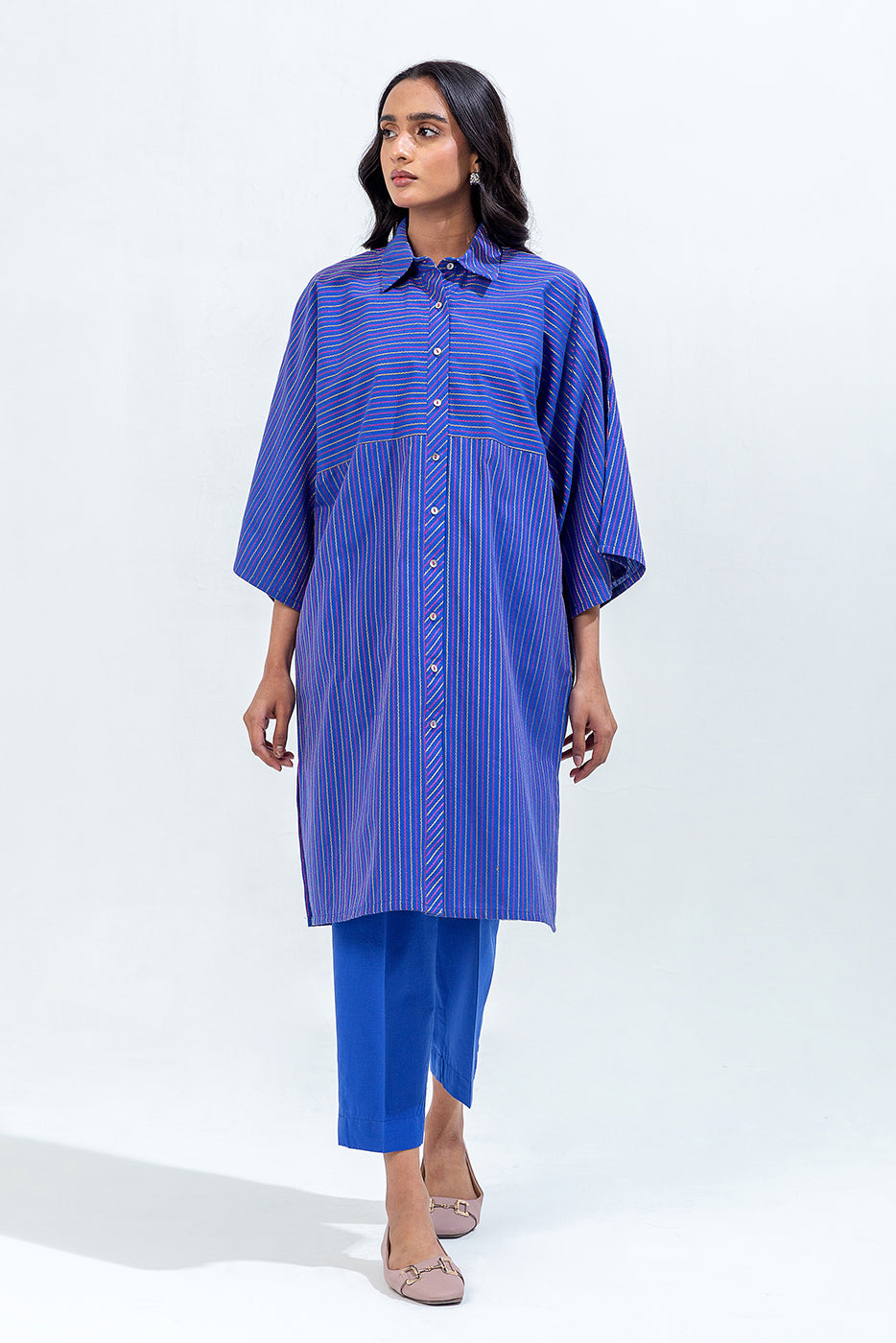 description: special fit batwing sleeves shirt with basic collar and button down placket. paired with straight pants to complete the look. fabric: yarn dyed what you'll get: shirt+pant fit: casual fit size & fit: model height is 5'6" model is wearing 8 size
