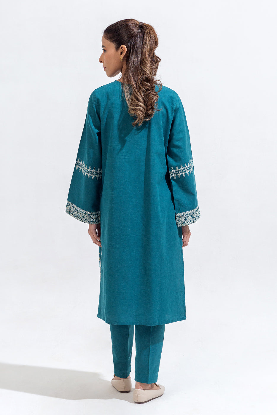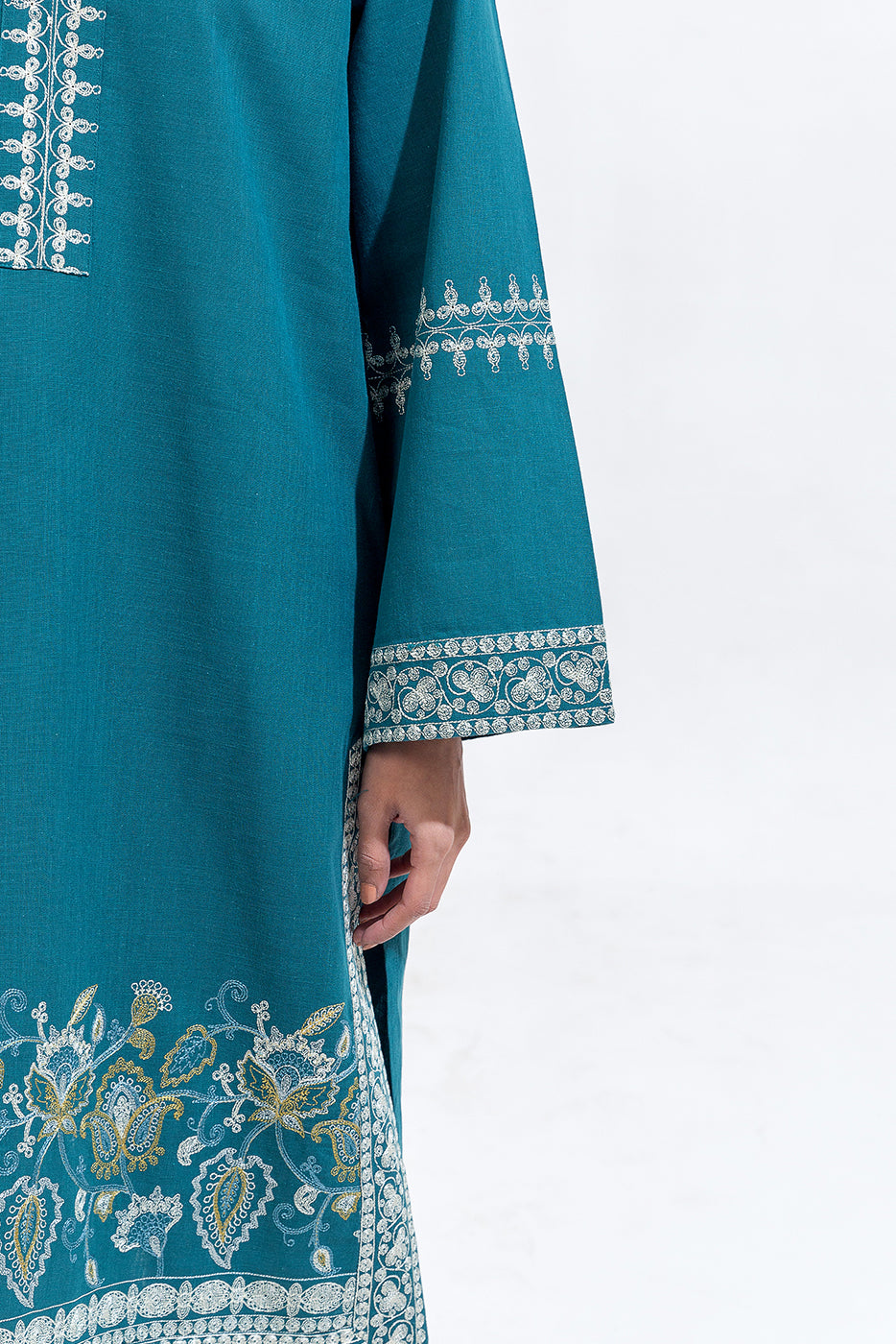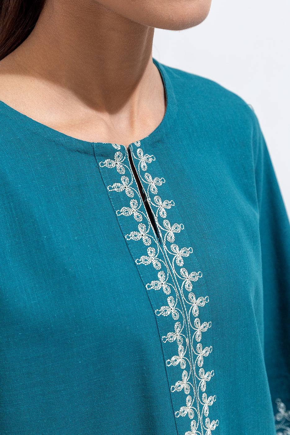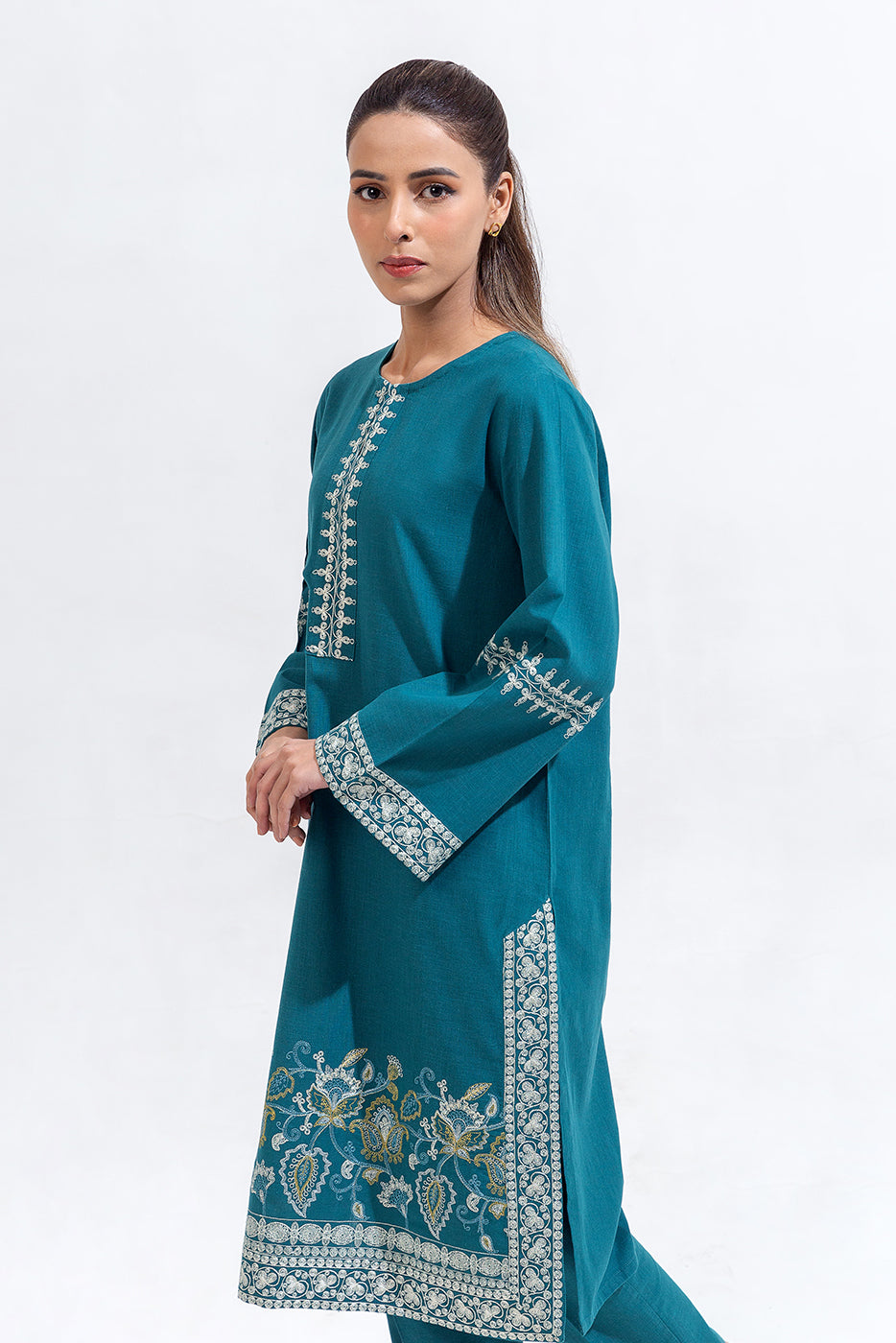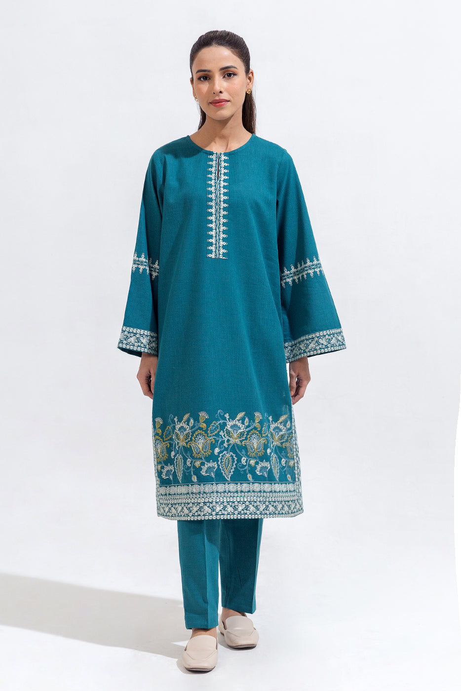 description: basic boat neck with aari inspired embroidery on front and sleeves . paired with straight pants finished with embroidered border fabric: khaddar what you'll get: shirt+pant fit: casual fit size & fit: model height is 5'6" model is wearing 8 size