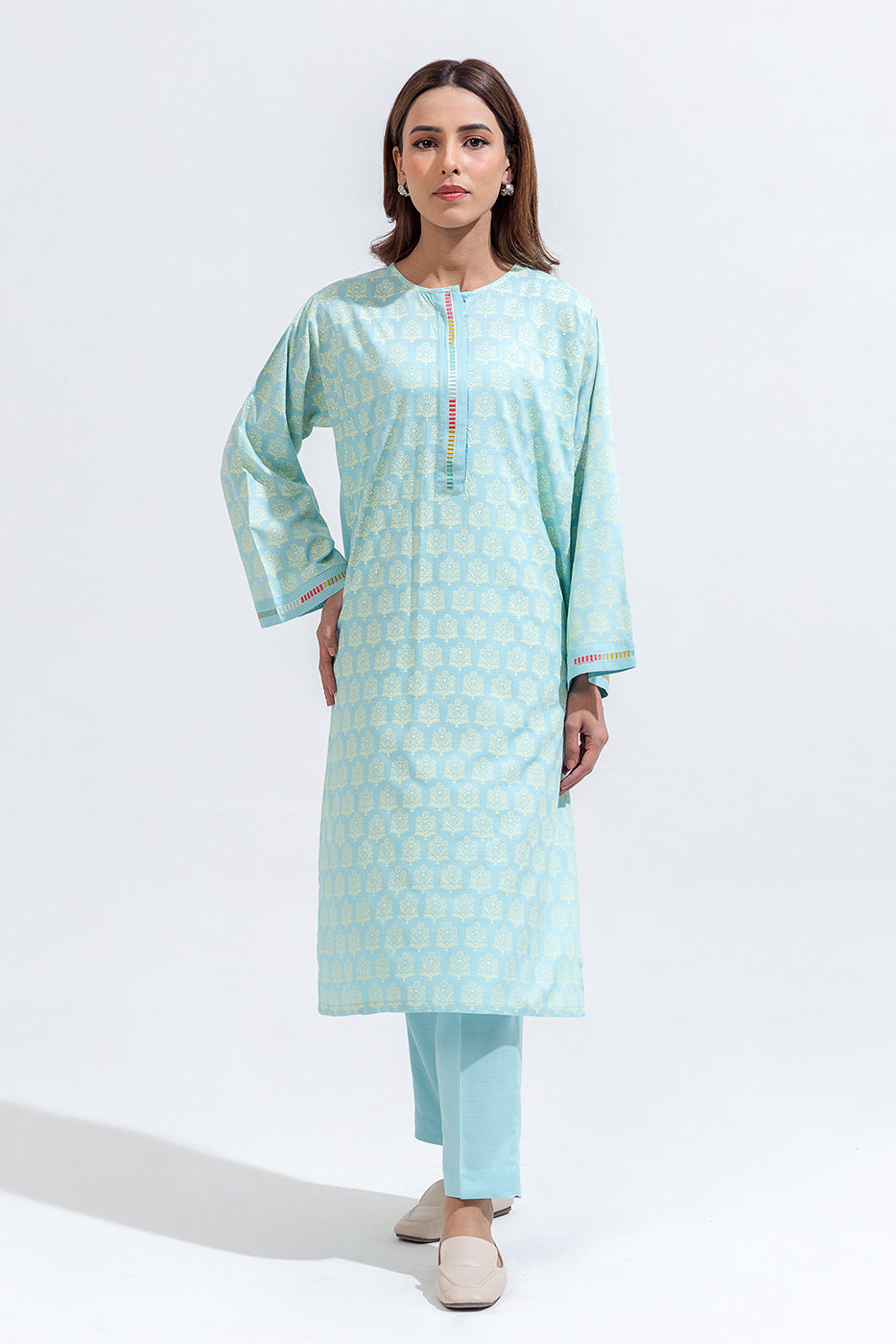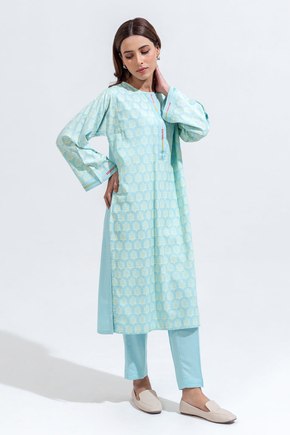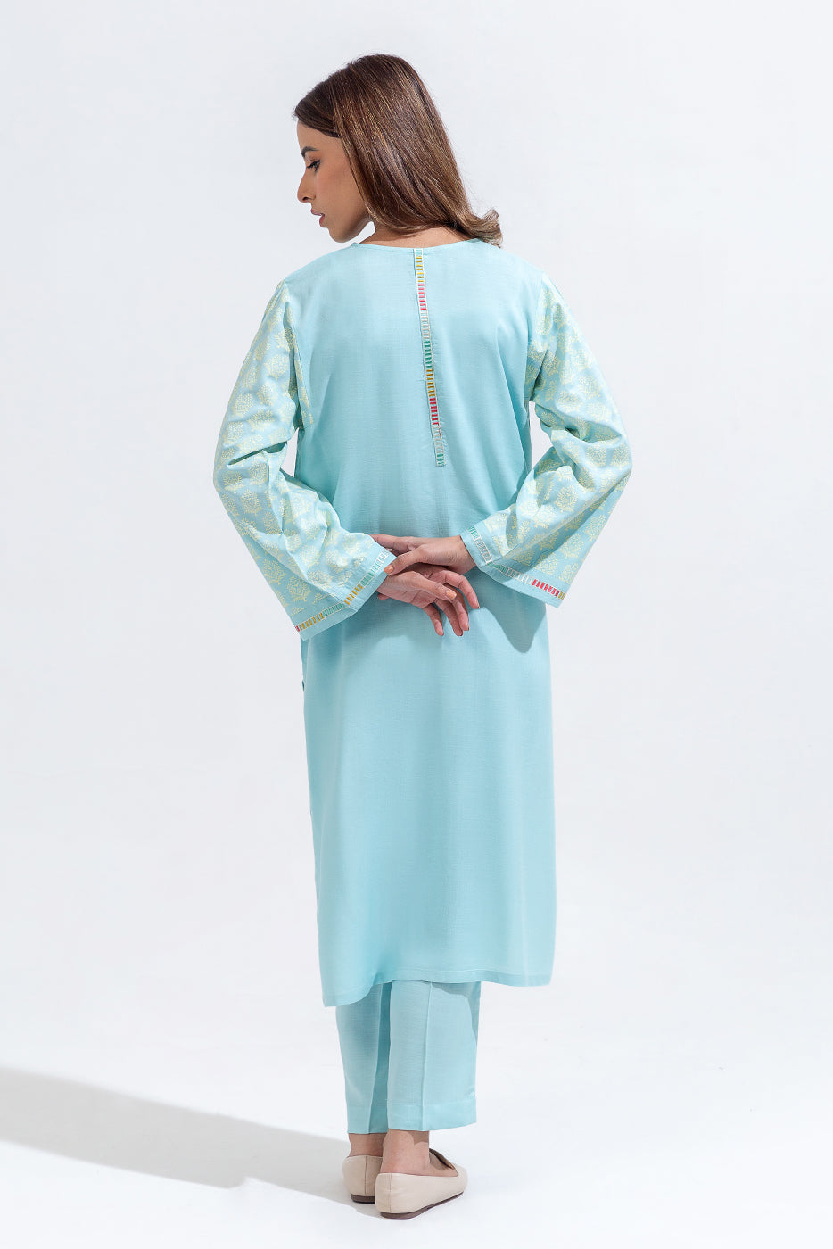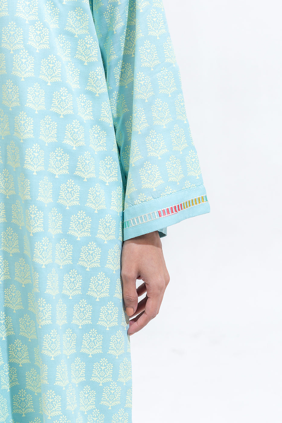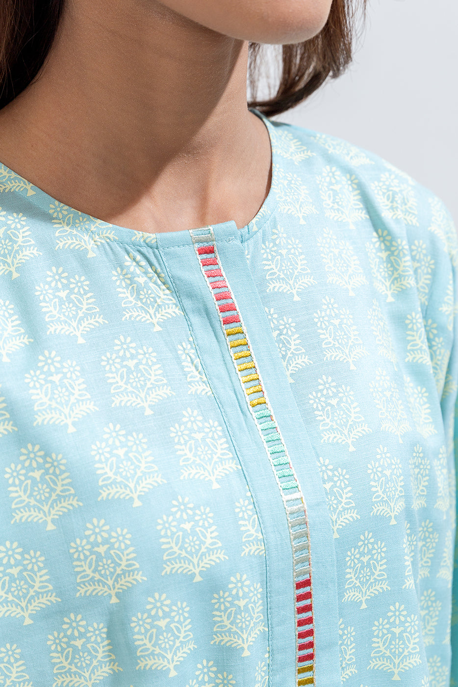 description: screen printed shirt with round neckline and embroidered placket, all over screen on front and sleeves with embroidered border. paired with straight pants to complete the look. fabric: viscose what you'll get: shirt+pant fit: casual fit size & fit: model height is 5'6" model is wearing 8 size