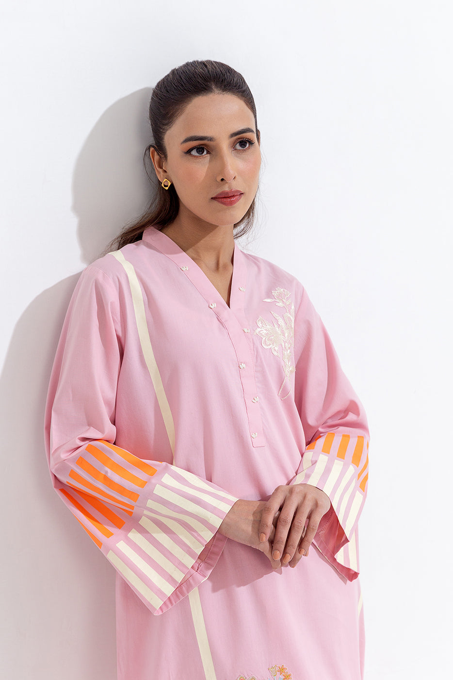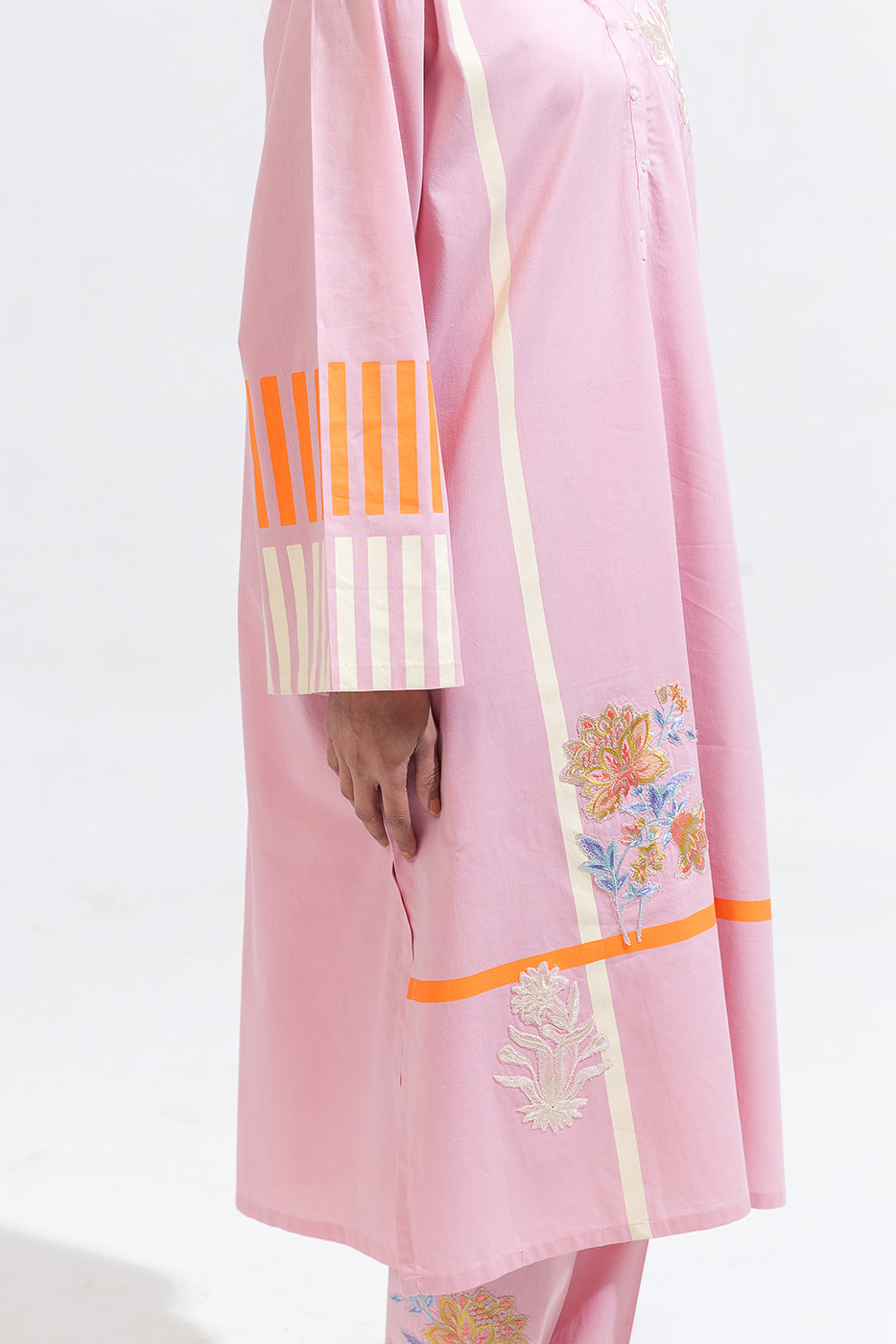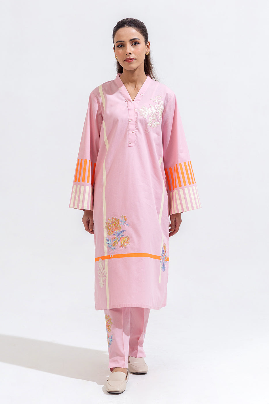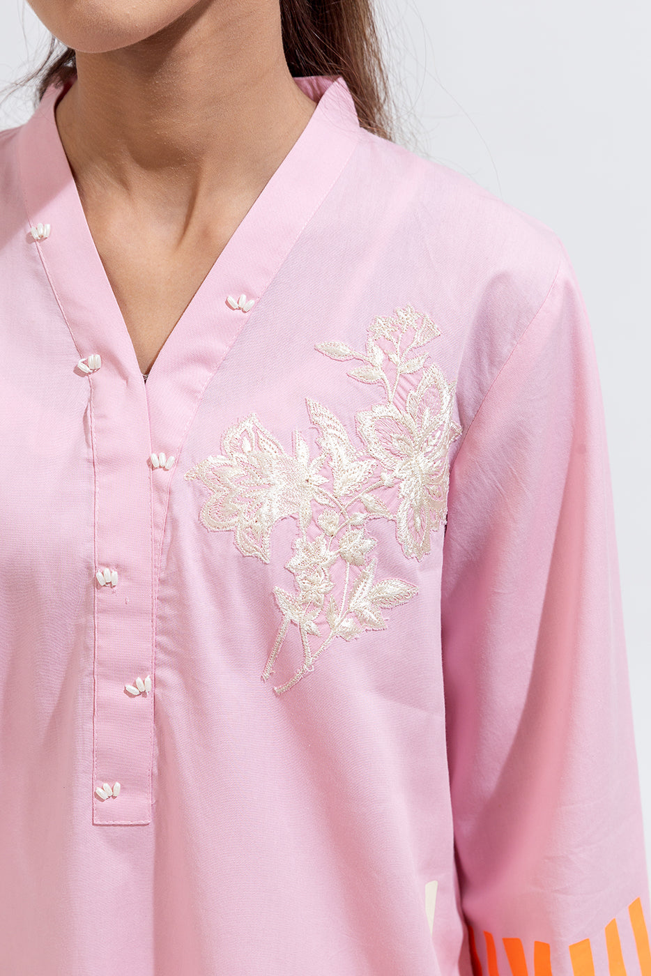 description: embroidered shirt with overlapped v-neckline with handwork detail, screen printed front and sleeves with embroidered patches. oaired with embroidered straight pants to complete the look. fabric: cambric what you'll get: shirt+pant fit: casual fit size & fit: model height is 5'6" model is wearing 8 size