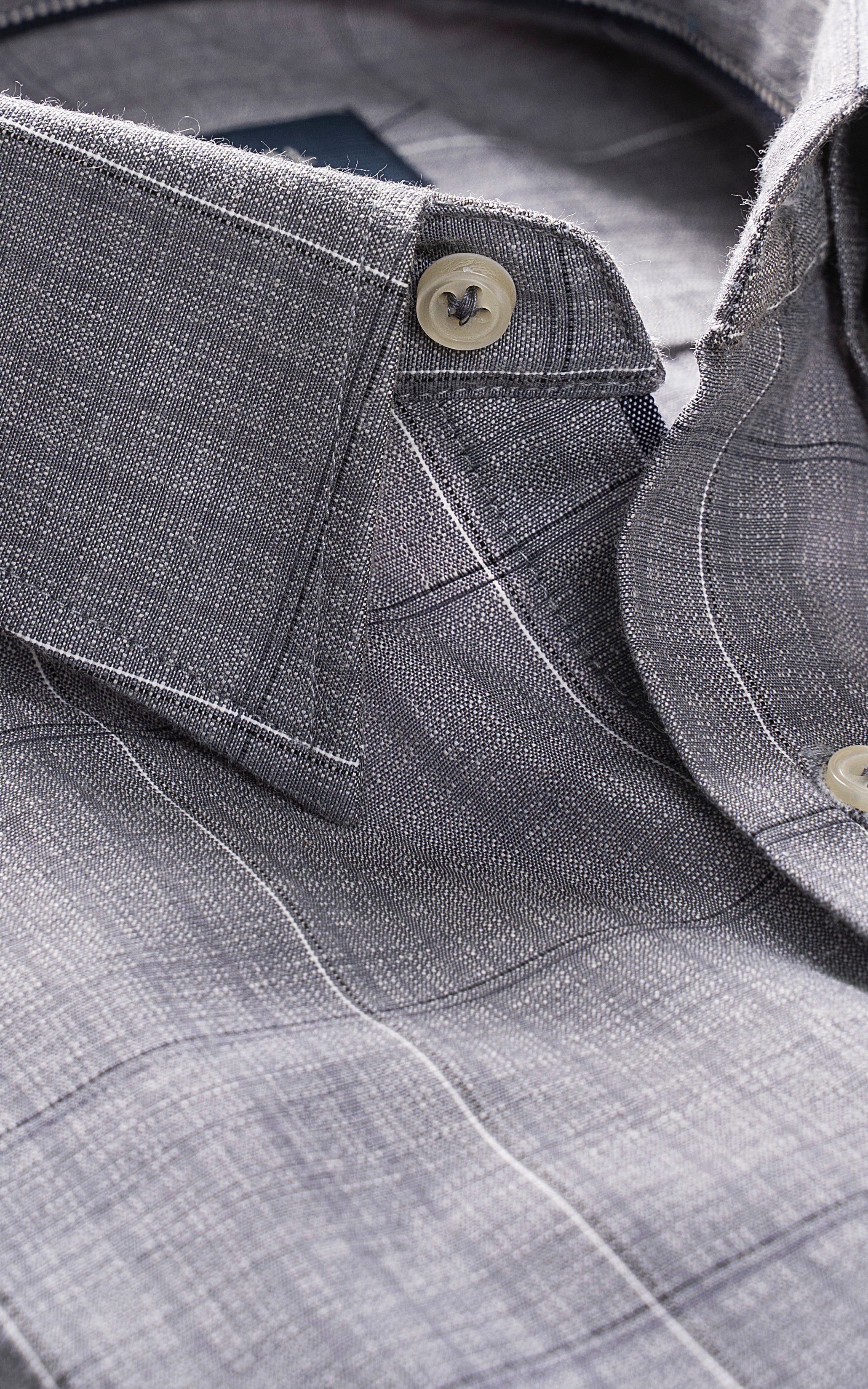 semi-formal shirt is crafted from a high-quality cotton-rich check fabric.it features a hidden button-down collar for a streamlined look, enhanced by twill tape detailing inside the ban. the button placket is accented with subtle piping along the edge. with full sleeves and round cuffs, this shirt is versatile enough for both work and social settings. machine washable for easy care.