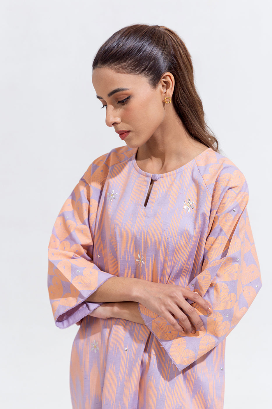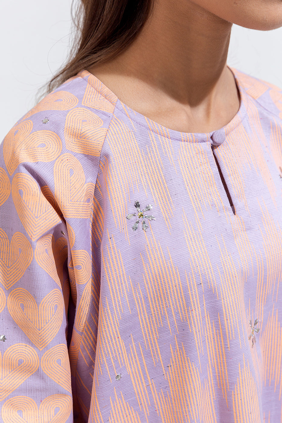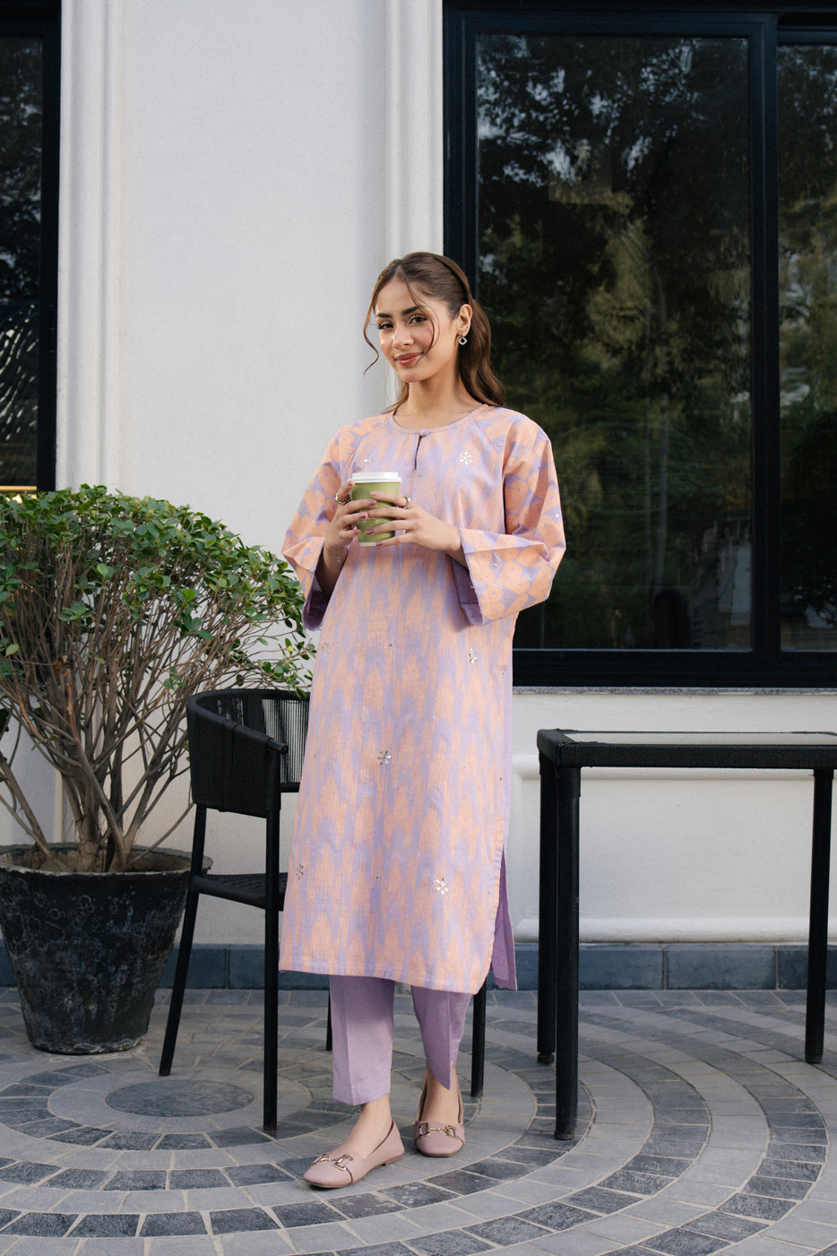description: screen printed basic shirt with round neckline and placket with button detail, raglan sleeves cutline with mukesh spray on front and sleeves paired with plain straight pant fabric: khaddar what you'll get: shirt+pant fit: casual fit size & fit: model height is 5'6" model is wearing 8 size