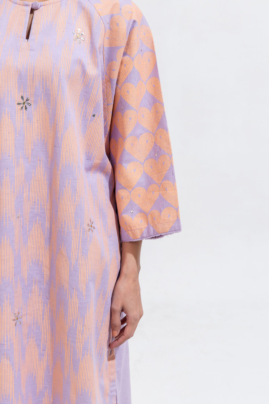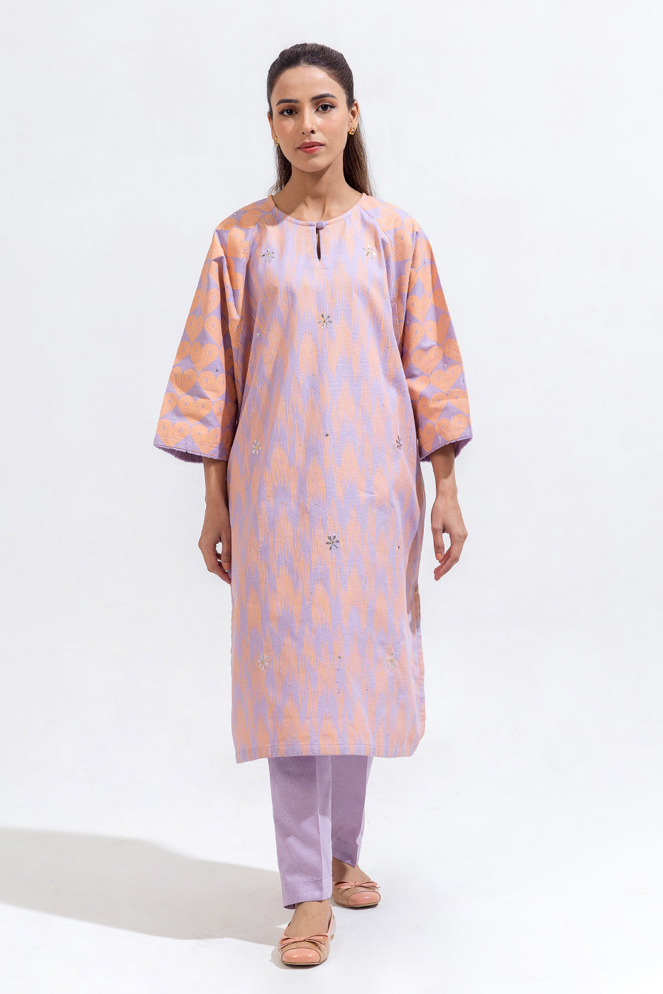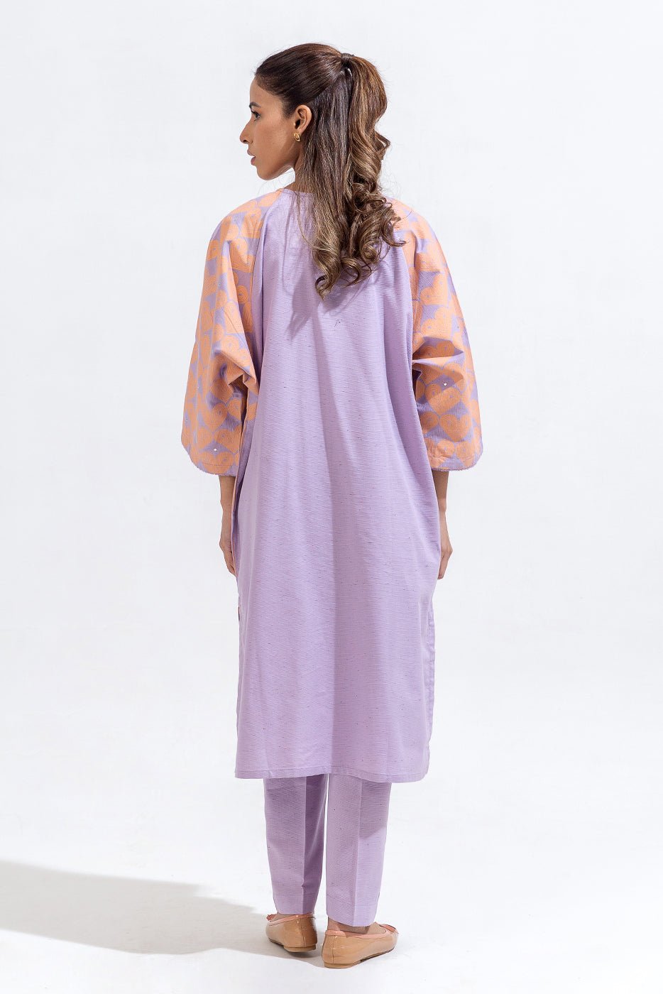 description: screen printed basic shirt with round neckline and placket with button detail, raglan sleeves cutline with mukesh spray on front and sleeves paired with plain straight pant fabric: khaddar what you'll get: shirt+pant fit: casual fit size & fit: model height is 5'6" model is wearing 8 size