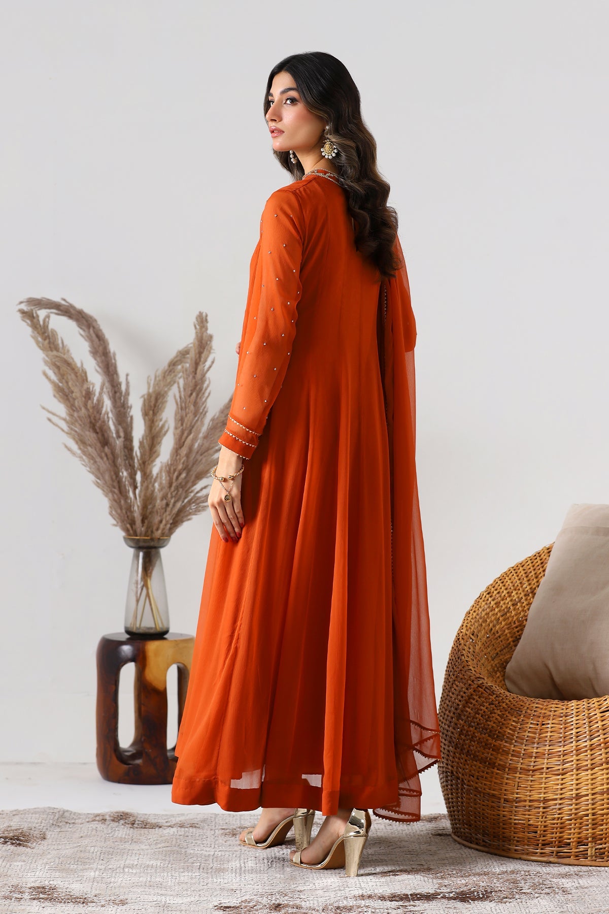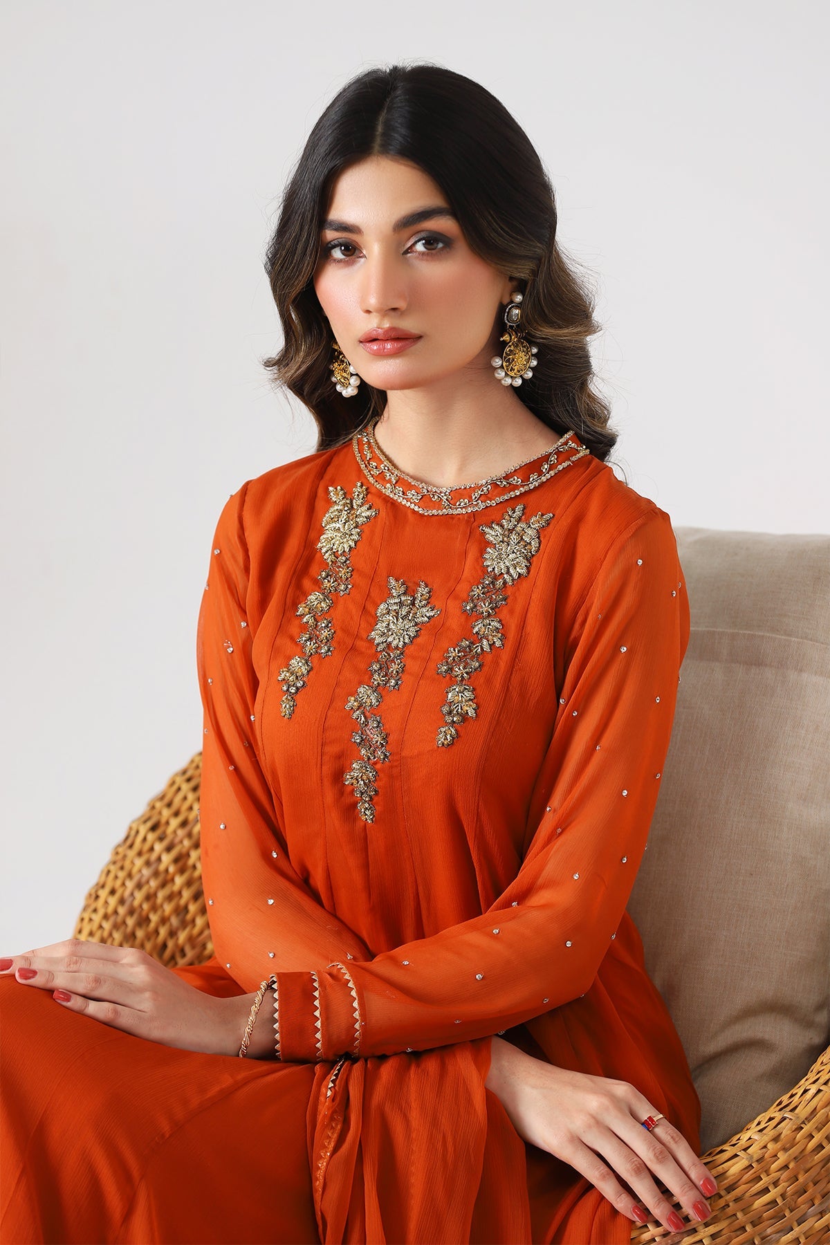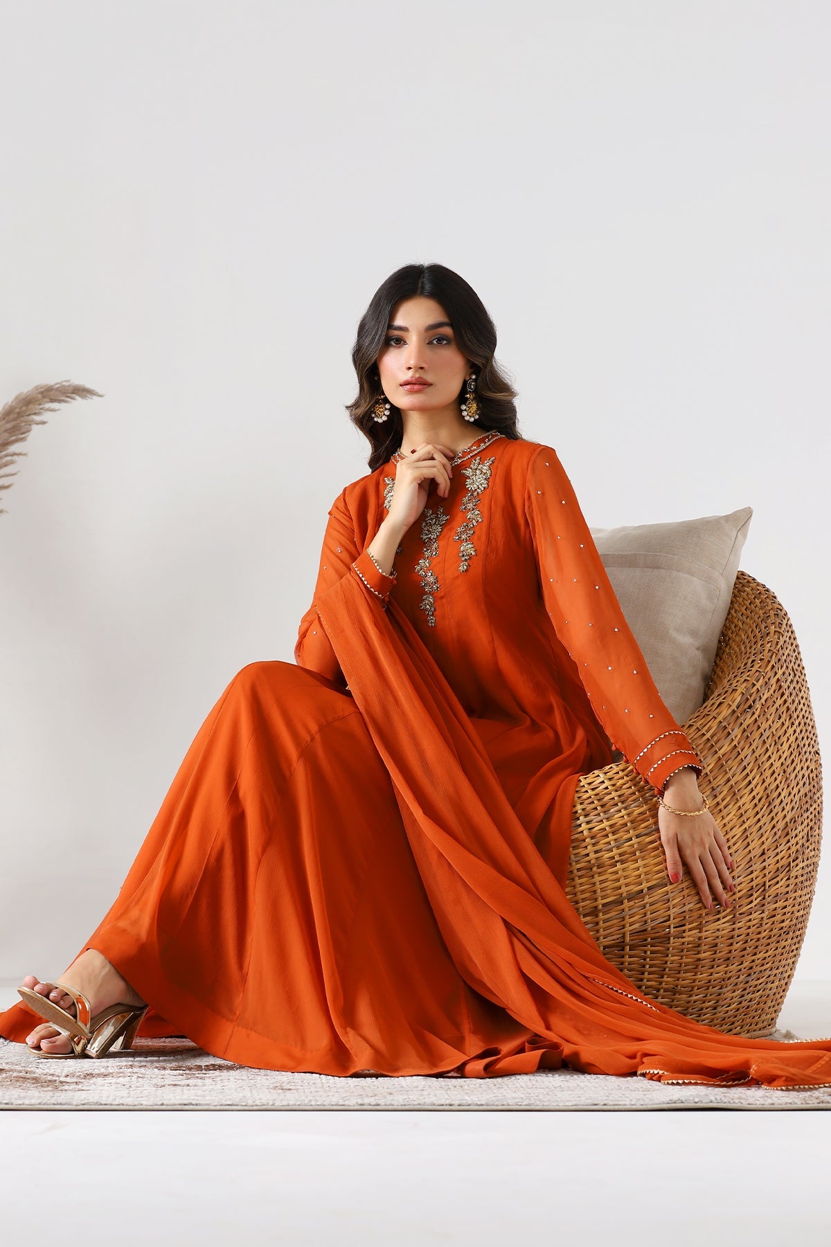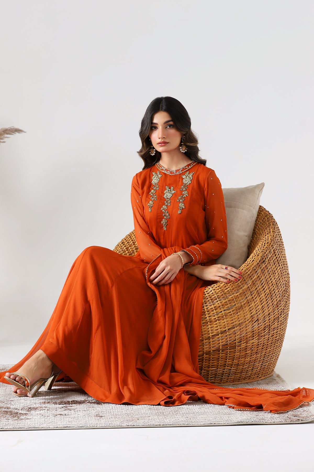 shirt : orange chiffon shirt with embroidered front back neck motif. finished with stitching detail. inner: cotton silk inner. trouser : cotton silk trouser. finished with stitching detail. dupatta : chiffon dupatta. size s m l measurement length 54" 54" 54" flare/ daman width