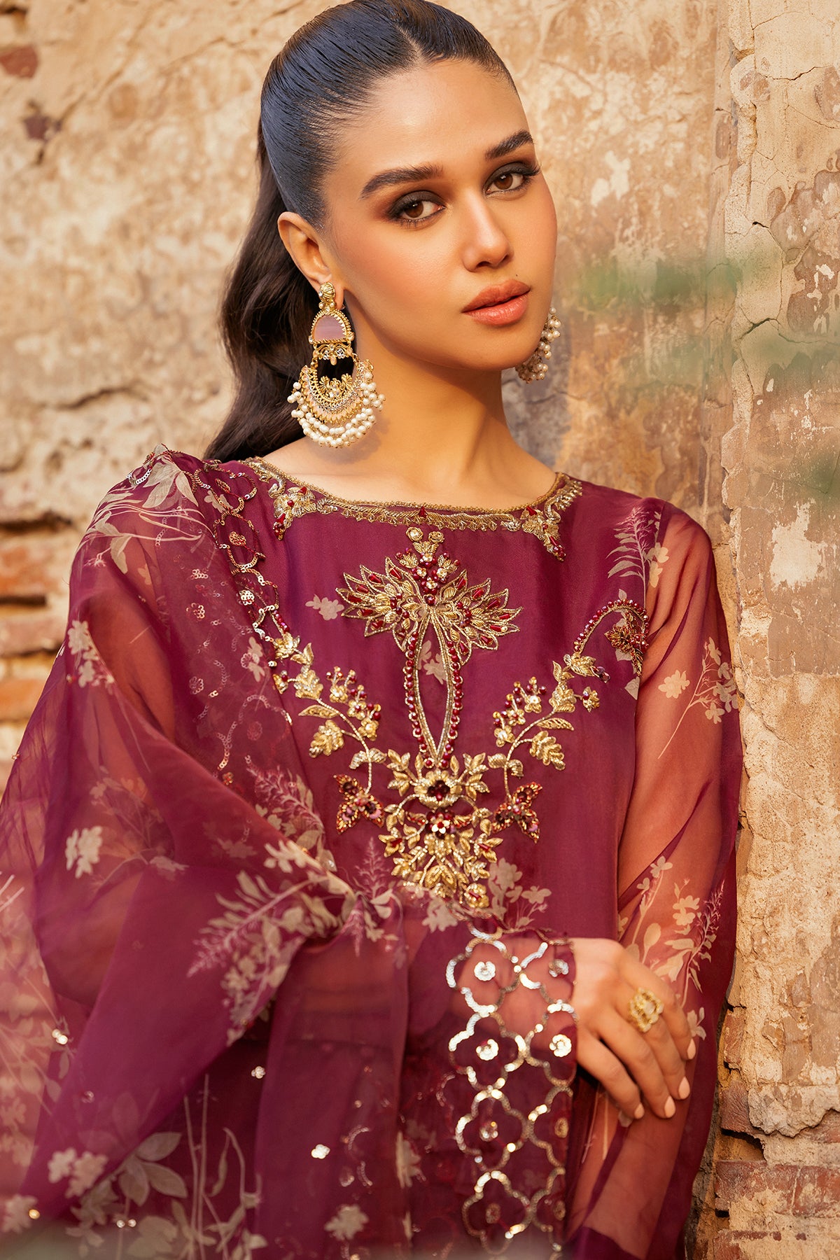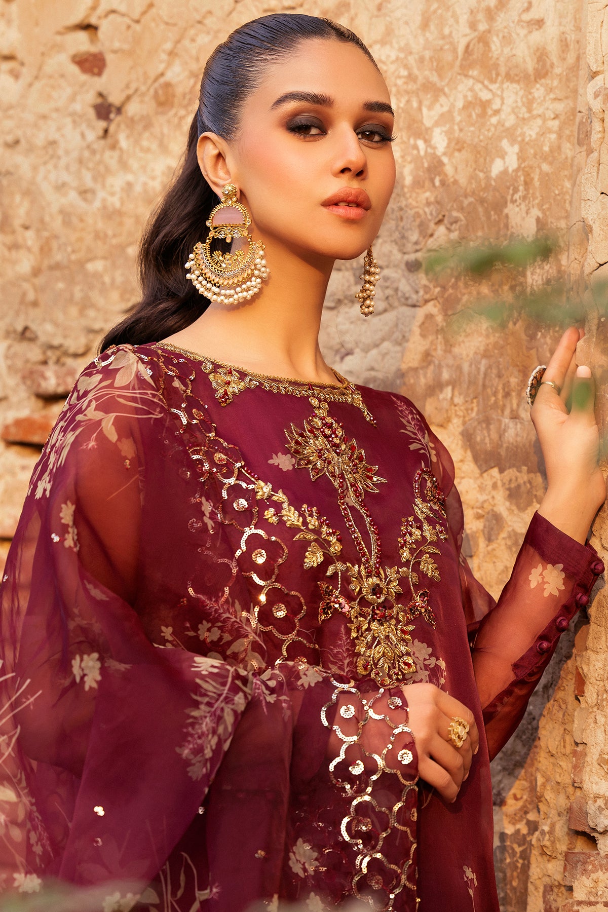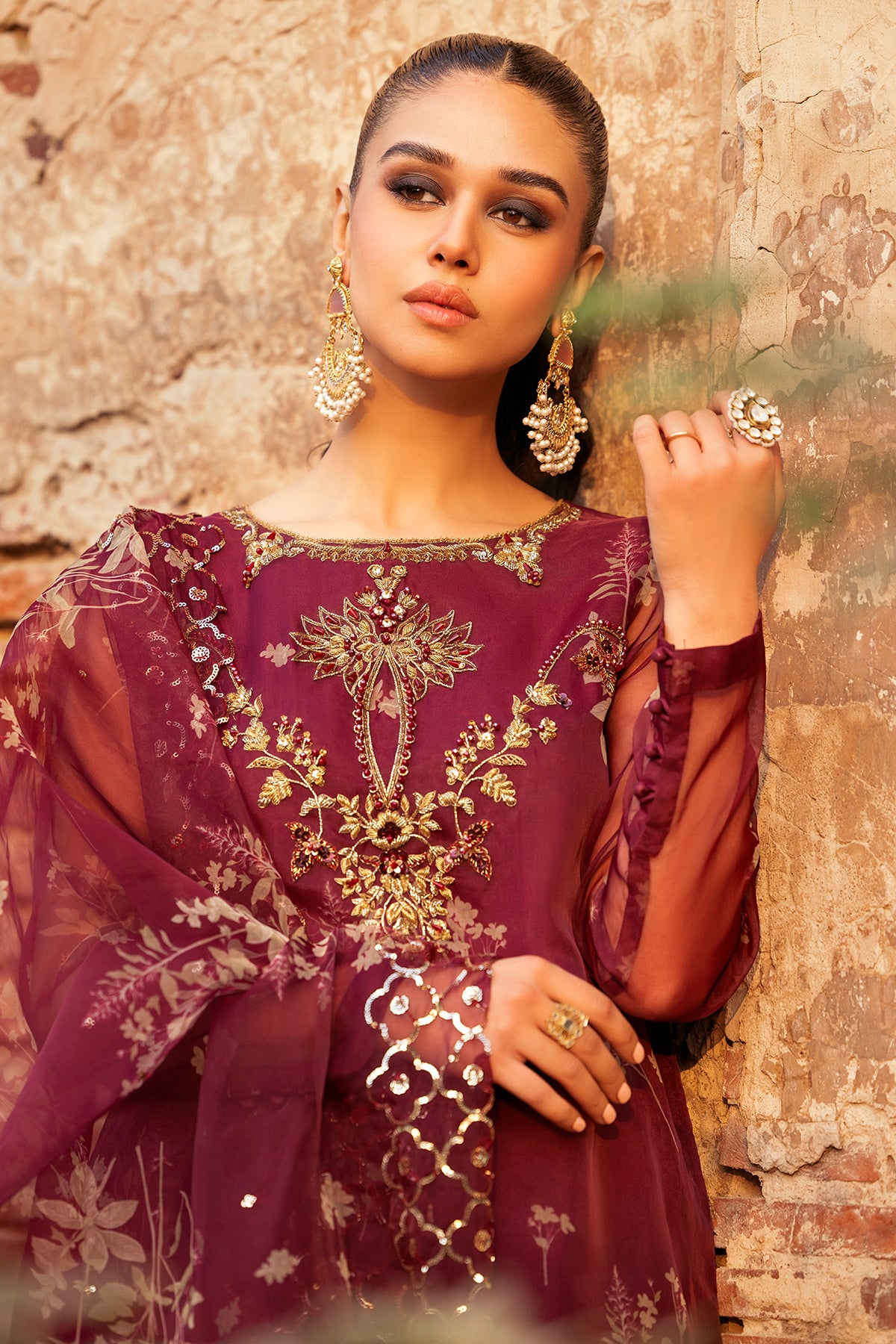 organza printed shirt with embroidered front pannel.embellished with patch work and adda work. raw silk inner shirt.finished with stitching detail. raw silk trouser. organza printed dupatta with embroidered 4 side dupatta pallu lace. measurement length (body length) 48" 50" 52" flare/daman width 27" 29" 29"