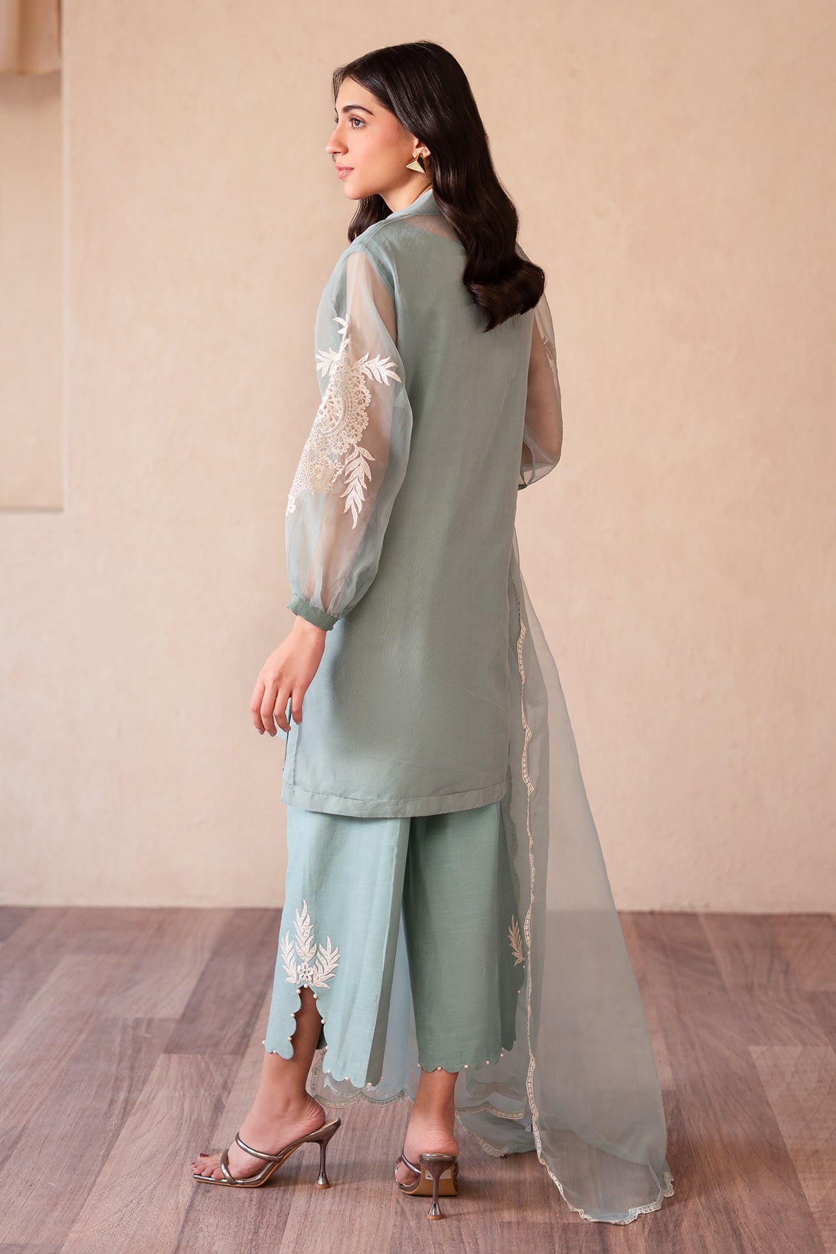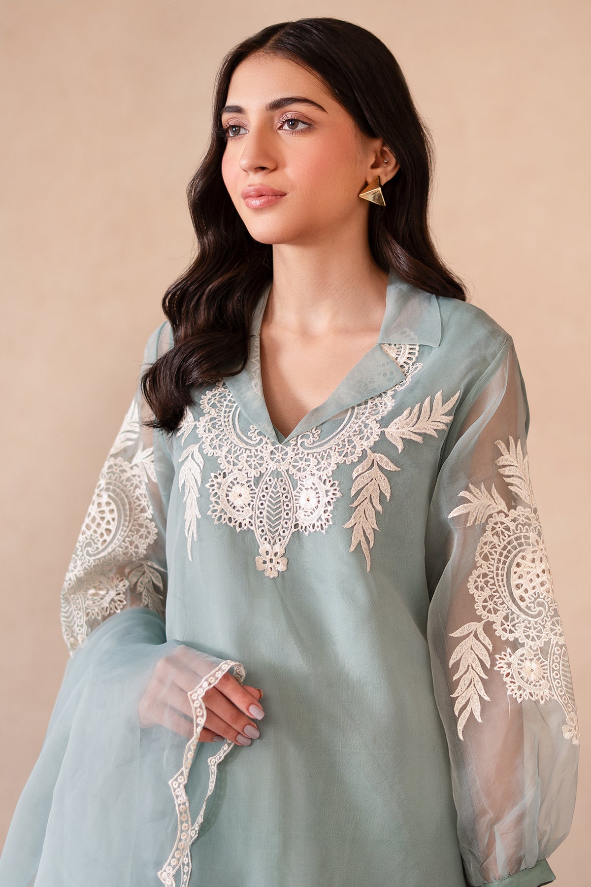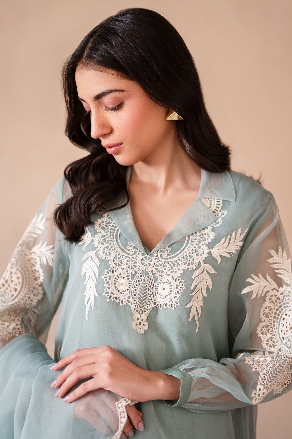 shirt: organza shirt with embroidered front and embroidered sleeves. embellished with patch work.raw silk inner shirt. finished with stitching detail. trouser : raw silk trouser with fashion and embroidered trouser motifs. finished with stitching detail. dupatta : organza dupatta with embroidered 4 side dupatta pallu lace and dupatta motifs." size : s m l measurement length (body length) 35" 37" 39" flare/daman width 25" 27" 29"