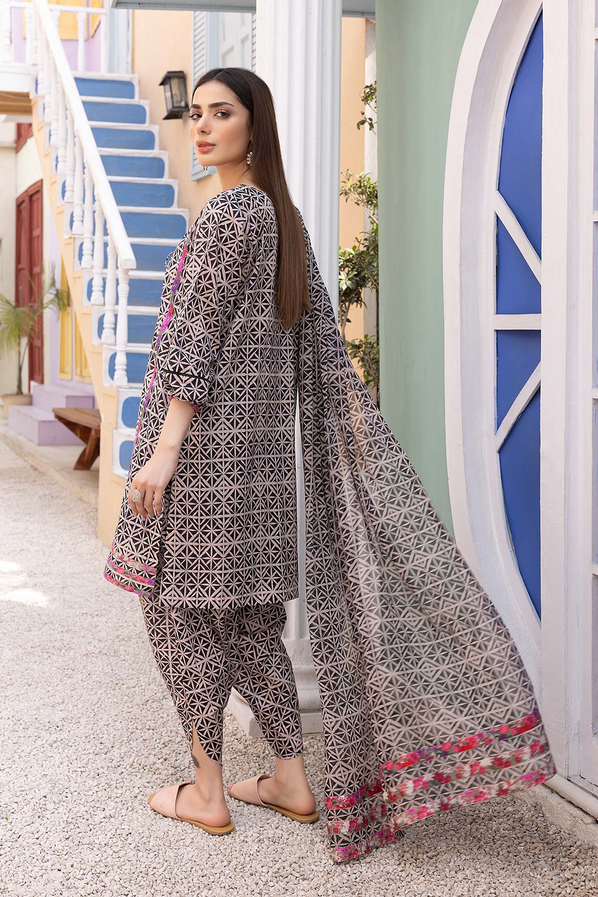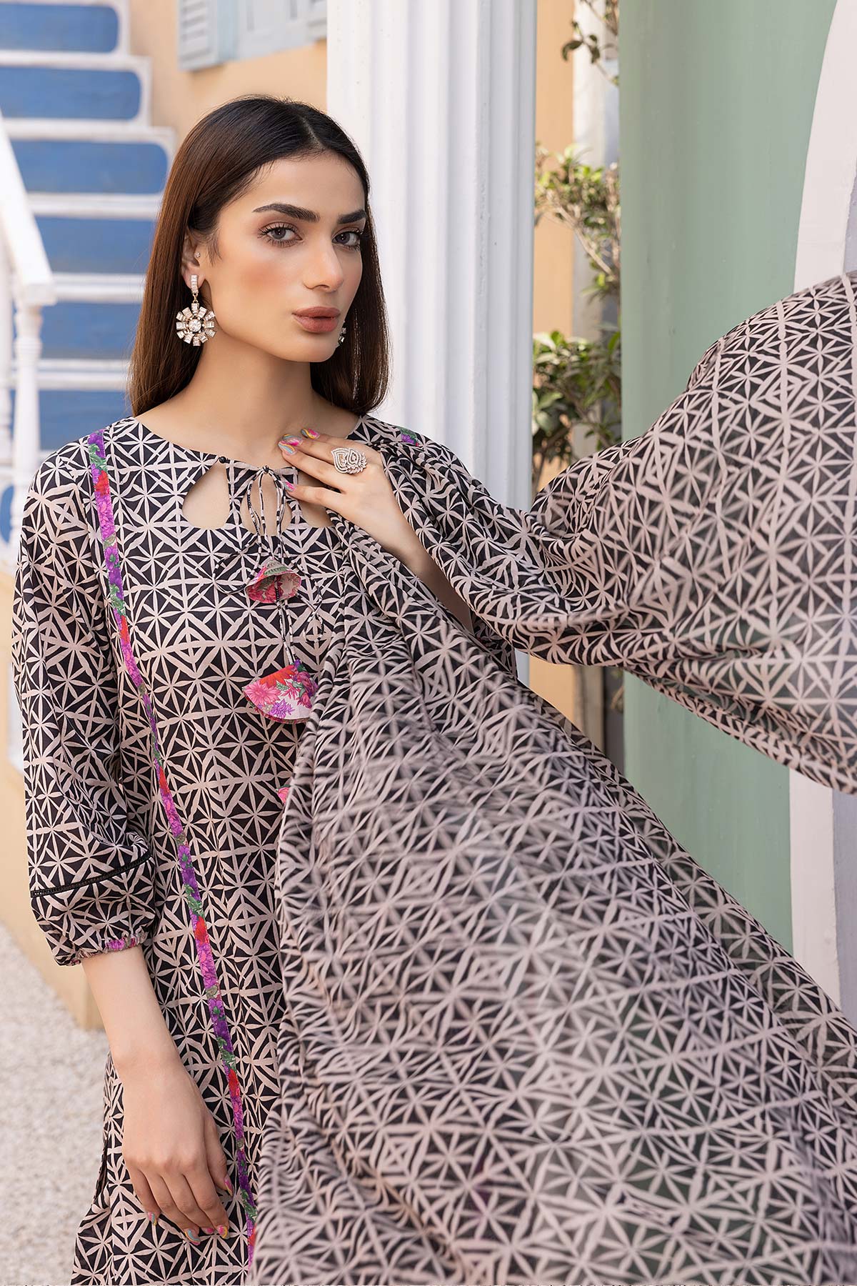 - black & white digital lawn printed shirt - finished with printed fabric on daman, sleeves & dori tessel neckline - printed tulip trouser - digital printed chiffon dupatta finished with printed fabric measurement length 36" 36" 38" 38" flare/ daman width 26" 26" 28" 28"