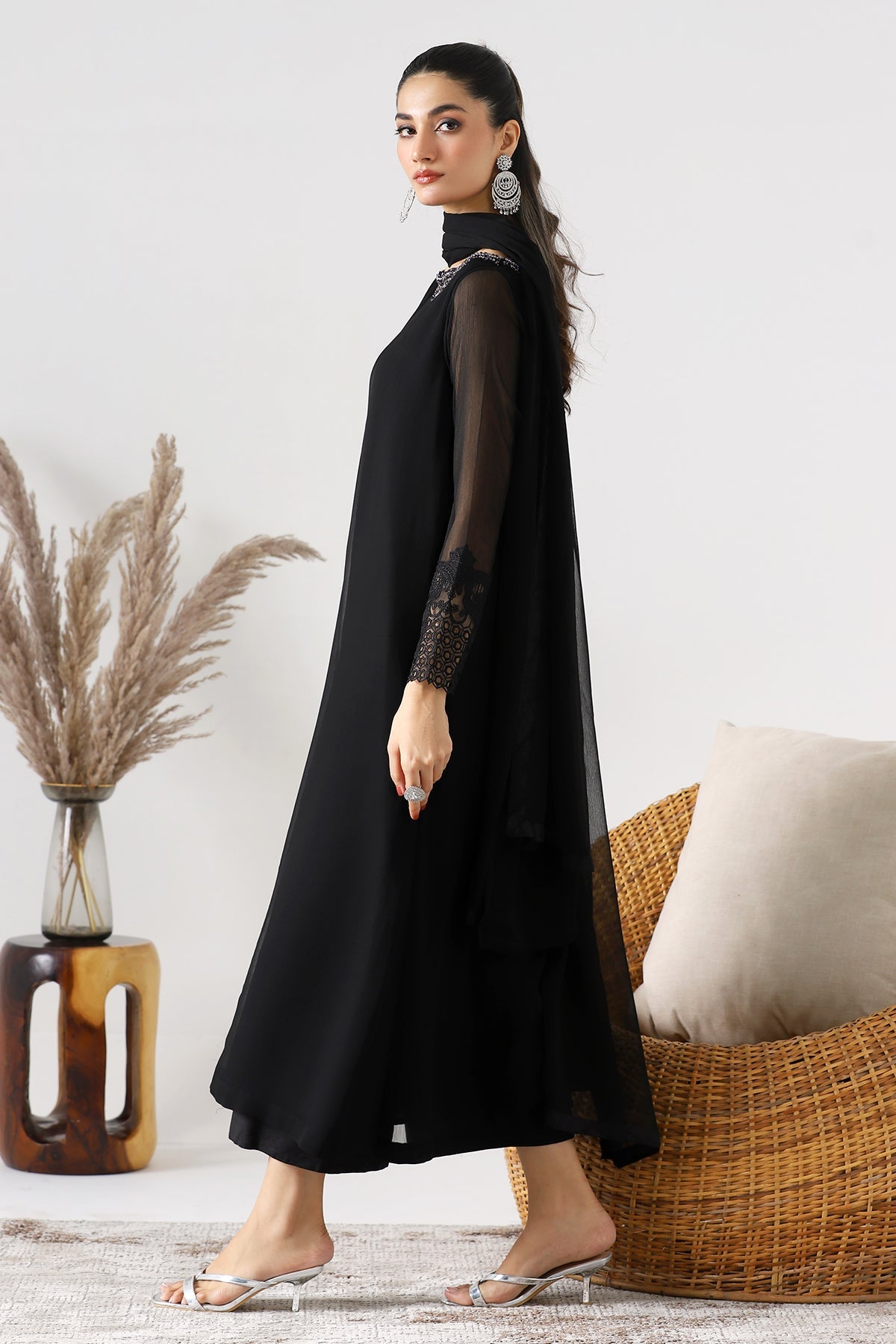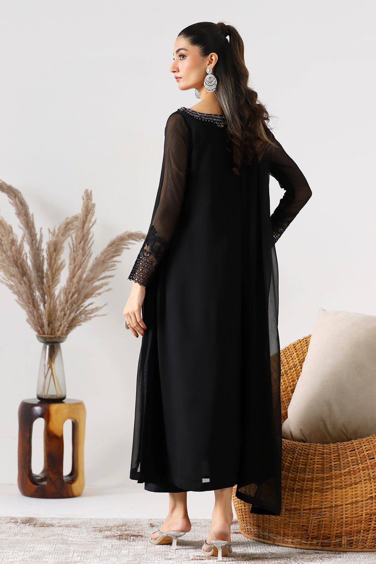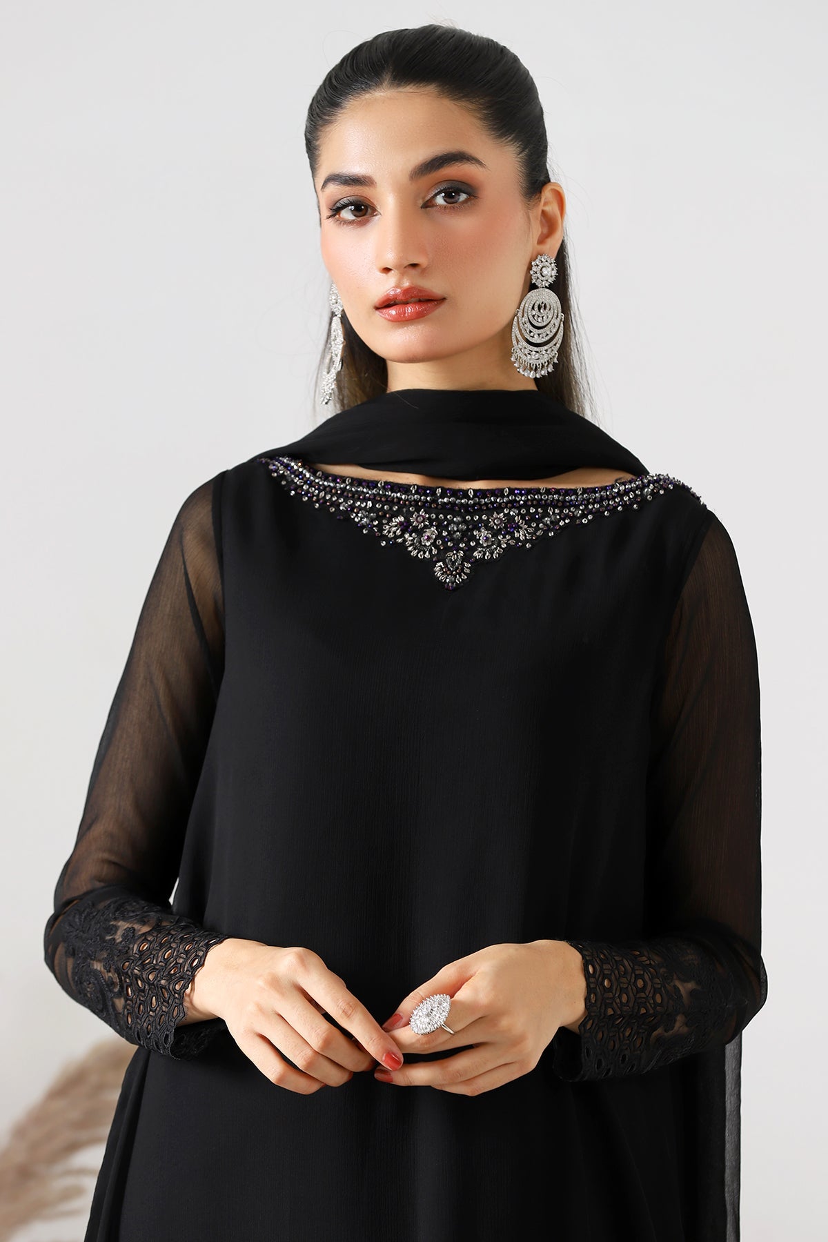 shirt: black chiffon plain shirt with embroidered front back motif and embroidered sleeves. finished with stitching detail. silk cotton inner shirt. trouser: silk cotton trouser. finished with stitching detail. dupatta: chiffon dupatta. size s m l measurement length 49" 51" 53" flare/ daman width 35" 37" 39"