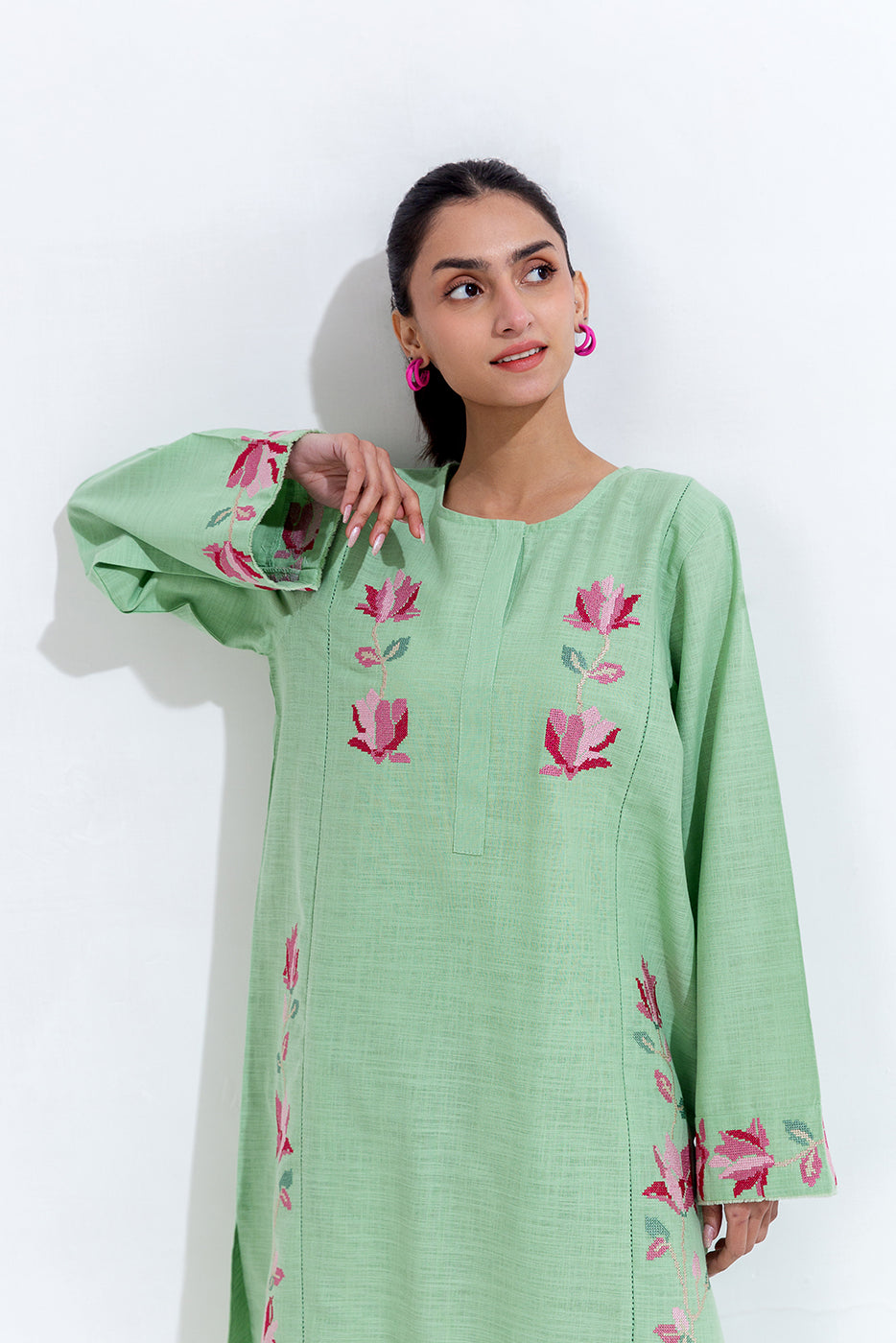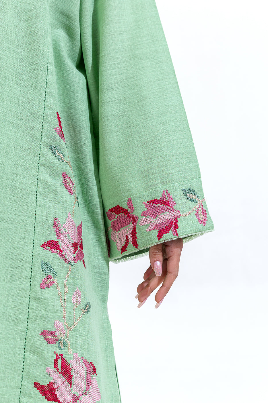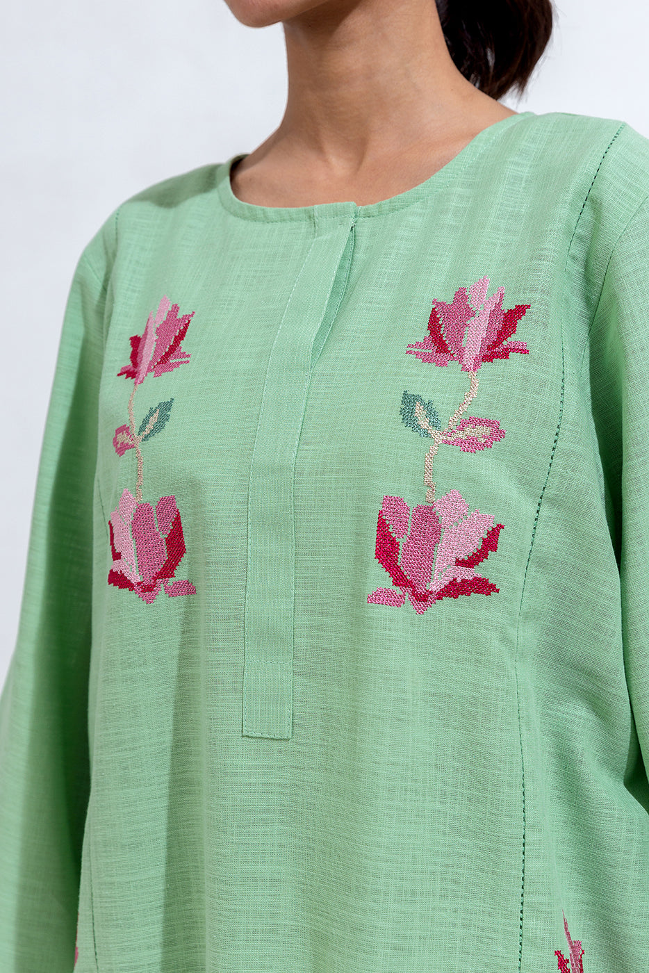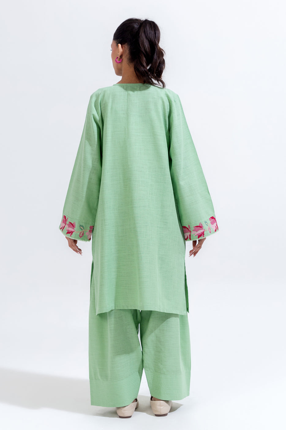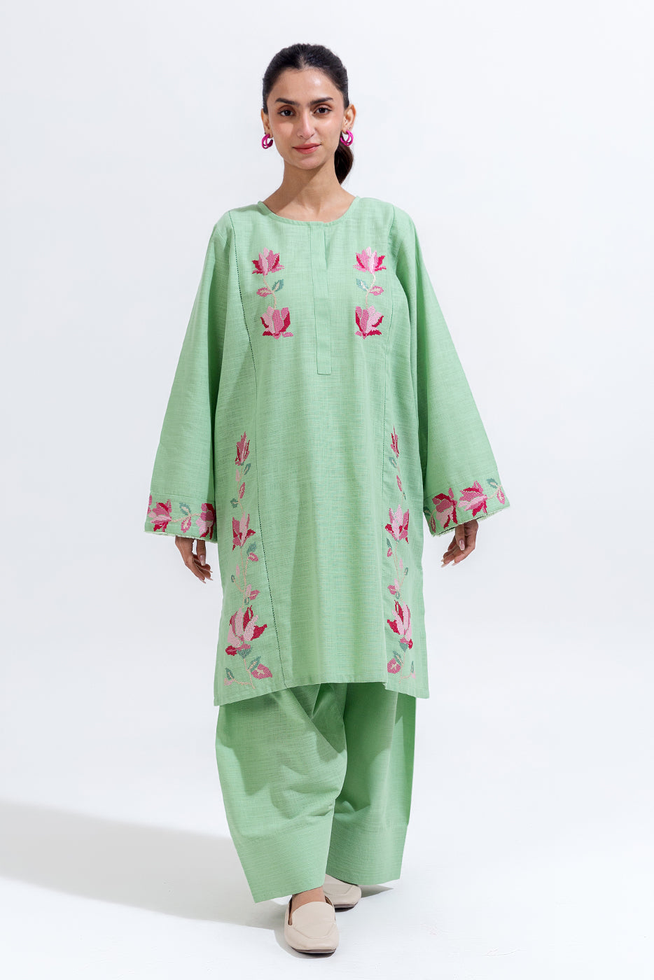 description: embroidered shirt with round neckline and placket, and taarkashi detail on front, embroidered border on sleeves with frayed edging detail. paired with loose shalwar to complete the look. fabric: two way slub what you'll get: shirt+pant fit: casual fit size & fit: model height is 5'6" model is wearing 8 size