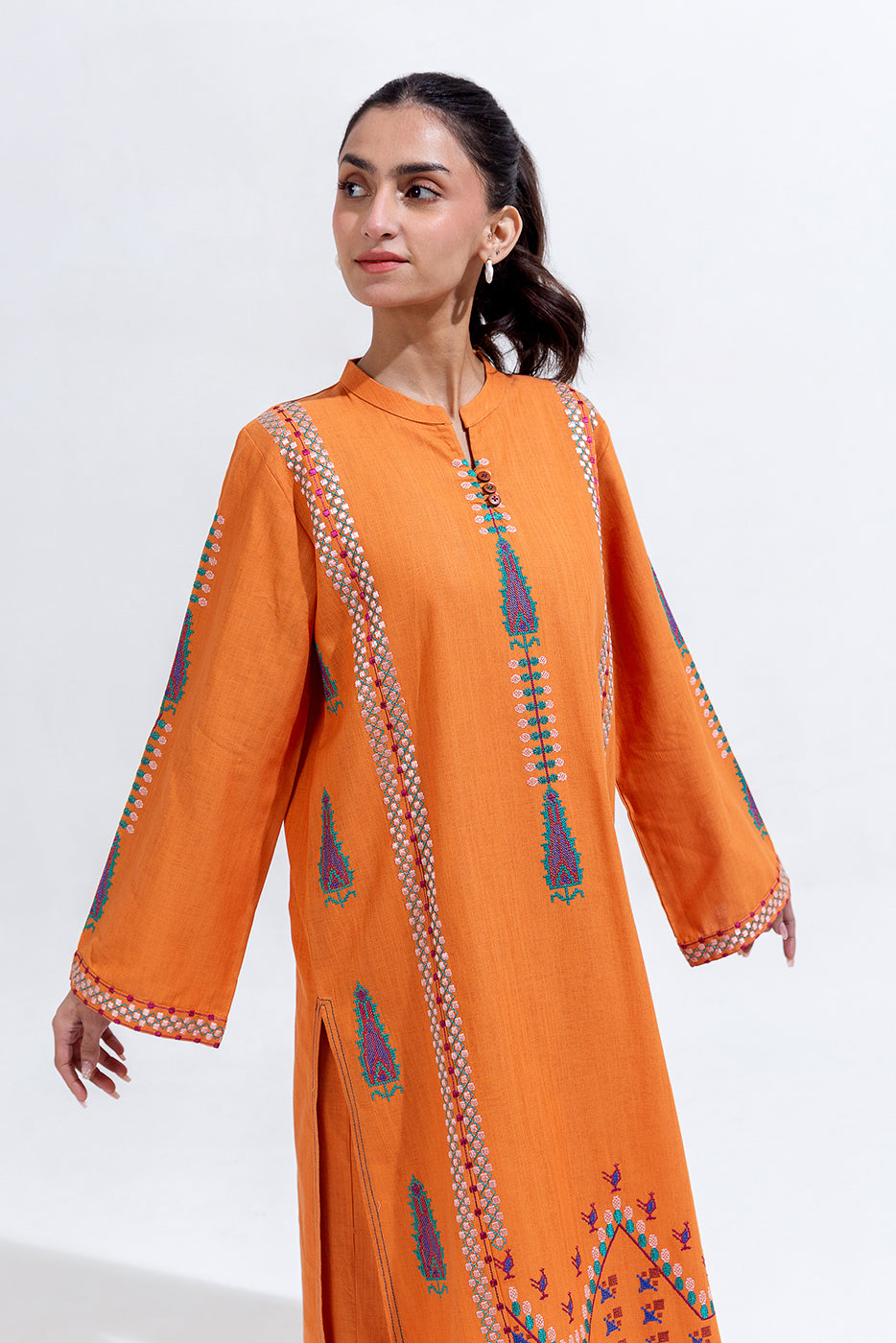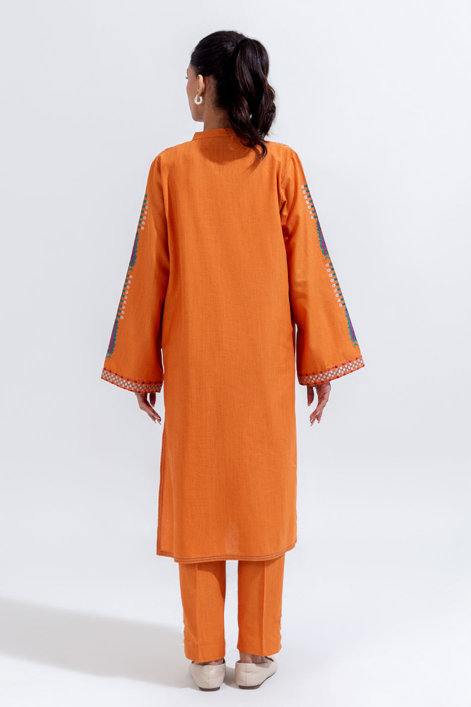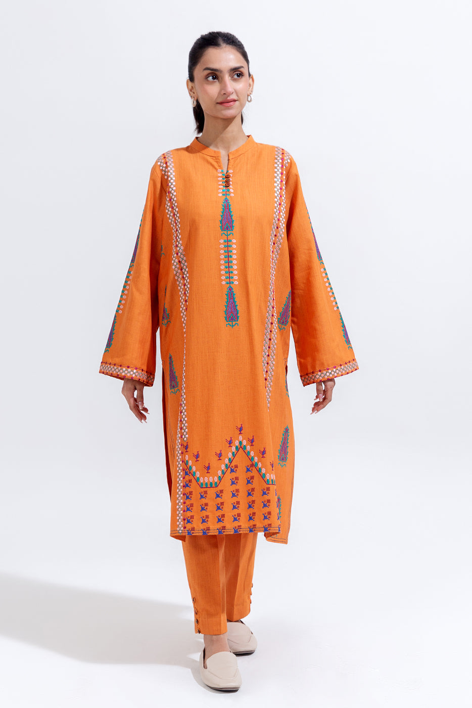 description: 2pc.embroidered shirt with band and slit with loops and button.embroidered sleeves.straight hem.paired with straight pants. fabric: khaddar what you'll get: shirt+pant fit: casual fit size & fit: model height is 5'6" model is wearing 8 size