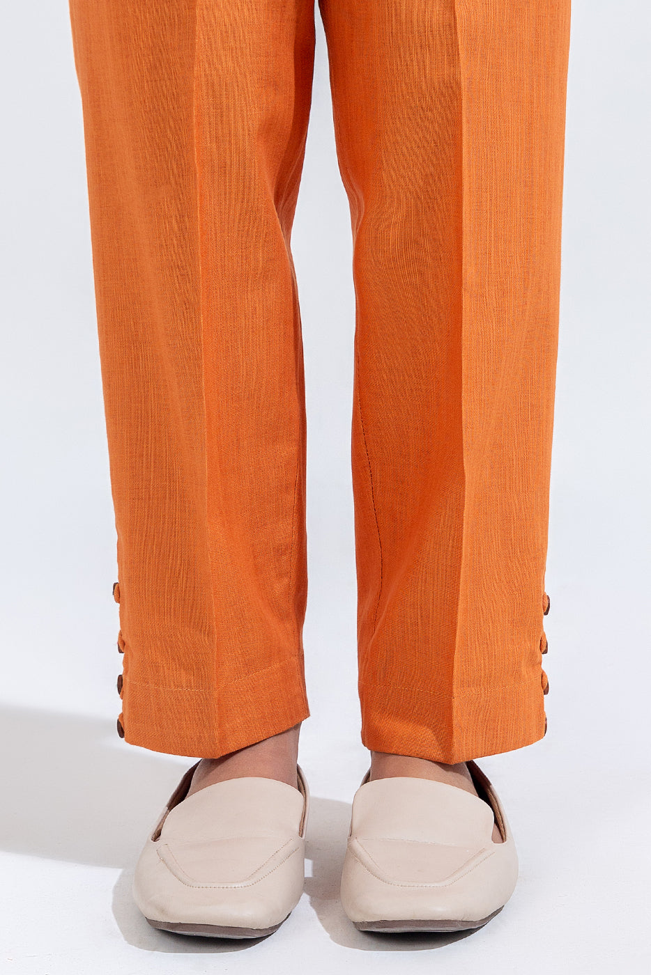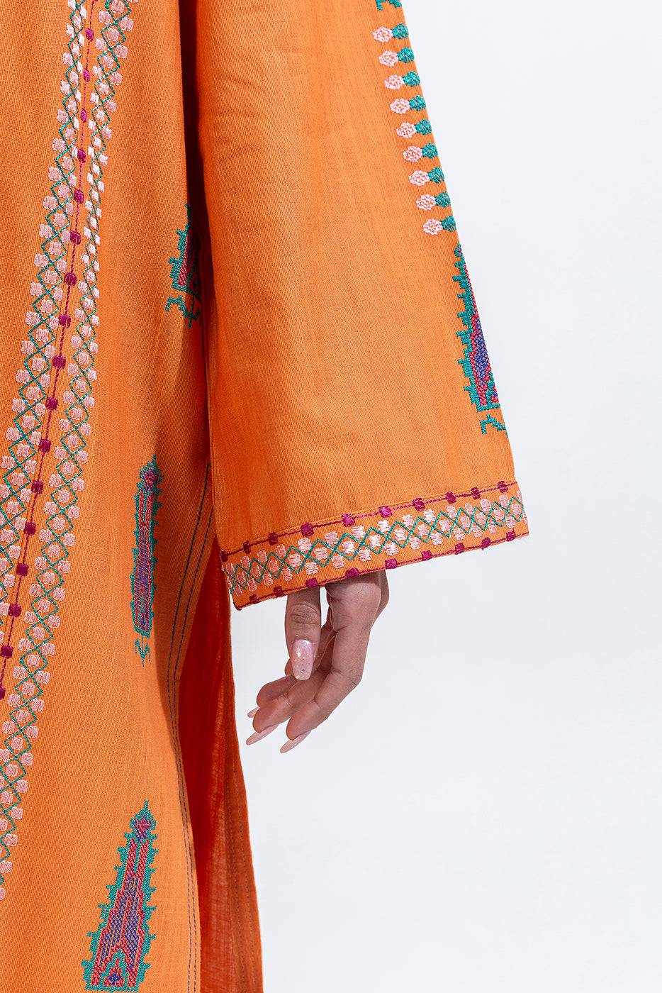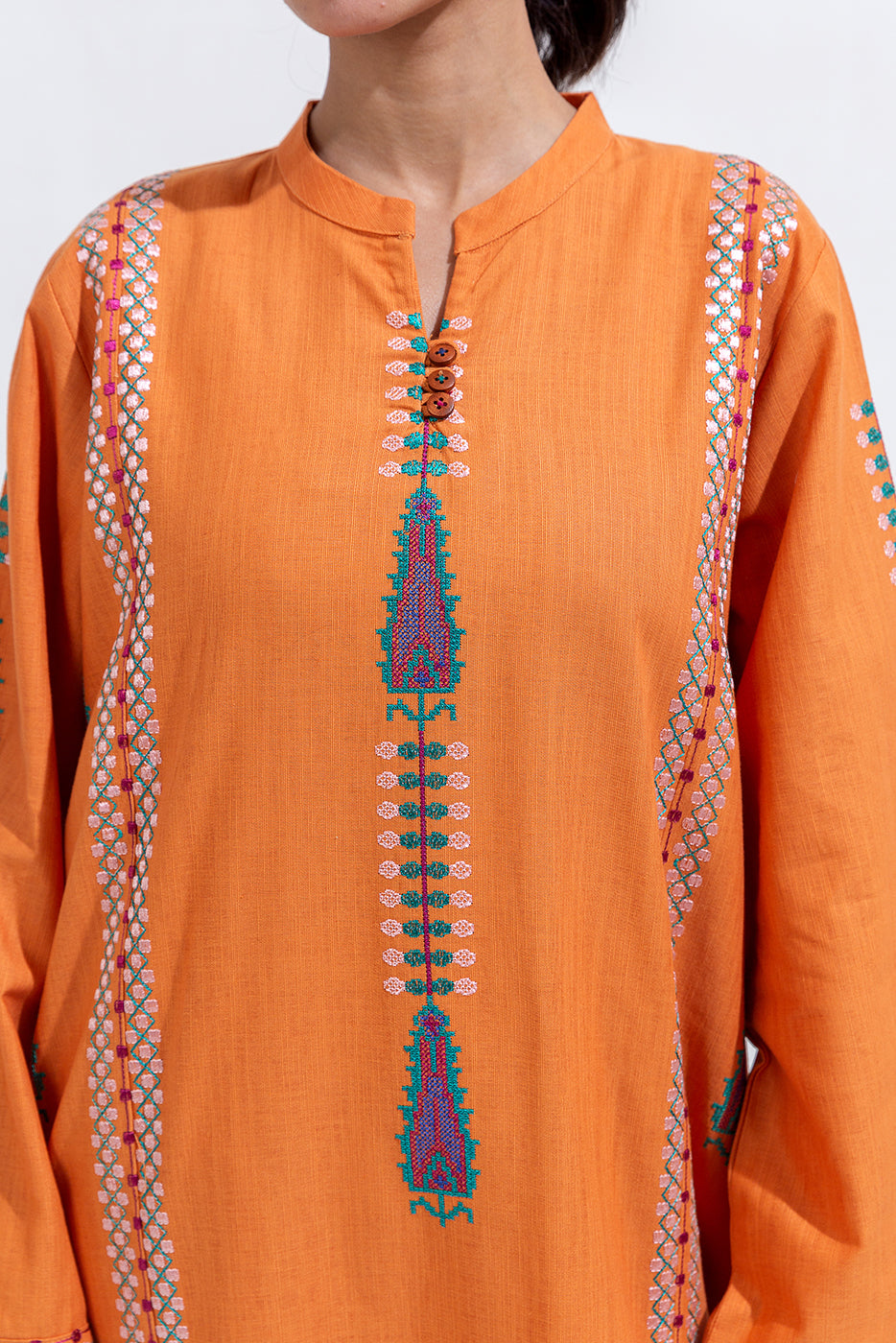 description: 2pc.embroidered shirt with band and slit with loops and button.embroidered sleeves.straight hem.paired with straight pants. fabric: khaddar what you'll get: shirt+pant fit: casual fit size & fit: model height is 5'6" model is wearing 8 size