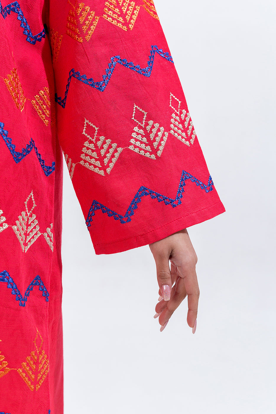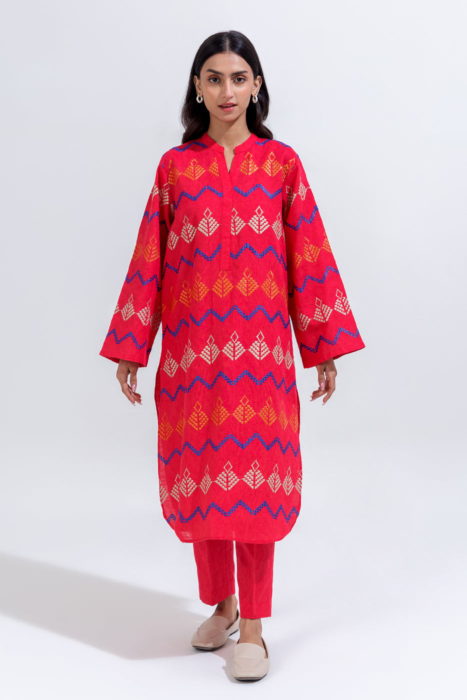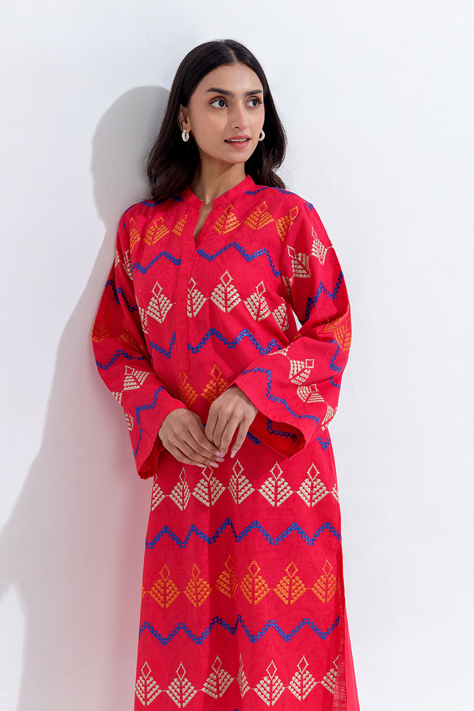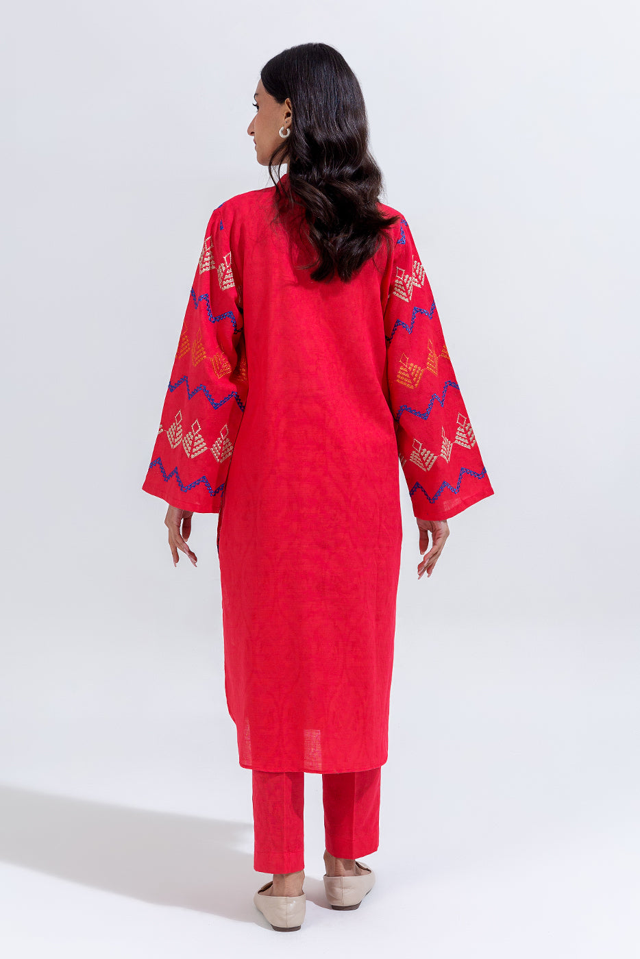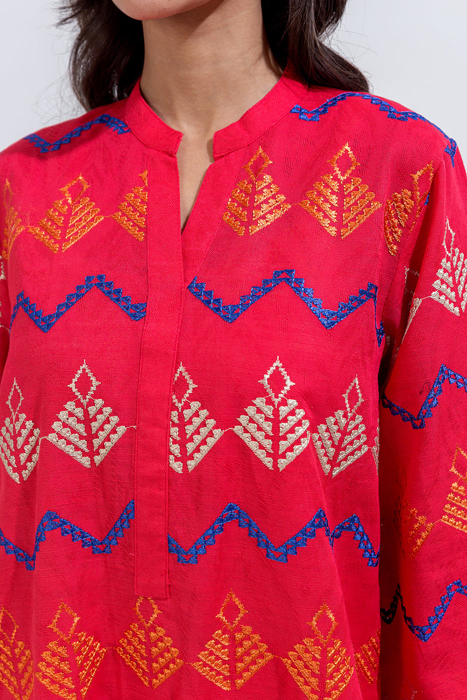 description: embroidered shirt with band collar and placket with contrasting trim detial. paired with straight pants to complete the look. fabric: khaddar jacquard what you'll get: shirt+pant fit: casual fit size & fit: model height is 5'6" model is wearing 8 size