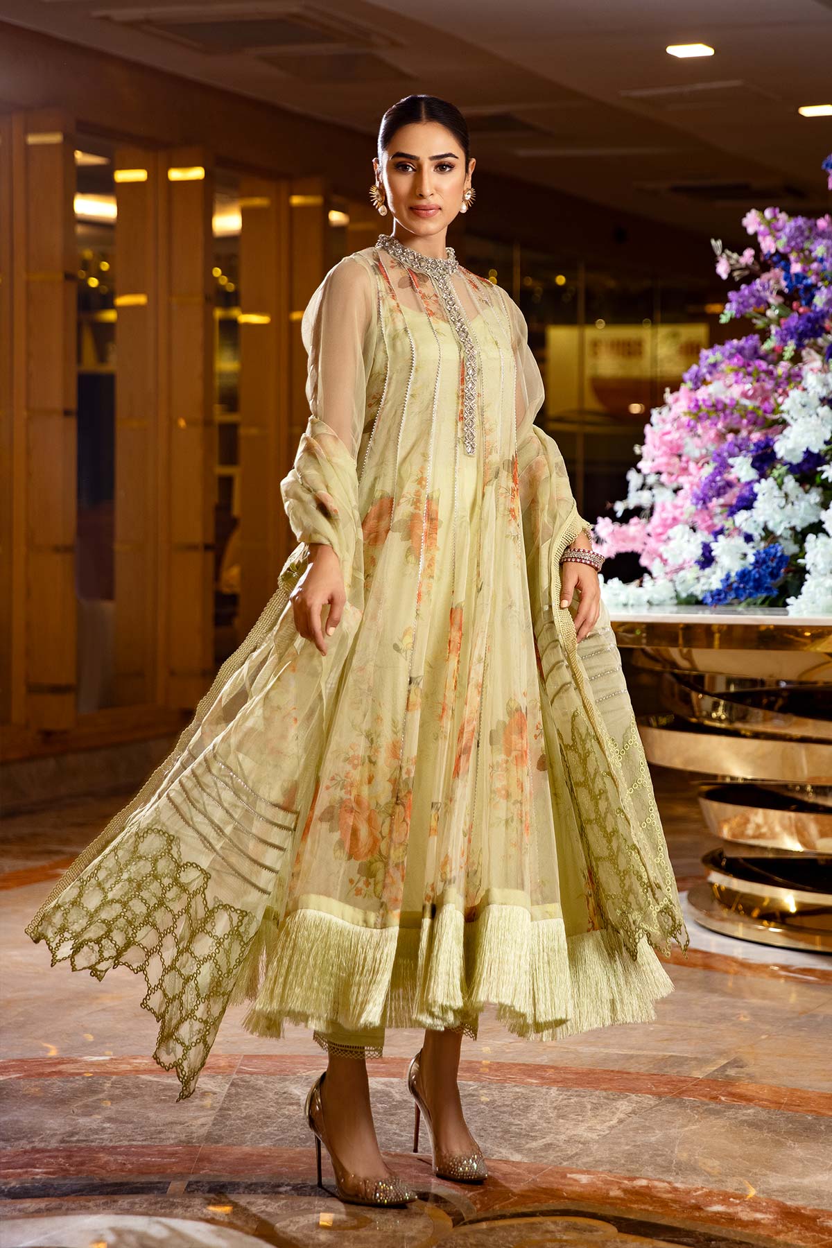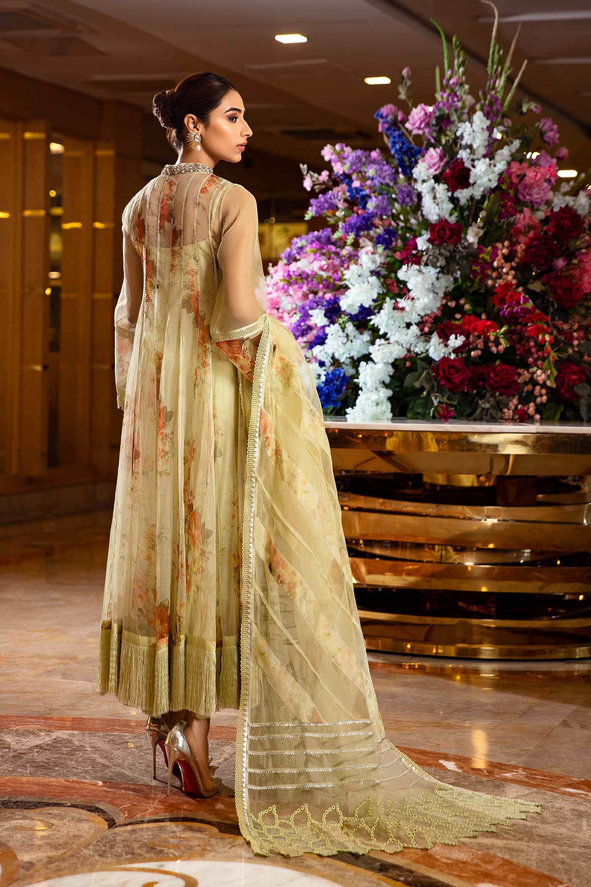 - printed organza shirt - front back and sleeves finished with hand embellishment - neck and tassel lace on border - resham lawn inner separate - embroidered printed organza dupatta finished with laces and stitching details - raw silk straight trouser body length of shirt xs 48,s 48,m 50",l 50"