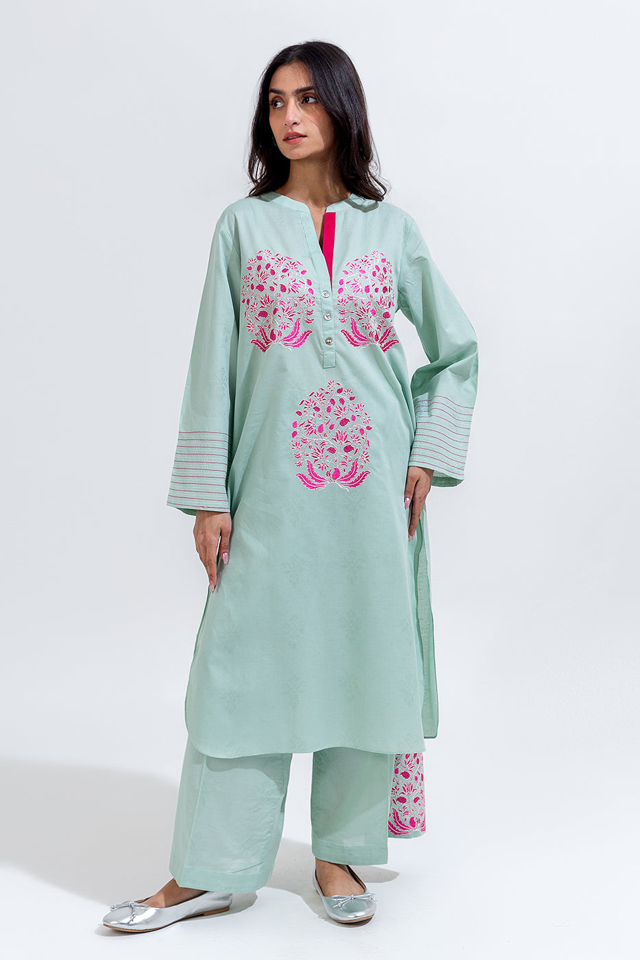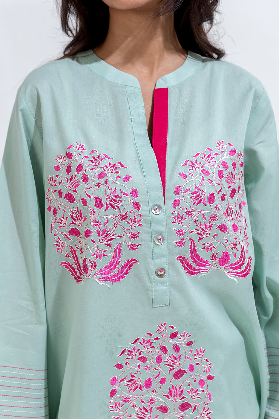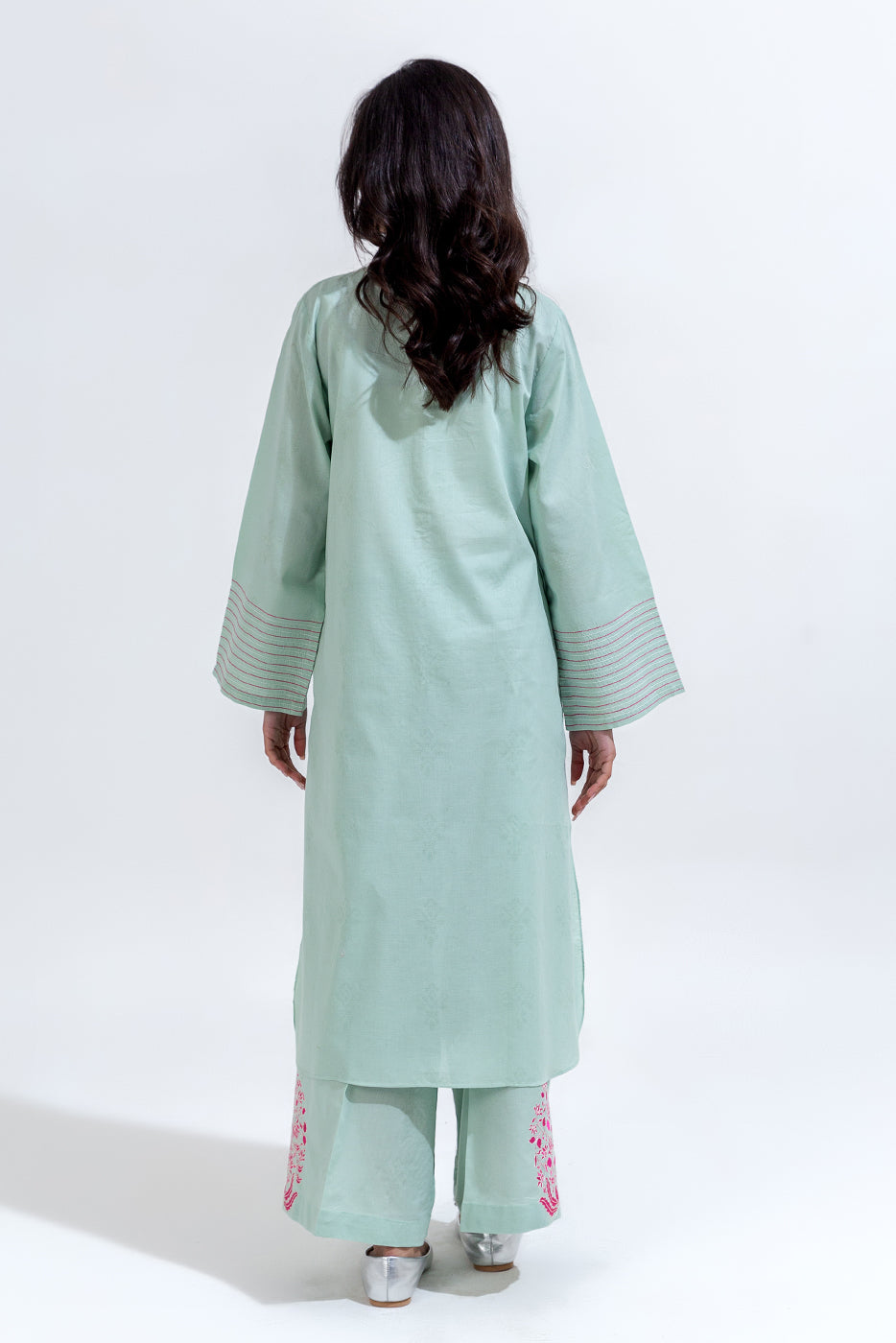 description: 2pc.embroidered shirt with band neckline and placket.button detail on front.top stitches on sleeves.round hem paired with embroidered cullots. fabric: jacquard what you'll get: shirt+pant fit: casual fit size & fit: model height is 5'6" model is wearing 8 size