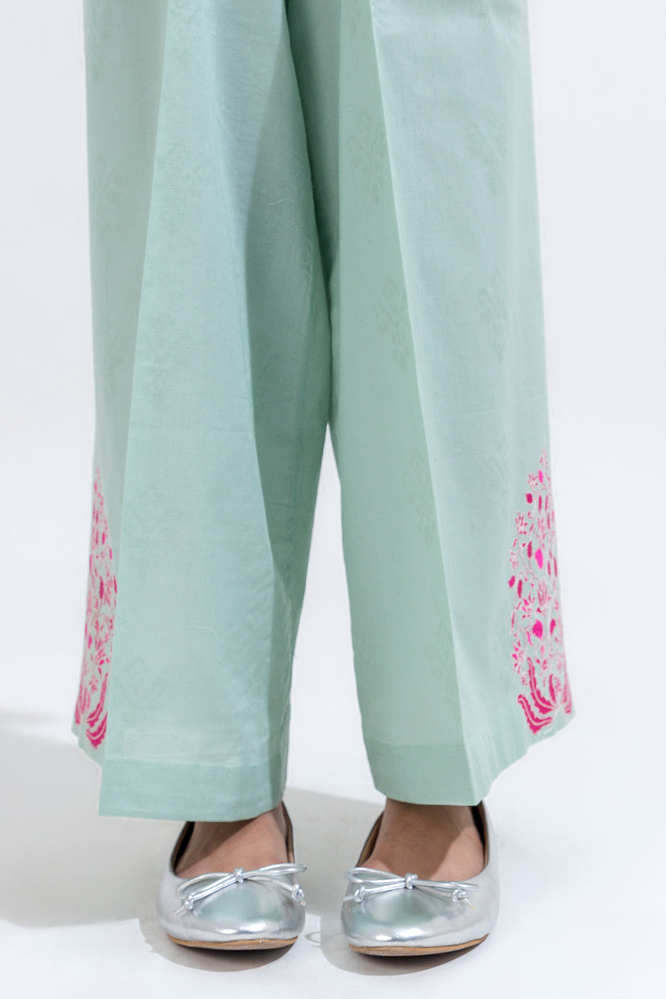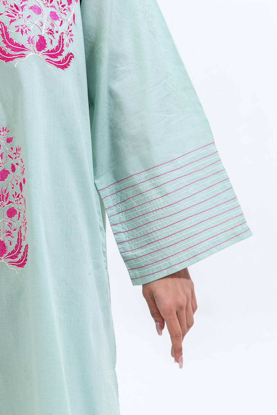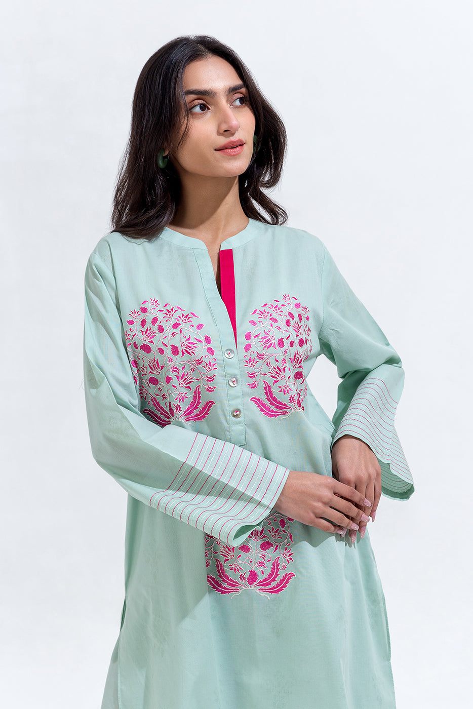 description: 2pc.embroidered shirt with band neckline and placket.button detail on front.top stitches on sleeves.round hem paired with embroidered cullots. fabric: jacquard what you'll get: shirt+pant fit: casual fit size & fit: model height is 5'6" model is wearing 8 size