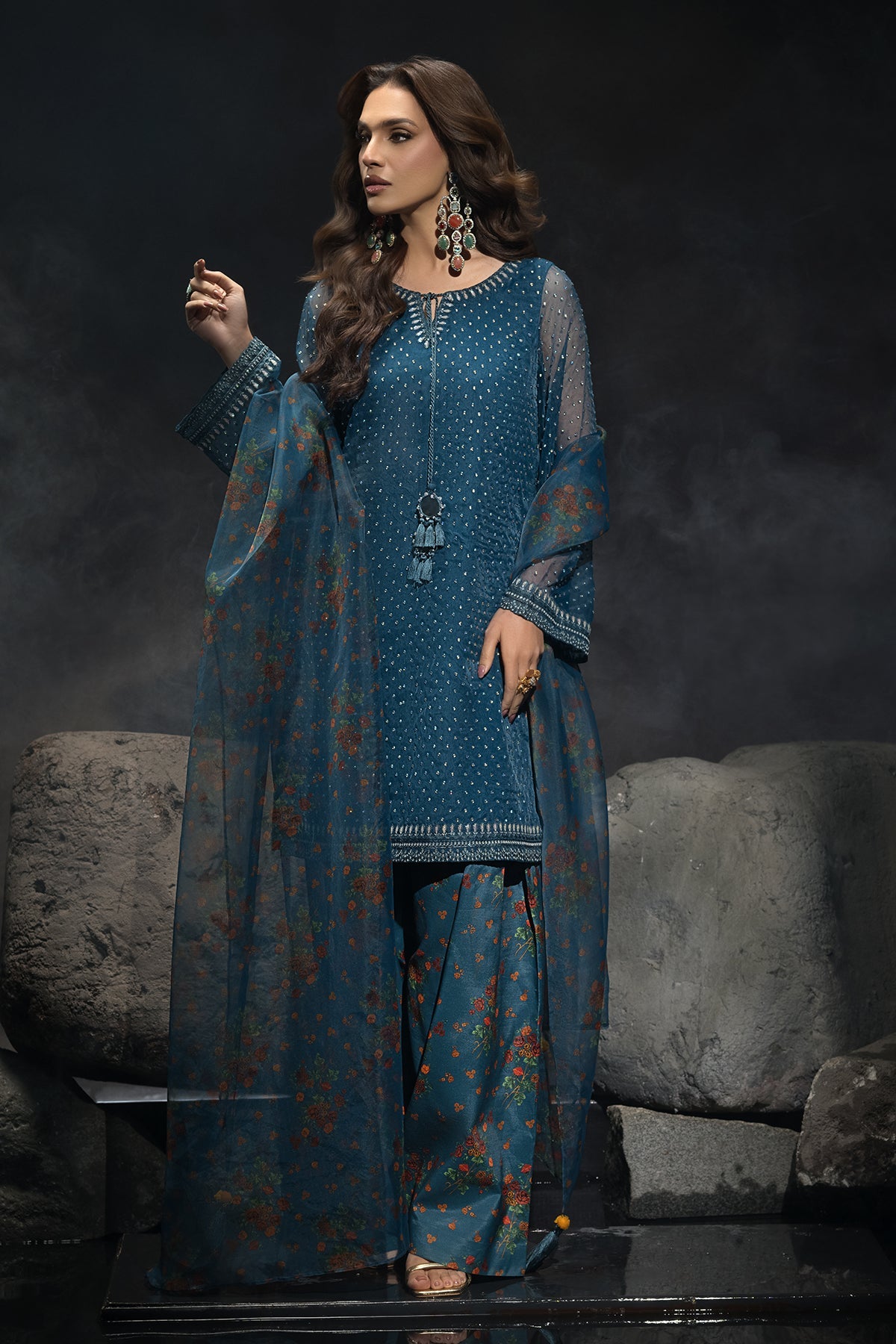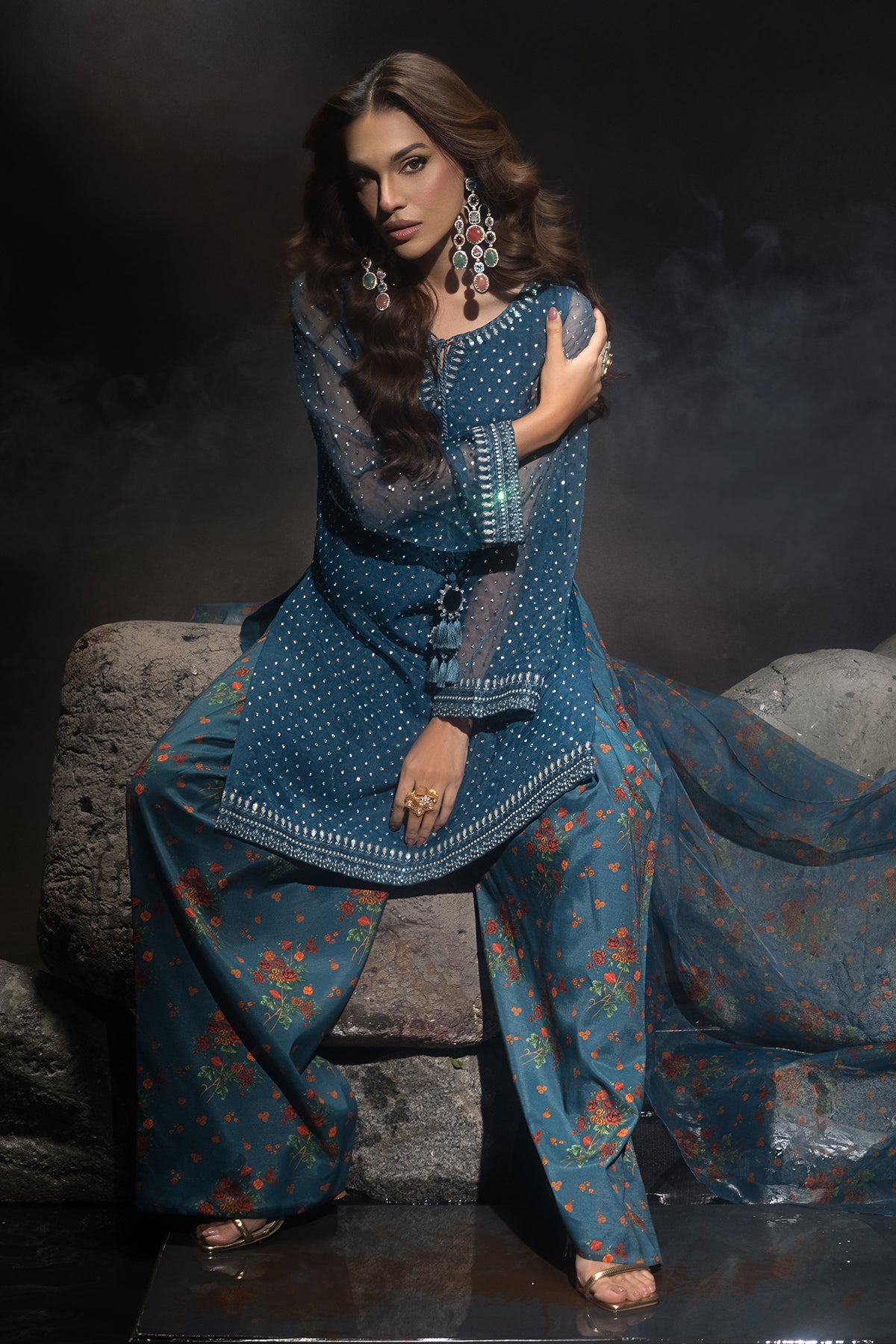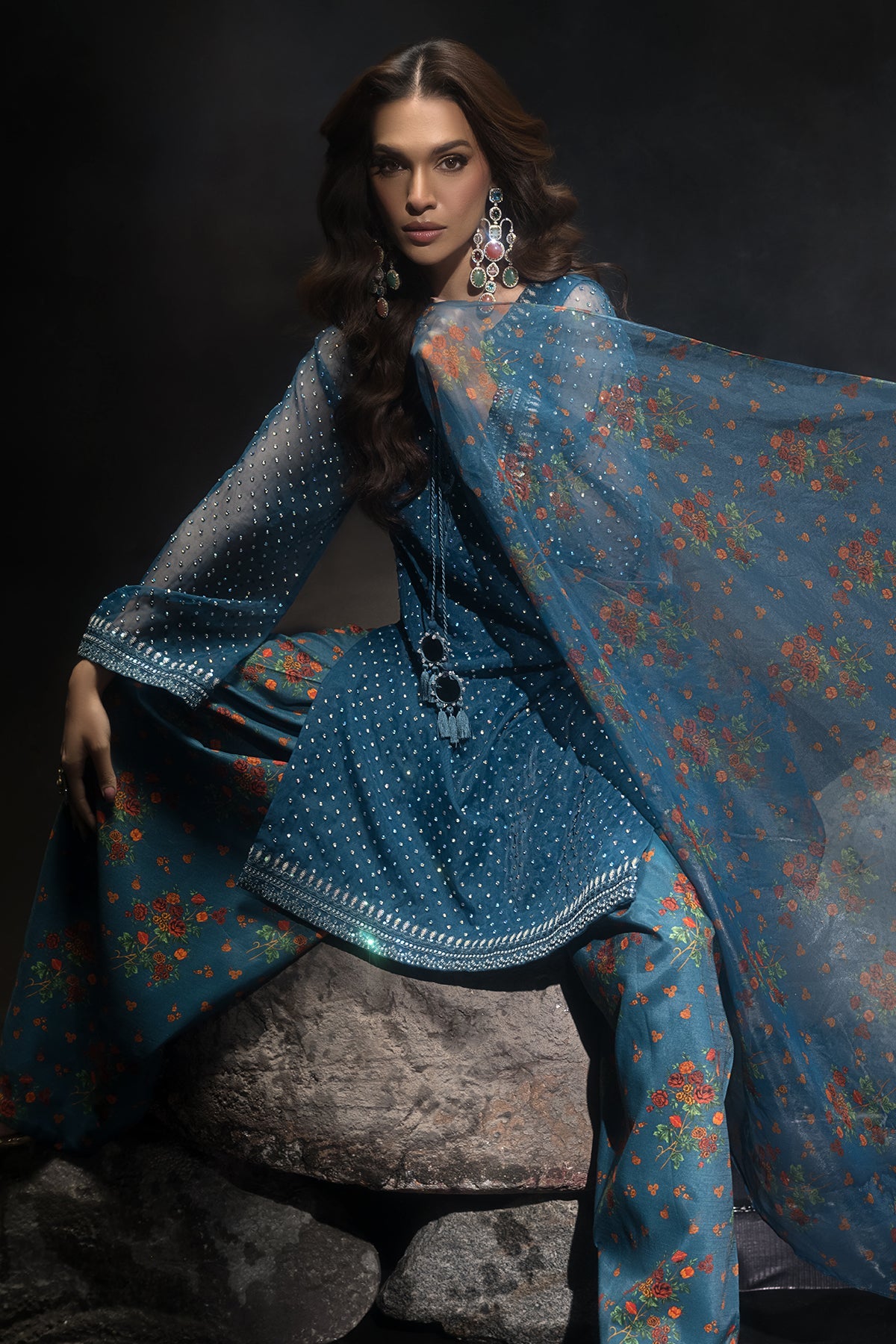 shirt : mukaish organza shirt with embroidered neckline,embroidered back,embroidered sleeves lace and embroidered front back daman lace. raw silk inner shirt. embellished with adda work. finished with stitching detail. shalwar : raw silk printed shalwar. finished with stitching detail. dupatta : organza printed dupatta. size : s m l measurement length (body length) 36" 38" 40" flare/daman width 23" 25" 27"