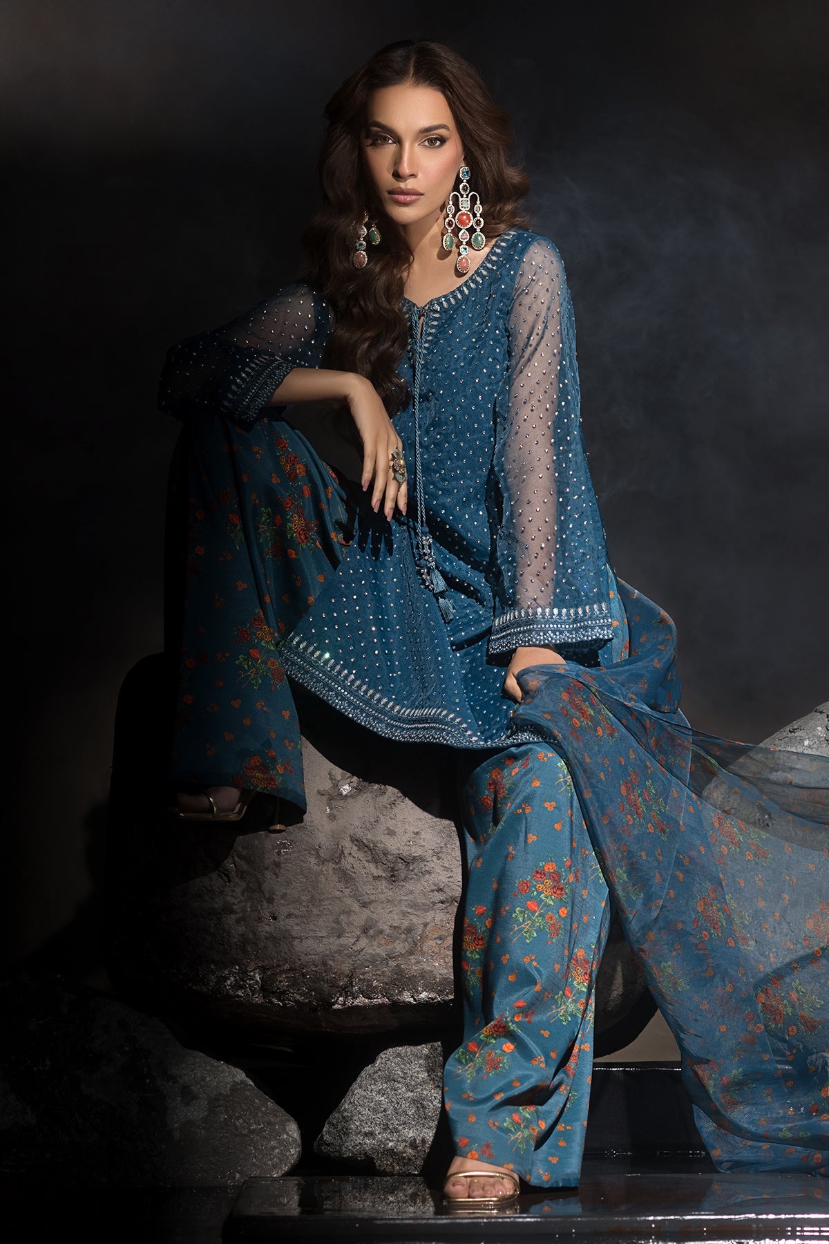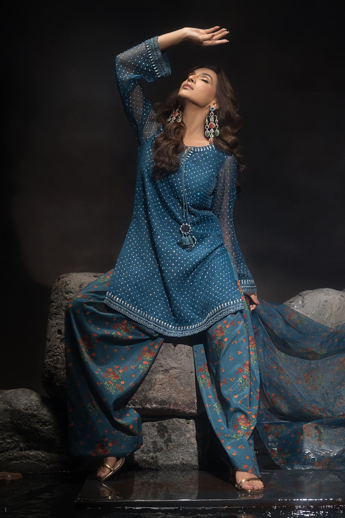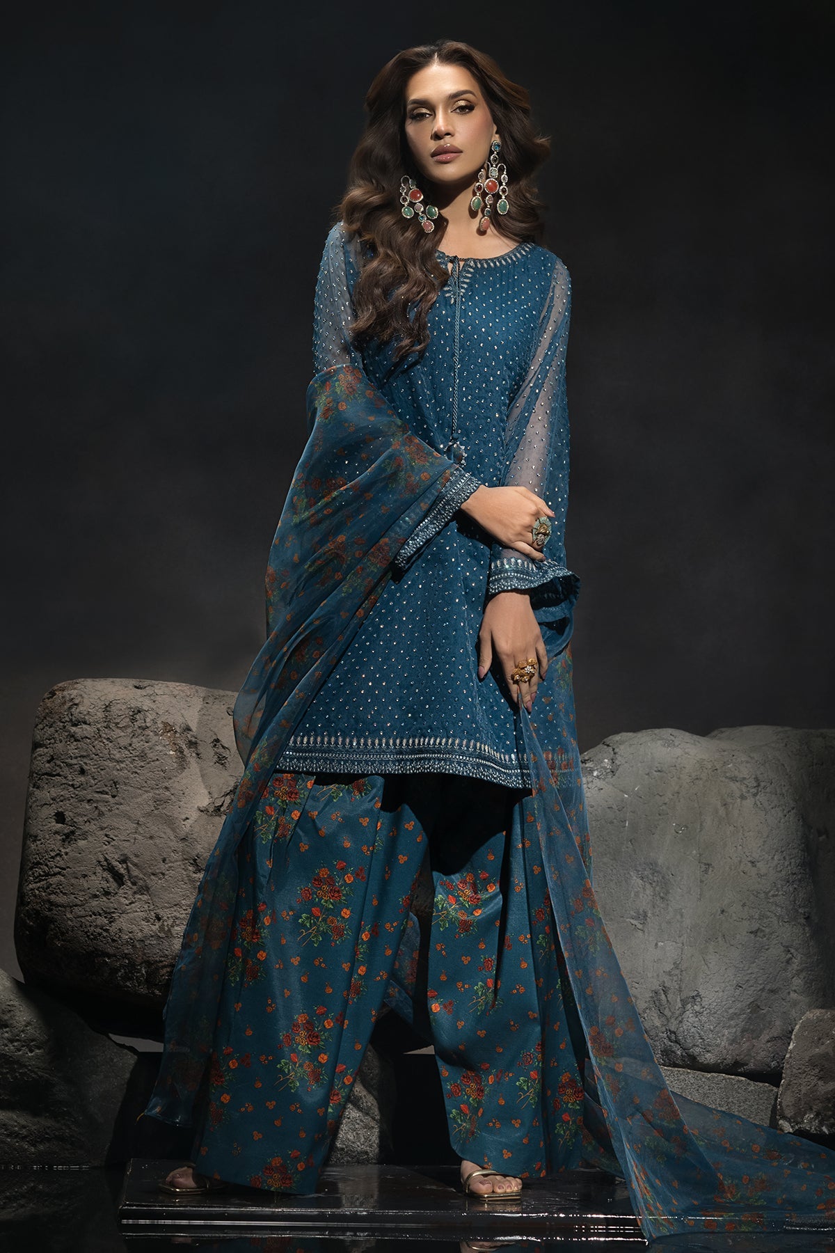 shirt : mukaish organza shirt with embroidered neckline,embroidered back,embroidered sleeves lace and embroidered front back daman lace. raw silk inner shirt. embellished with adda work. finished with stitching detail. shalwar : raw silk printed shalwar. finished with stitching detail. dupatta : organza printed dupatta. size : s m l measurement length (body length) 36" 38" 40" flare/daman width 23" 25" 27"