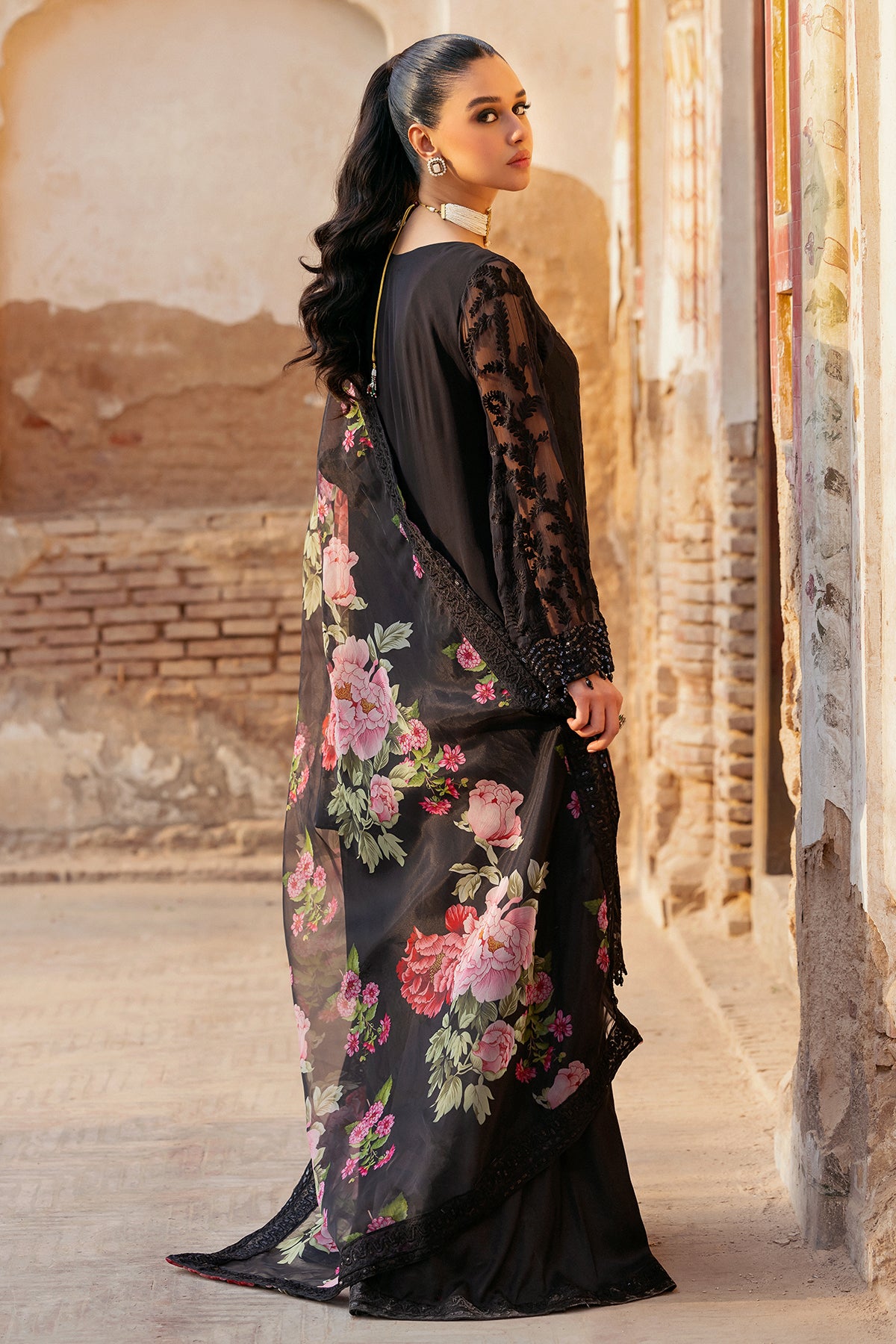 shirt : chiffon shirt with embroidered front panel, embroidered back panel,embroidered sleeves lace and embroidered front back daman lace. raw silk inner shirt. finished with stitching detail. trouser : raw silk trouser with embroidered trouser lace. finished with stitching detail. dupatta : organza printed dupatta with embroidered 4 side dupatta pallu lace." size : s m l measurement length (body length) 43" 45" 47" flare/daman width 26" 28" 30"