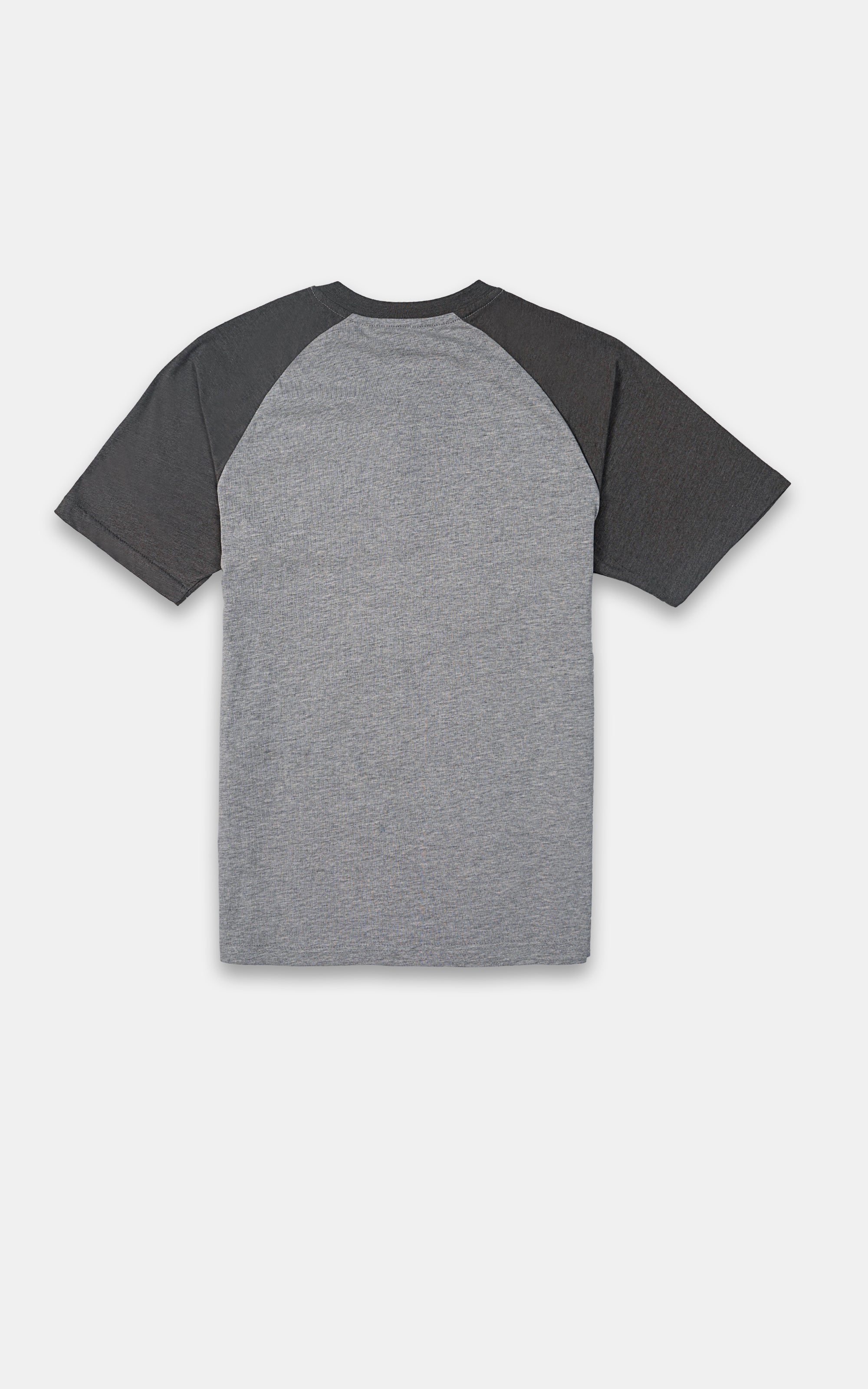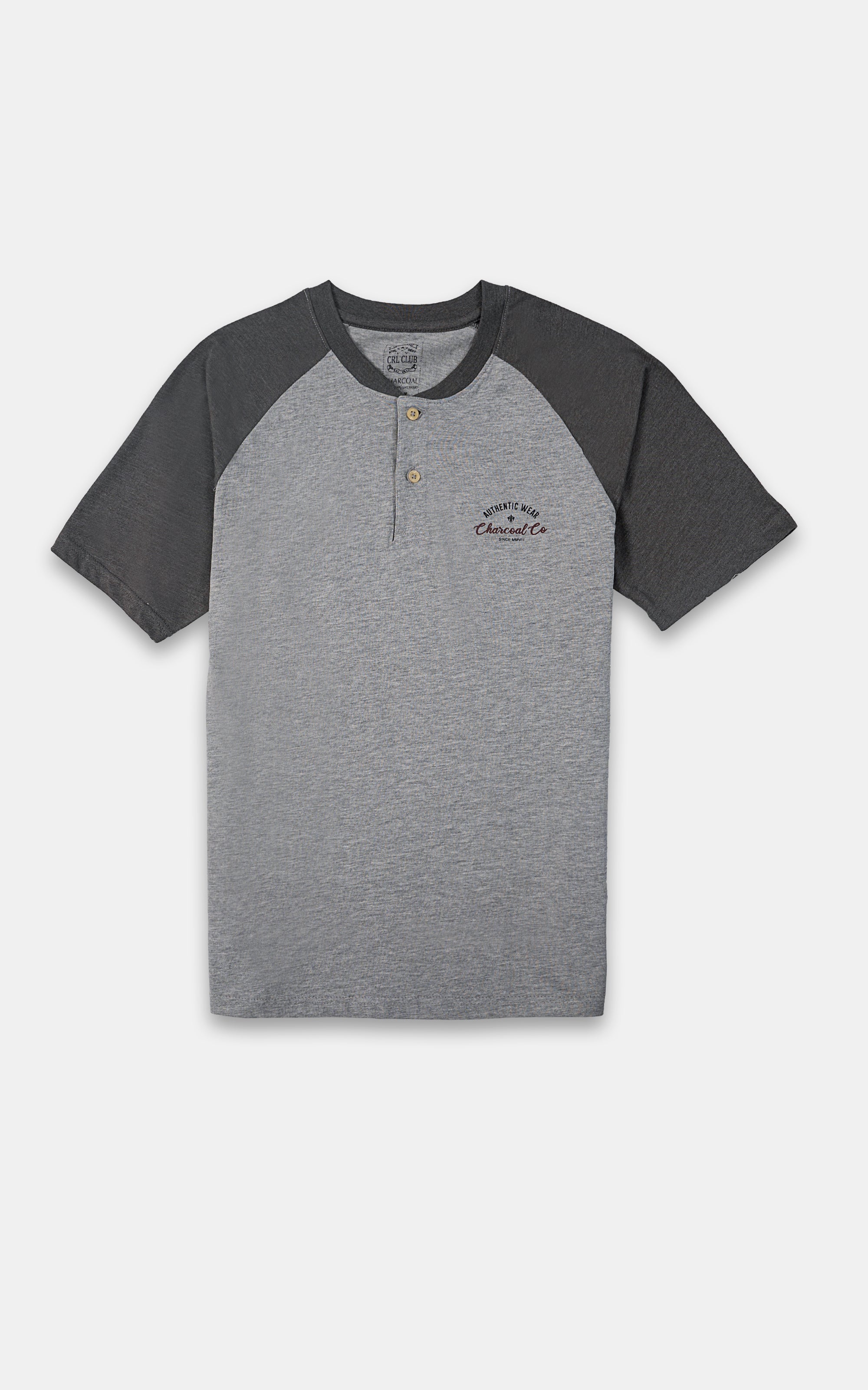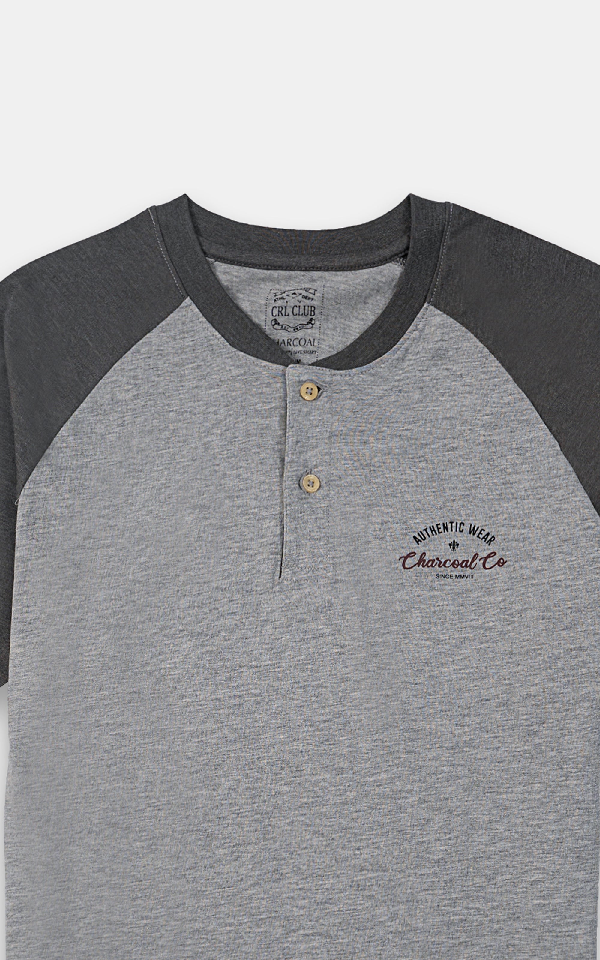 this garment features contrasting elements that catch the eye and add a dynamic edge. a contrasting ban with raglan sleeves in a different hue break away from the norm, creating a modern aesthetic. the button placket stands out with its contrasting trim, adding a touch of sophistication to the design. on the front, a striking print adds personality and visual interest, elevating the overall look. crafted from melange jersey fabric, this t-shirt is not only soft and comfortable but also boasts a textured appearance that adds depth to its visual appeal.