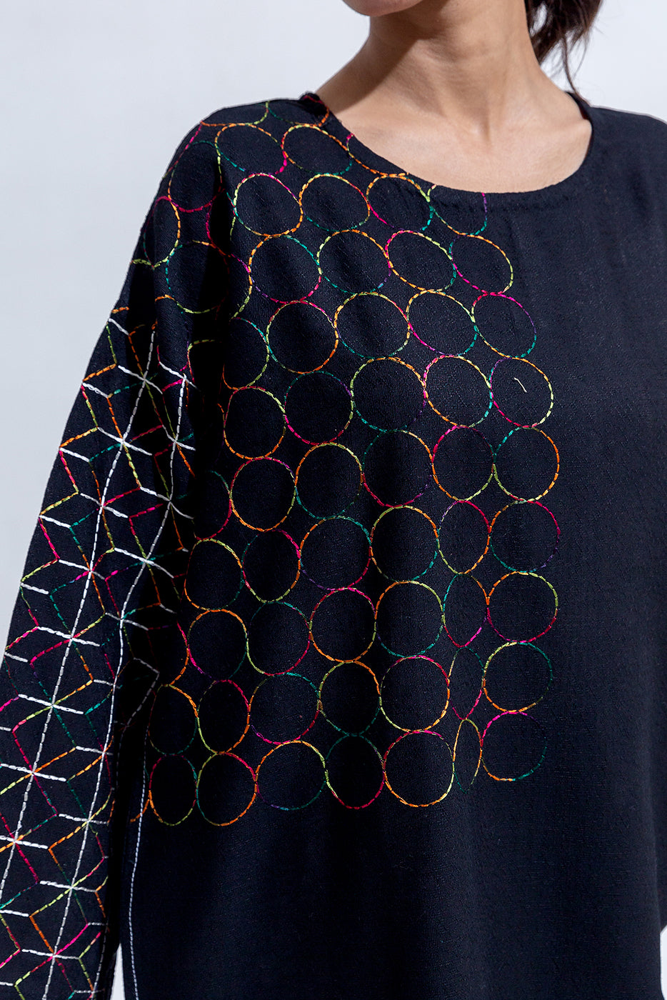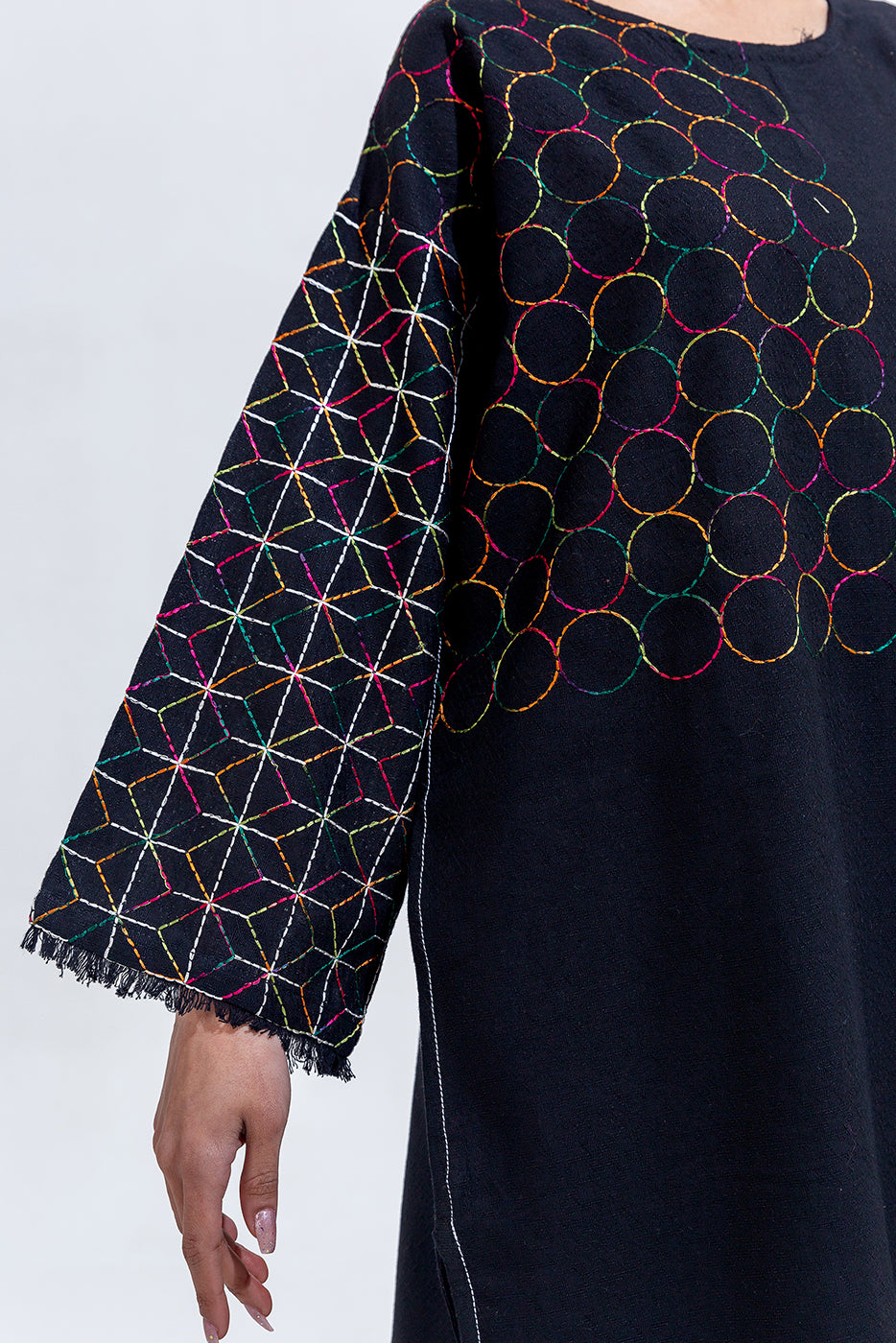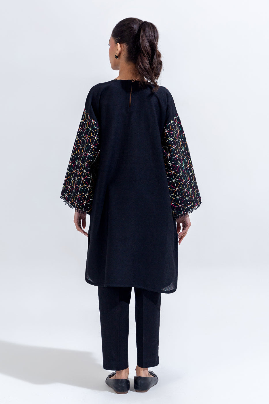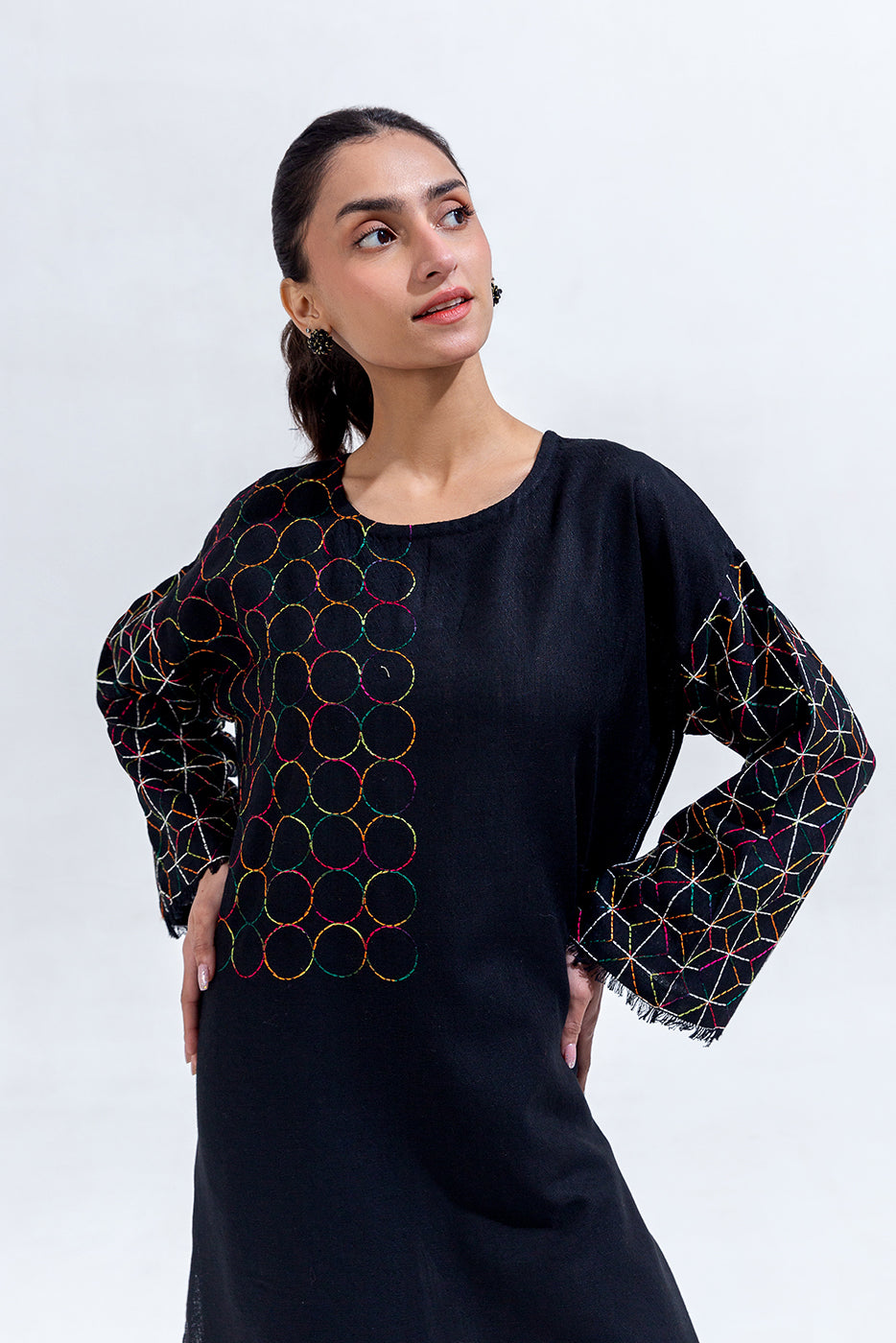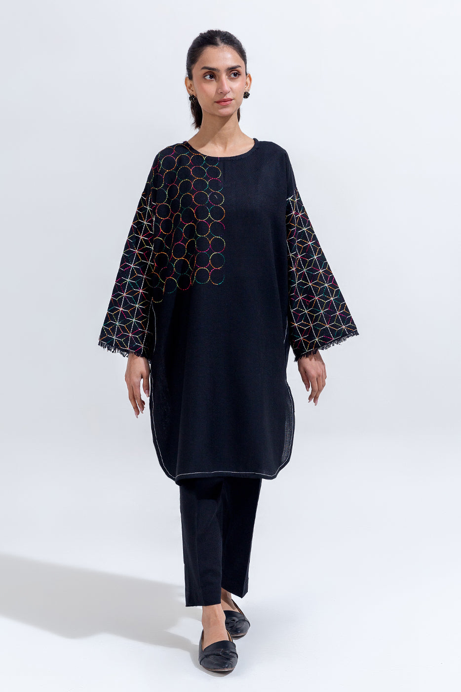 description: embroidered shirt with boat neckline and frayed edging detail on sleeves hem. paired with straight pants to complete the look. fabric: khaddar jacquard what you'll get: shirt+pant fit: casual fit size & fit: model height is 5'6" model is wearing 8 size