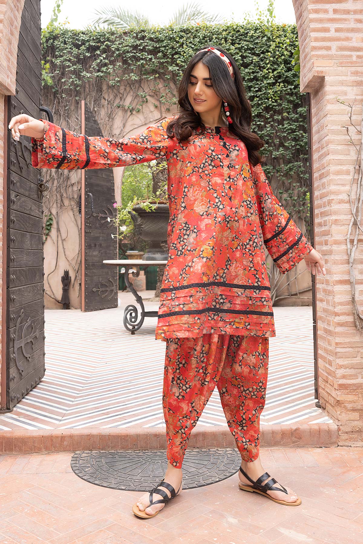 - lawn digital printed shirt - finishing of lace & printed lawn fabric as facing - chok finishing daman used with fabric lace and sleeves finished with fabric lace. - lawn printed trouser measurement length 36" 36" 38" 38" flare/ daman width 26 26 26 26