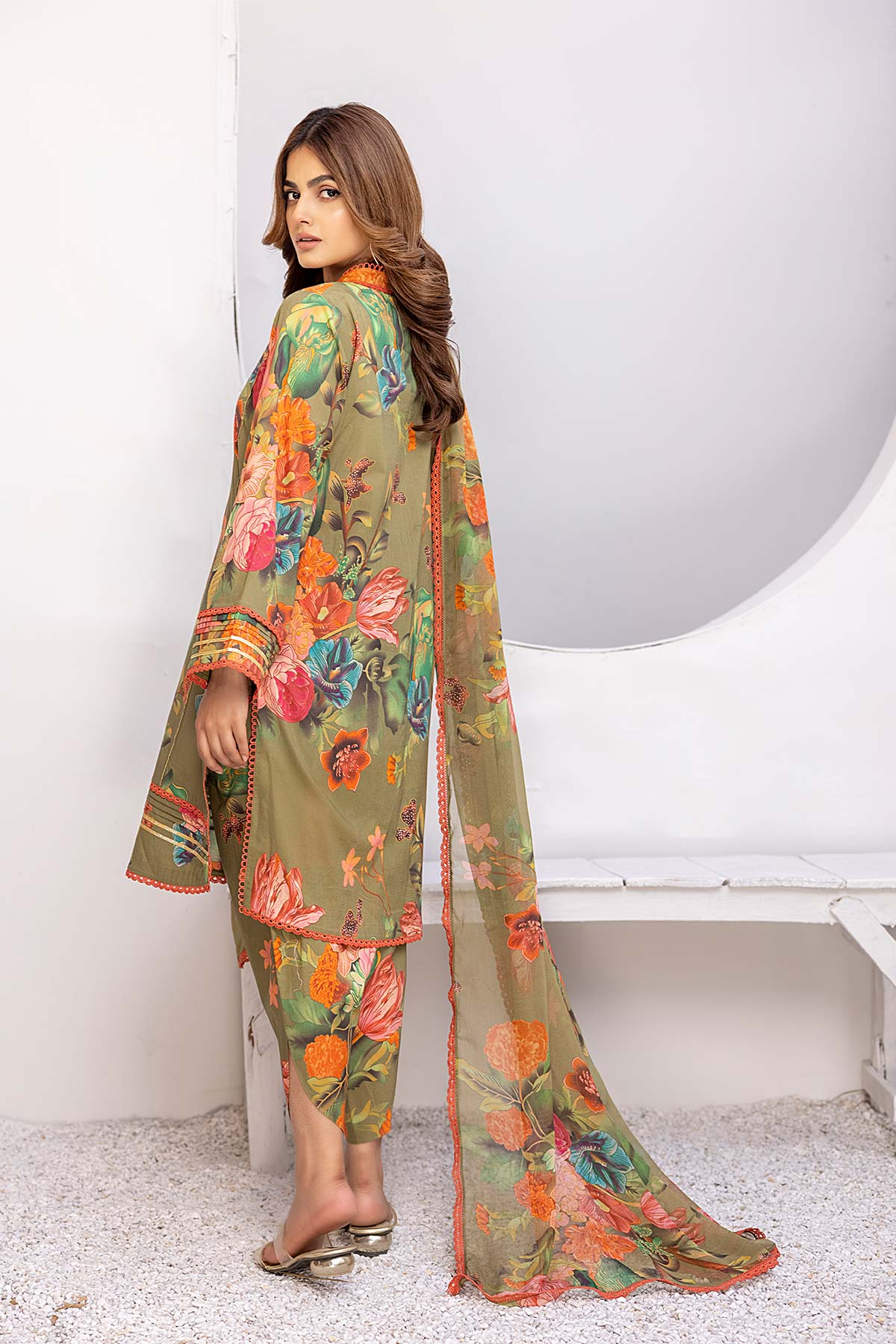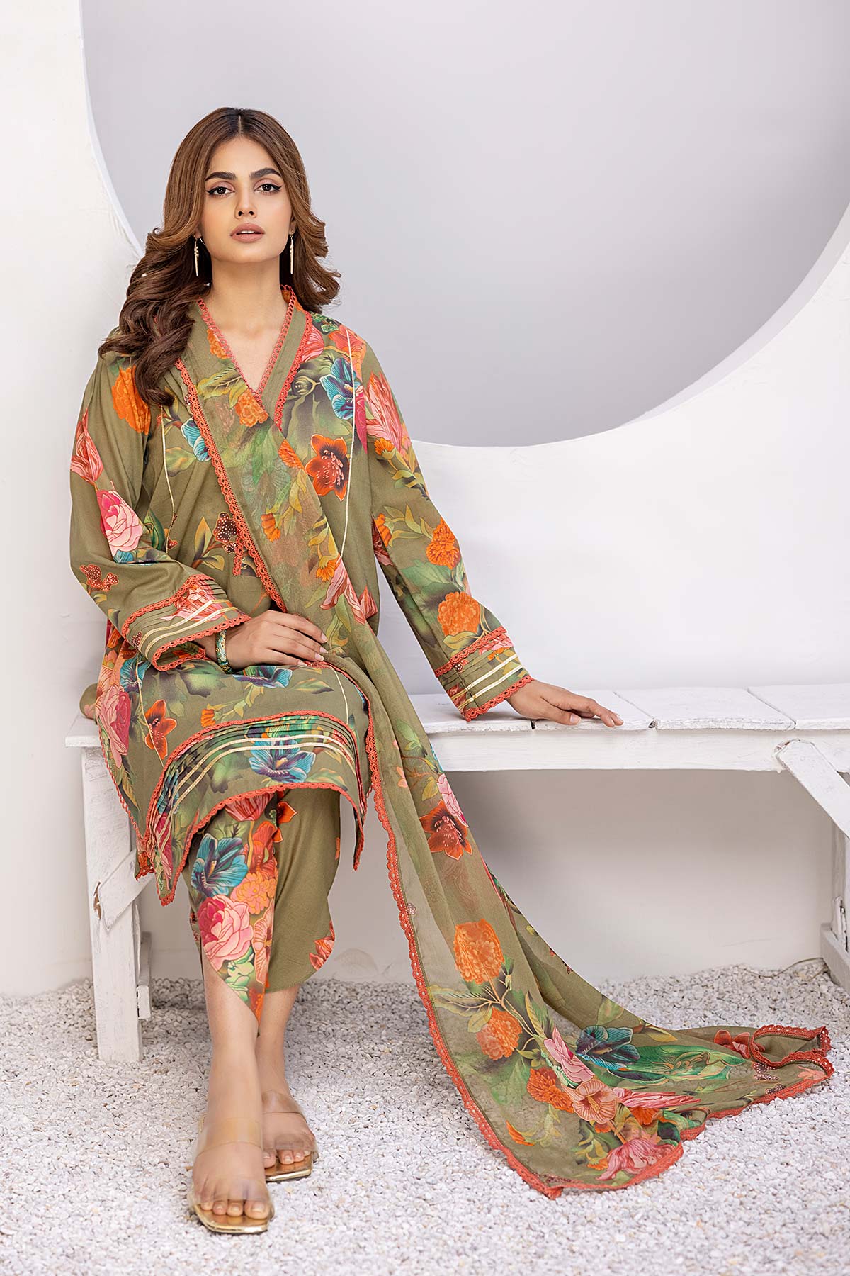 - digital lawn olive floral printed shirt - finished with laces and fashion of printed fabric on sleeves and neckline and daman - printed floral lawn tulip trouser - floral printed bamber chiffon dupatta finished with 4 side lace measurement length 36" 36" 38" 38" flare/ daman width 26" 26" 28" 28"