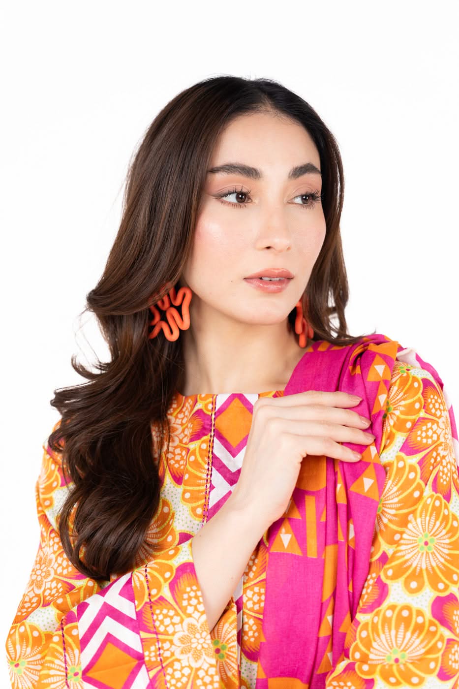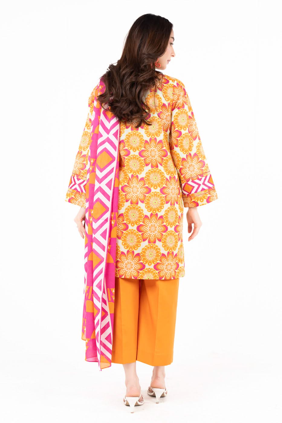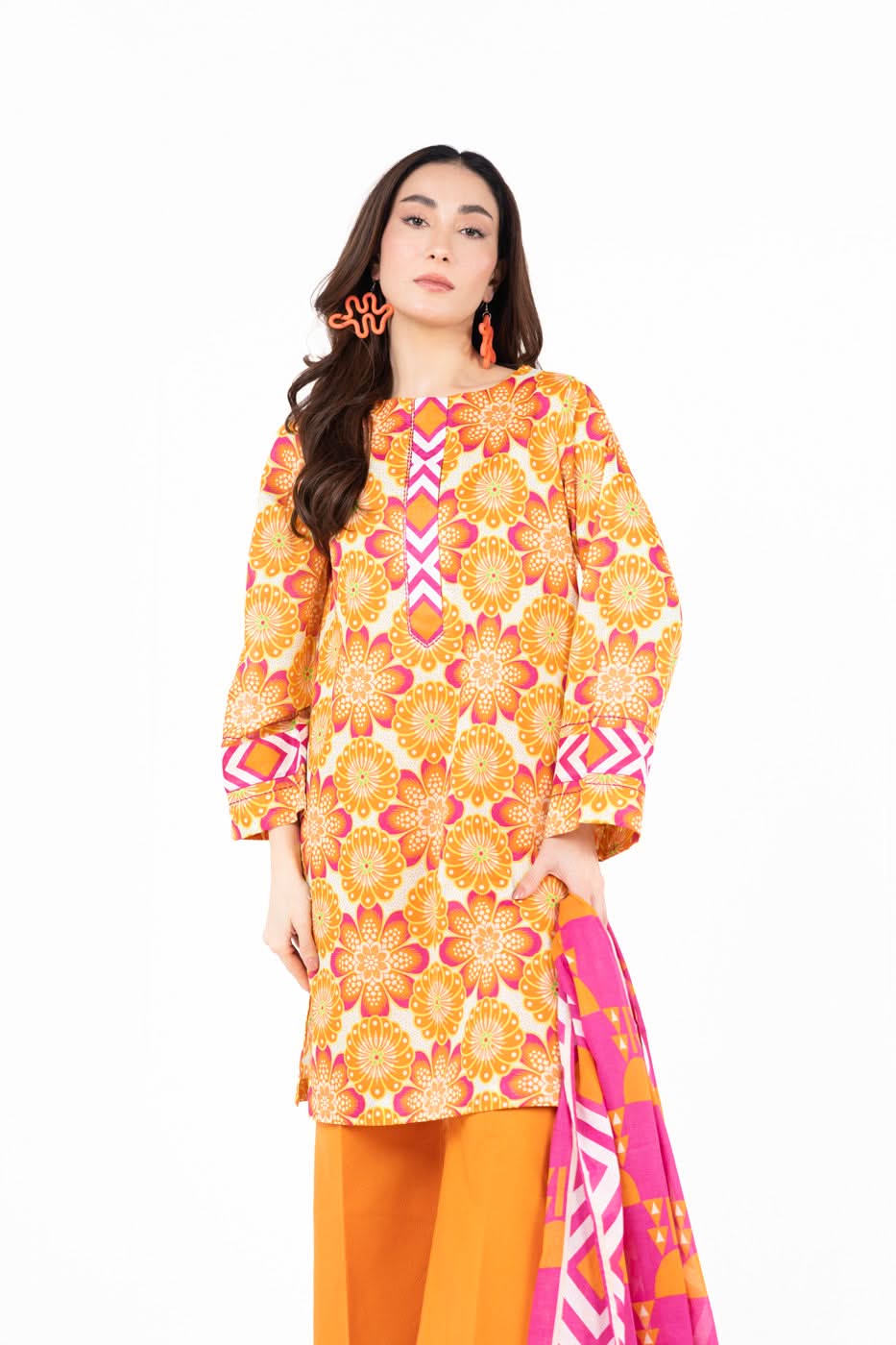 unstitched 3-piece printed lawn suit with printed lawn dupatta color: orange shirt:: printed lawn shirt 3 meters fabric: lawn dupatta:: printed lawn dupatta 2.5 meters fabric: lawn trouser: : dyed cambric trouser 2.5 meters fabric: cambric disclaimer: due to the difference in lighting used during photoshoots, the color or texture of the actual product may slightly vary from the image.