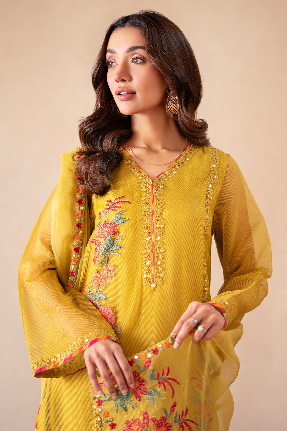 shirt: cotton net shirt with embroidered neckline,embroidered motifs and embroidered sleeves lace. raw silk inner shirt. finished with stitching detail. embellished with patch work. trouser: raw silk trouser with embroidered trouser lace. finished with stitching detail. dupatta: organza dupatta with embroidered 4 side dupatta pallu lace." size : s m l measurement length (body length) 41" 43" 45" flare/daman width 27" 29" 29"