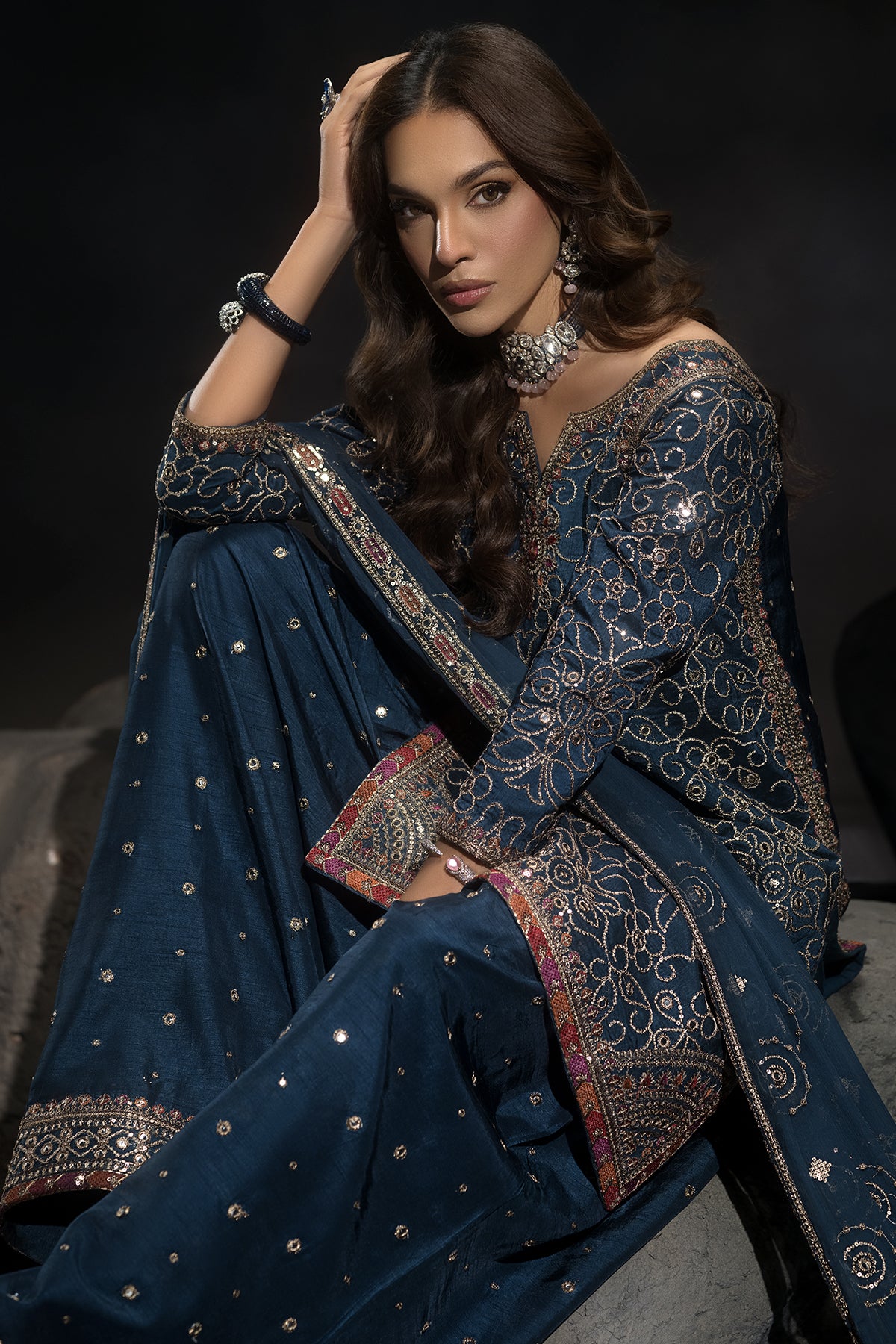 shirt : raw silk shirt with embroidered front jaal with patched multicolour embroidery on neck and daman along with intricate motifs. embroidered sleeves jaal with multicolour embroidery on sleeves edging and armhole. embroidered back spray along with multicolour embroidery patched intricately on daman and chalks. raw silk inner lining attached. finished with stitching detail. shalwar : raw silk shalwar with all over spray embroidery with multicolour embroidered border on pehncha. finished with stitching detail. dupatta : chiffon heavy embroidered dupatta with 4 side dupatta pallu intricate multicolour embroidery. size : s m l measurement length (body length) 35" 37" 39" flare/daman width 22.5" 24.5" 26.5"