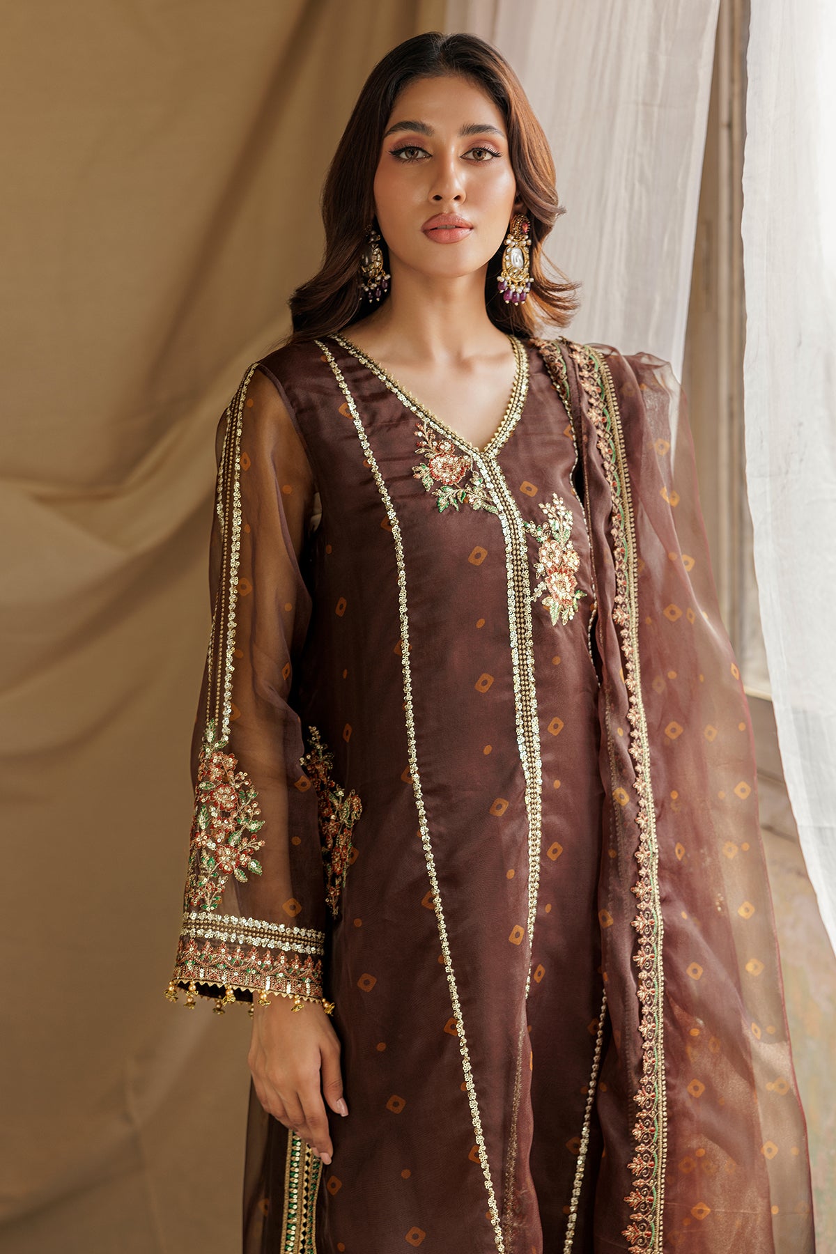 shirt : organza printed shirt with embroidered front,embroidered sleeves, embroidered front back chok daman lace. raw silk inner shirt. finished with stitching detail. trosuer : raw silk trouser.finished with stitching detail. dupatta : organza printed dupatta with embroidered 4 side dupatta pallu lace. size : s m l measurement length (body length) 44" 46" 48" flare/daman width 26" 28" 30"