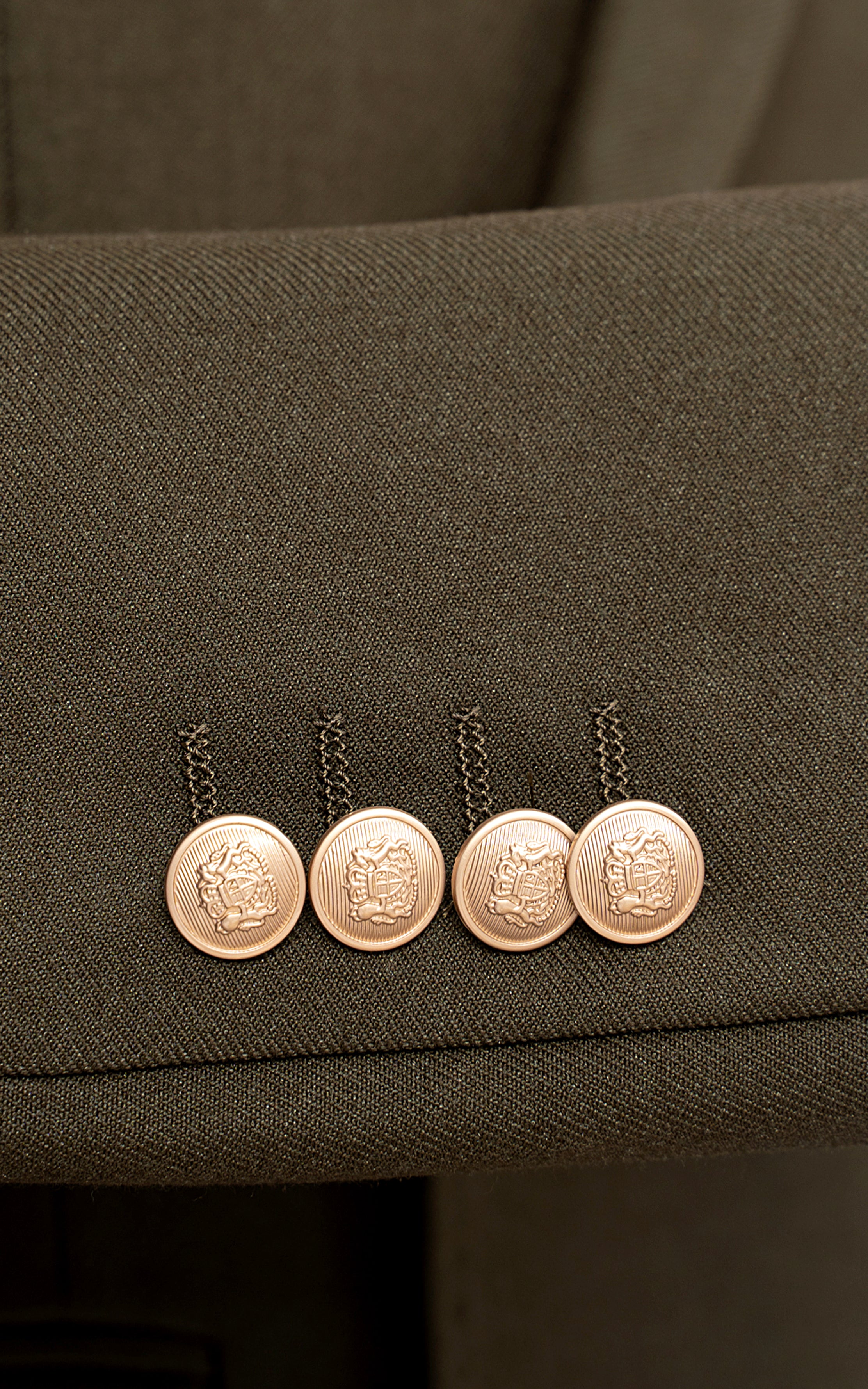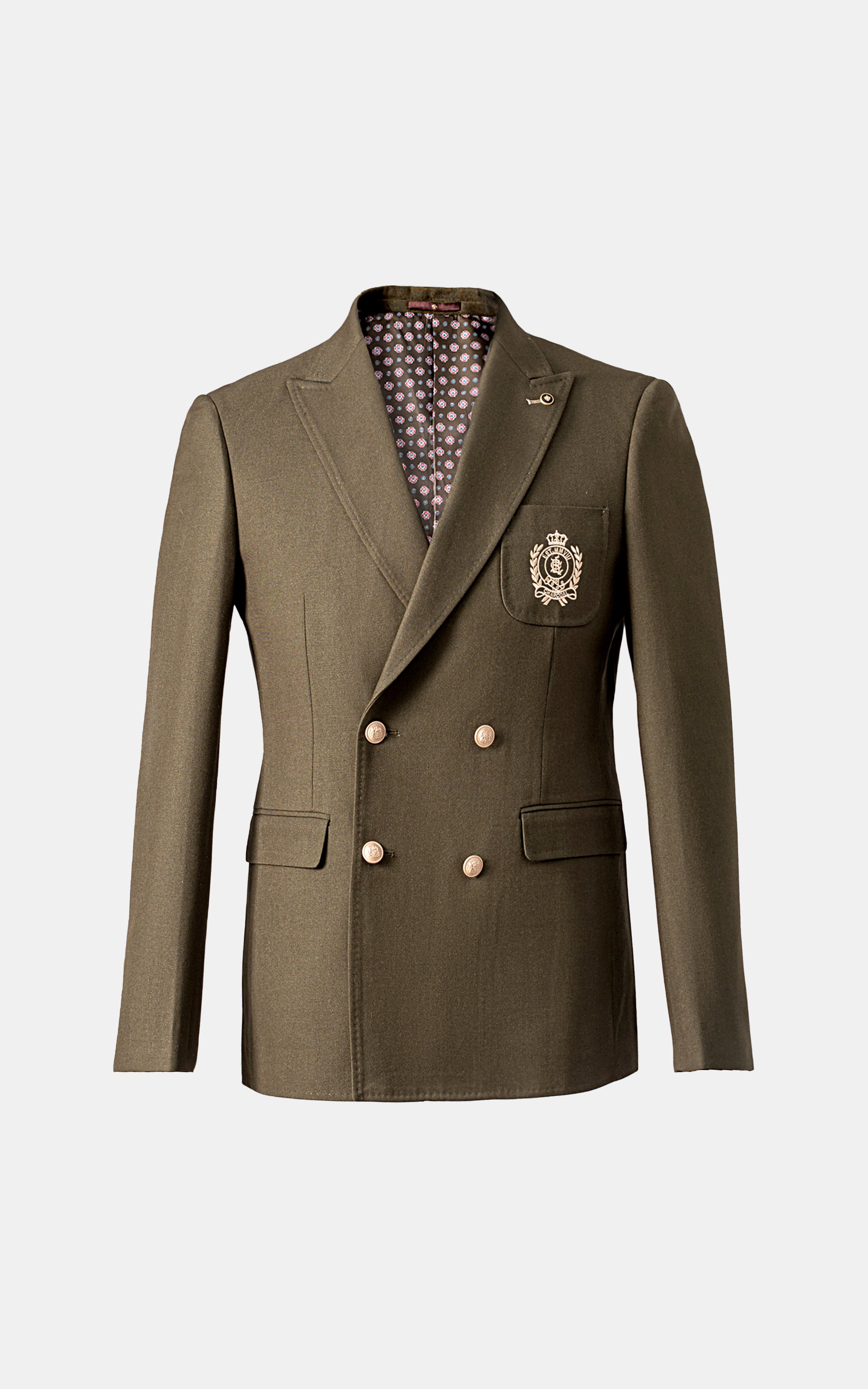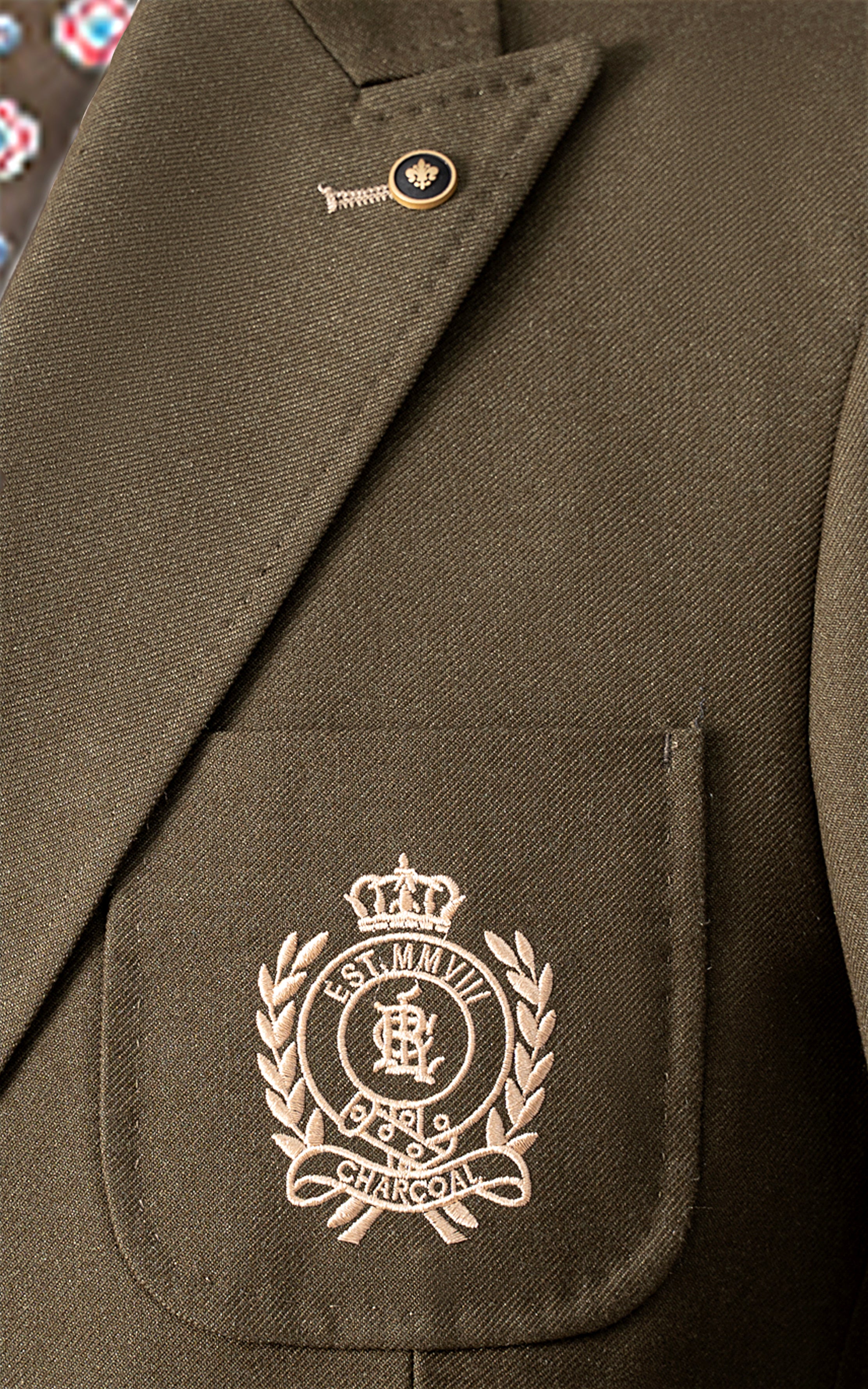 our double-breasted coat, a perfect blend of classic style and modern sophistication of poly-viscose blended fabric crafted with attention to detail, this coat features a one-and-a-half breast construction, styled with sharp peak lapels and patch pockets for a refined look. the coat is equipped with a button closure and front chest welt pocket, providing both function and elegance. designed with two side vents at the back for enhanced movement and comfort, it also showcases four decorative signature buttons on the sleeves. the embroidered charcoal logo adds a touch of exclusivity, while the inner silk printed lining offers a luxurious finish. this coat is the epitome of timeless style and impeccable craftsmanship.