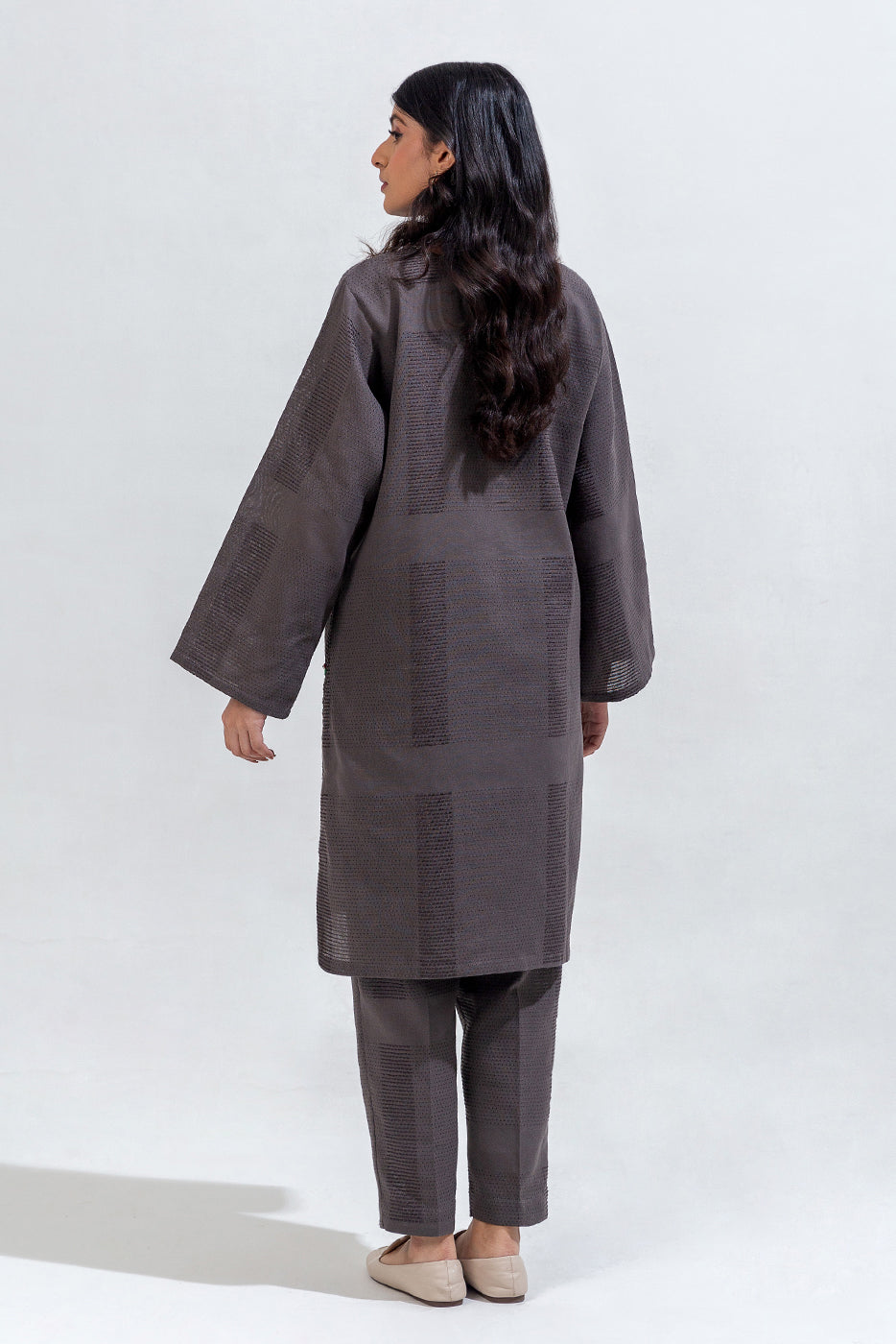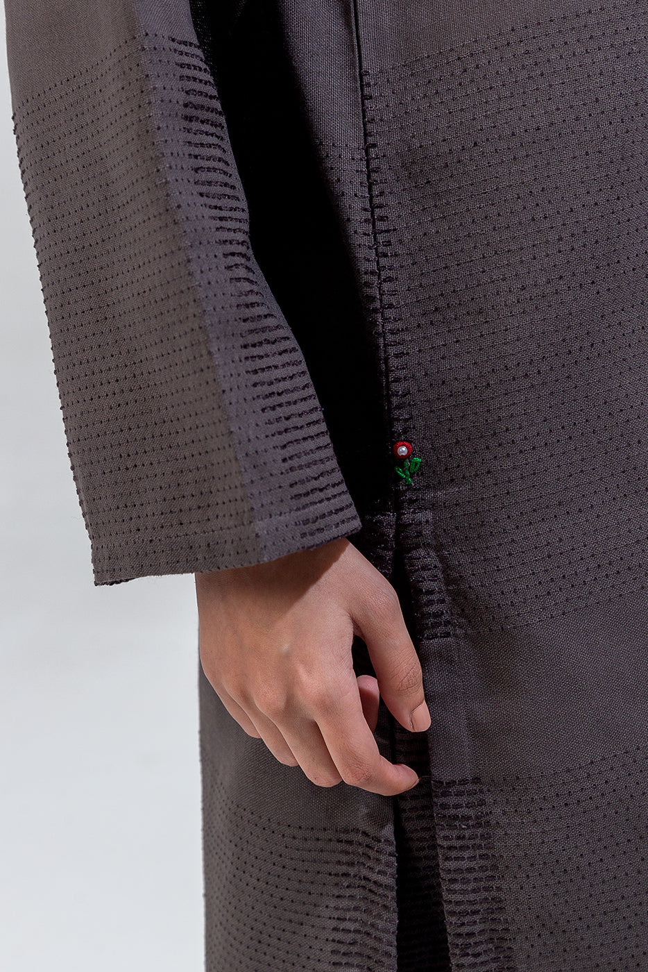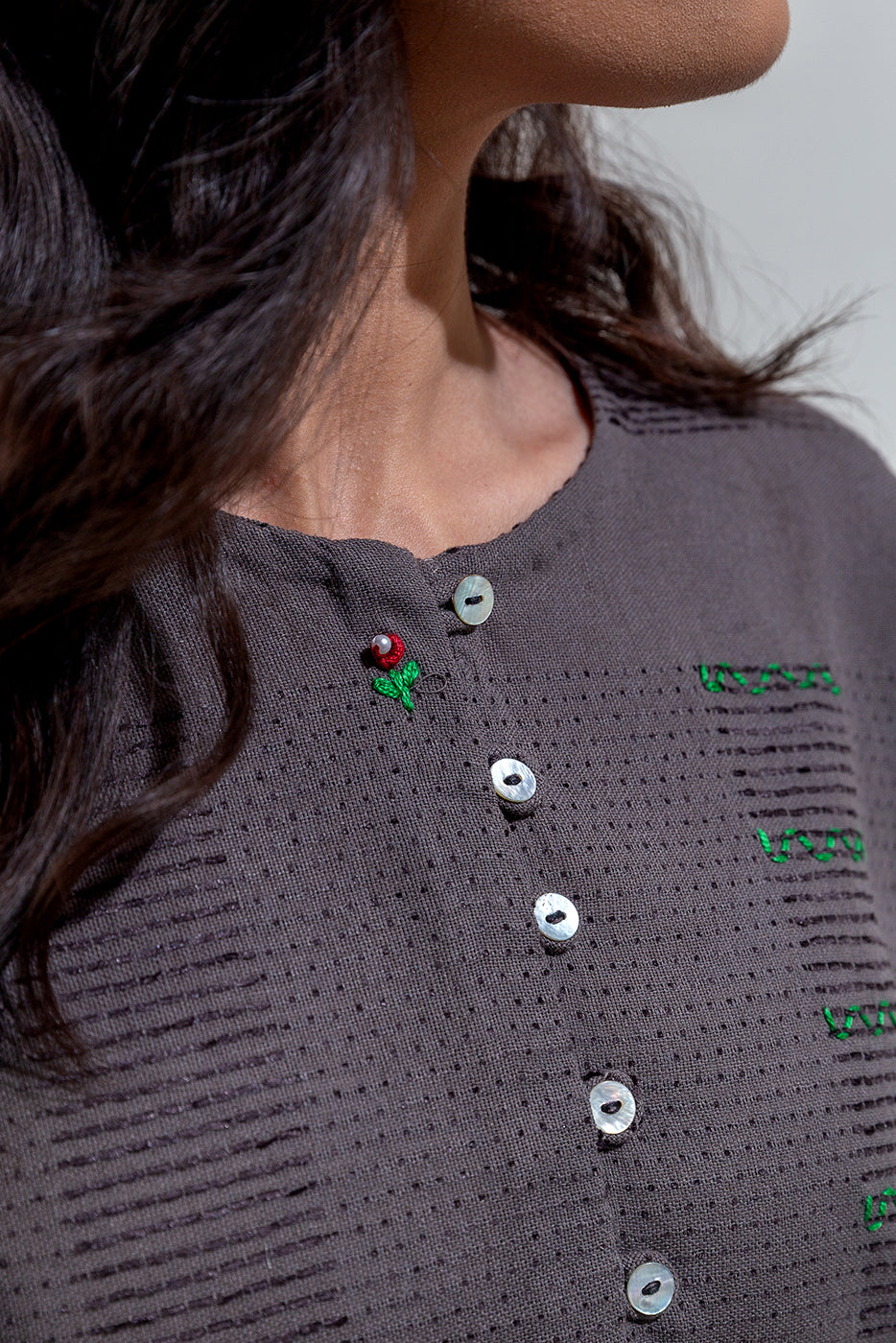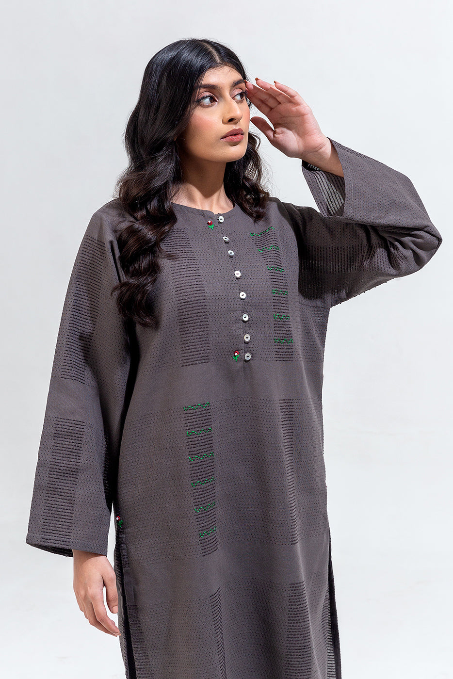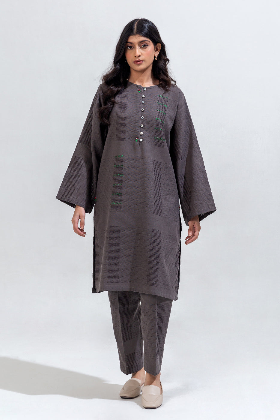 description: basic coord set with round neckline and placket with button detail, and contrasting stitch hand embroidery detail on front. paired with straight pants to complete the look. fabric: yarn dyed what you'll get: shirt+pant fit: casual fit size & fit: model height is 5'6" model is wearing 8 size