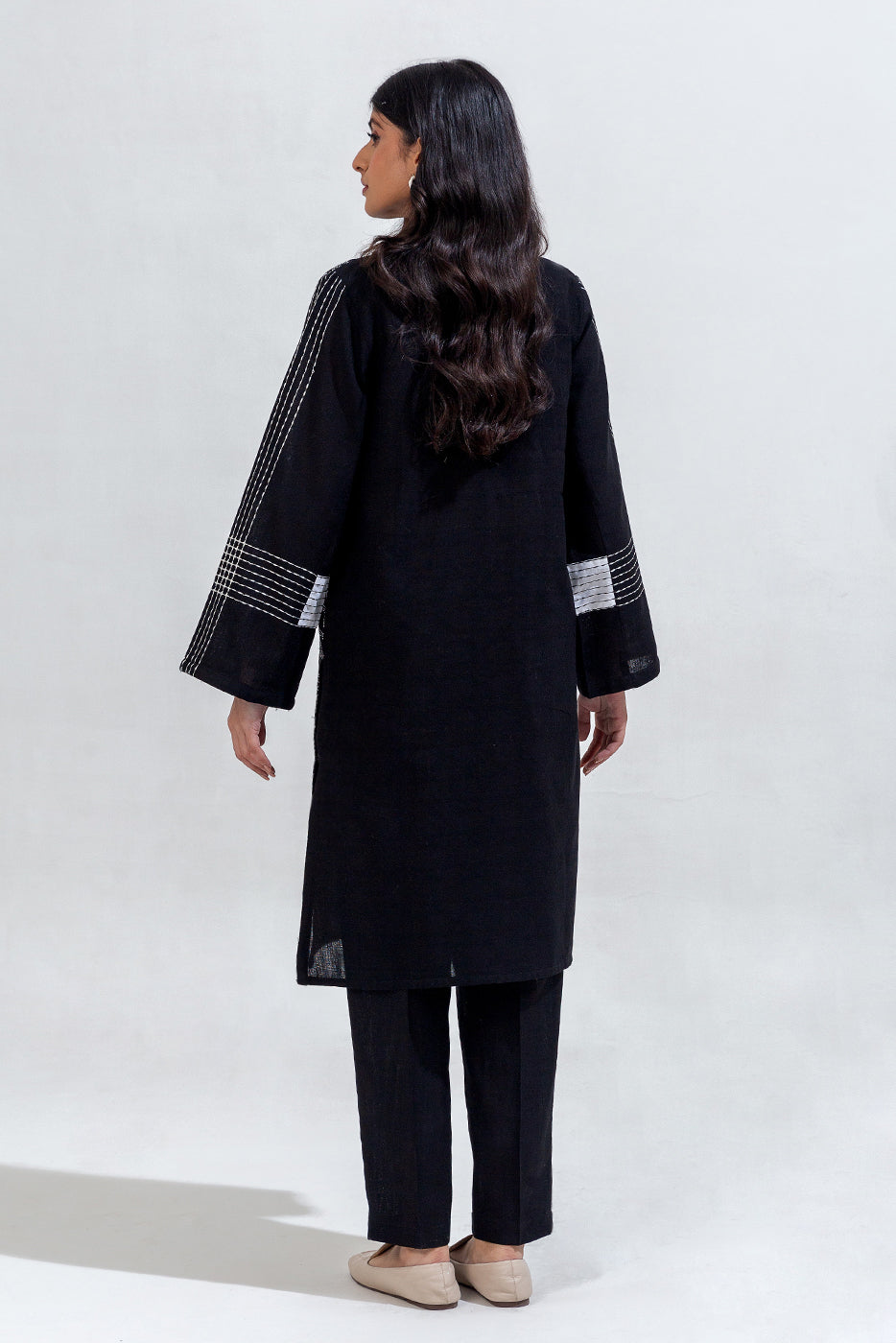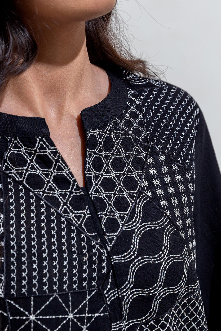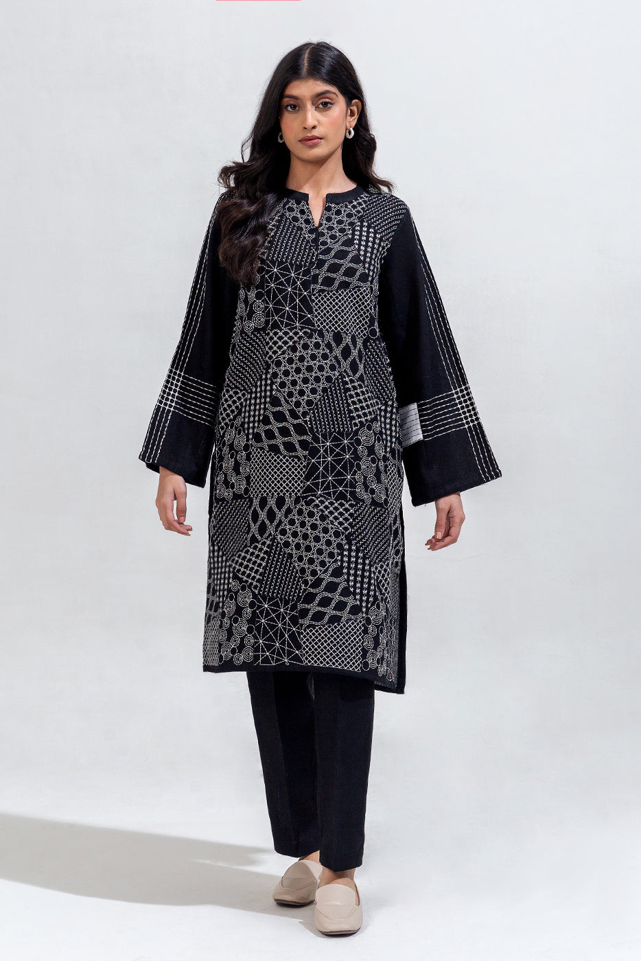 description: embroiderd two peice set, regular fit shirt having embroidery and patchwork on front and sleeves paired with straight fit pants, fabric: khaddar jacquard what you'll get: shirt+pant fit: casual fit size & fit: model height is 5'6" model is wearing 8 size